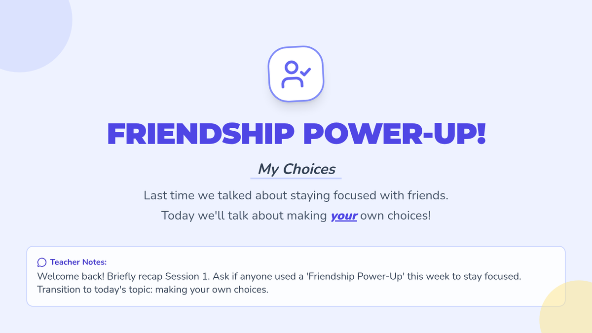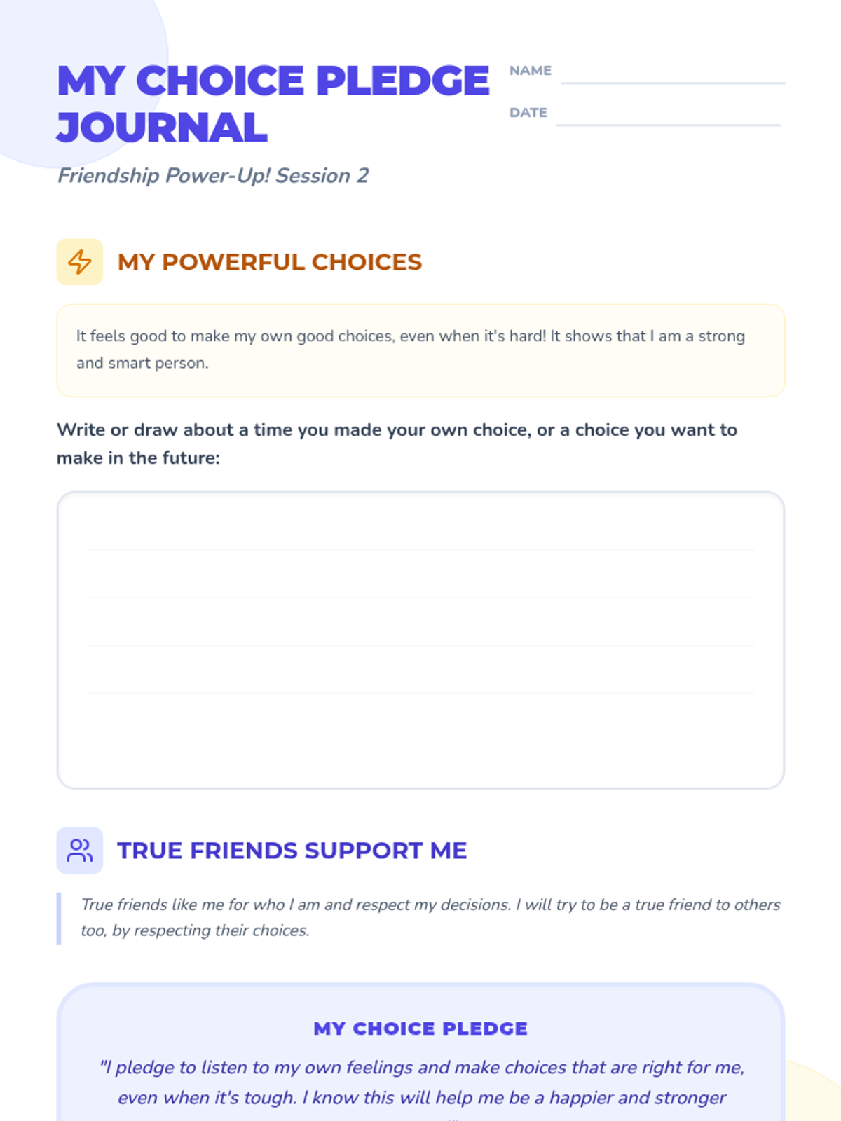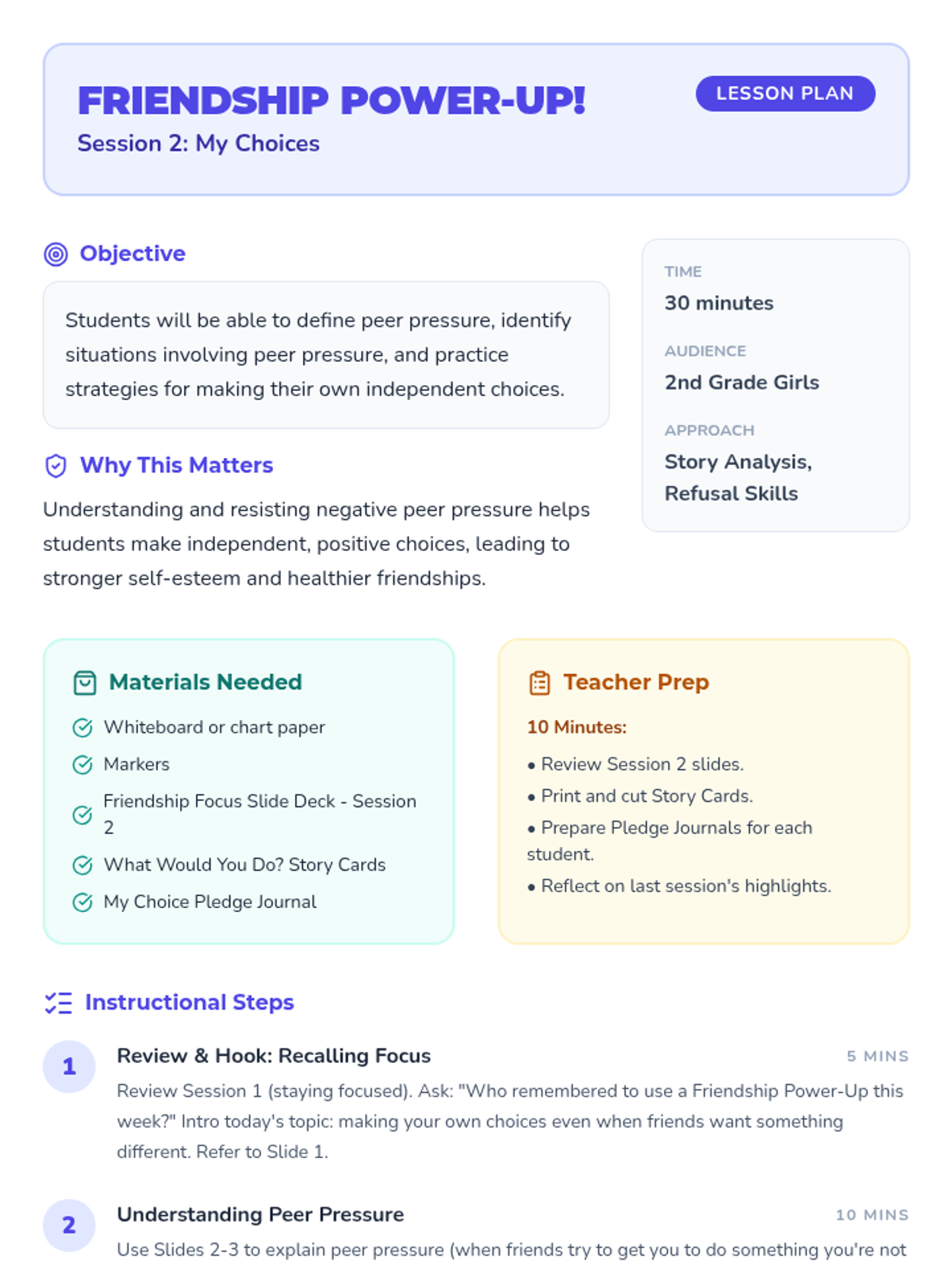 A two-session Tier 2 small group intervention for 2nd-grade girls focused on strengthening friendships through focus and resisting peer pressure.