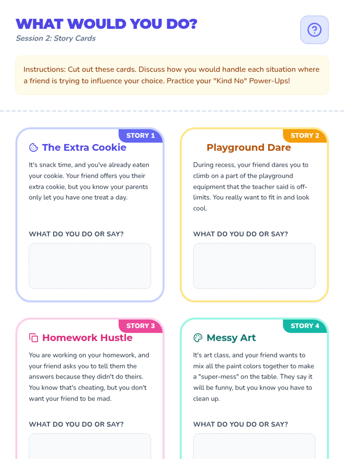 A comprehensive 4-day small group program focusing on essential social-emotional skills including emotional regulation, active listening, friendship building, and conflict resolution.