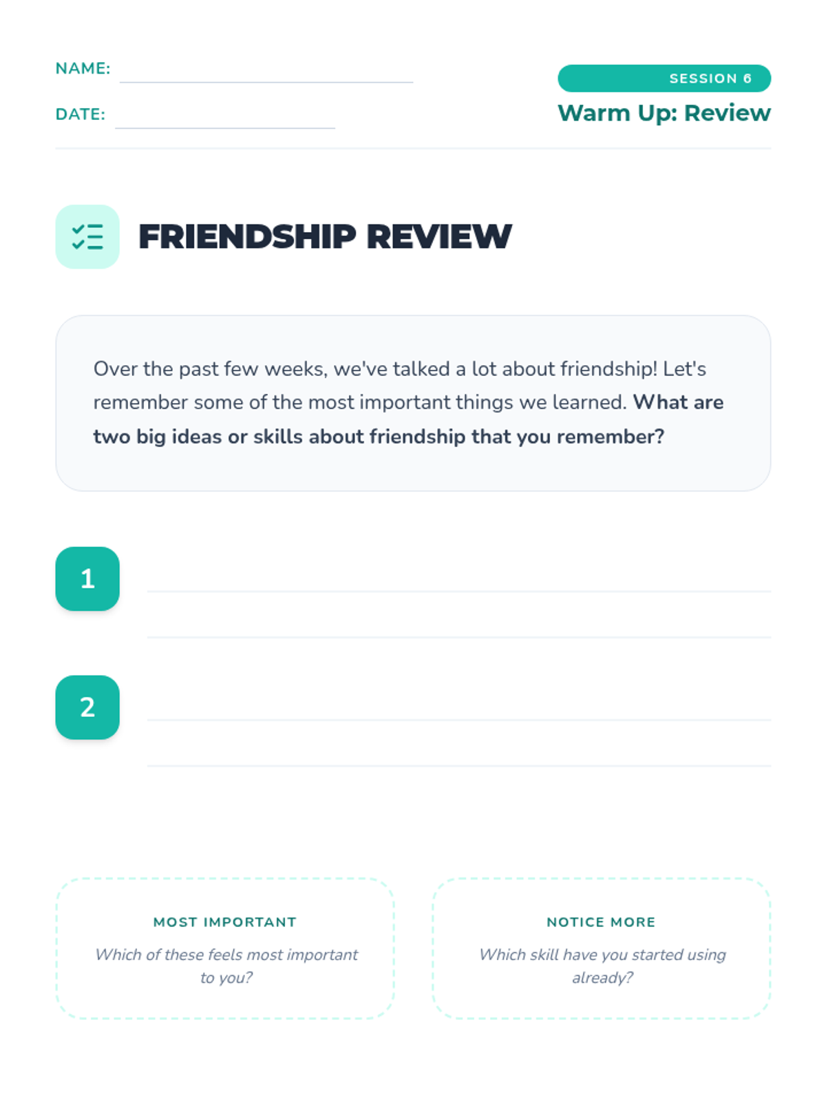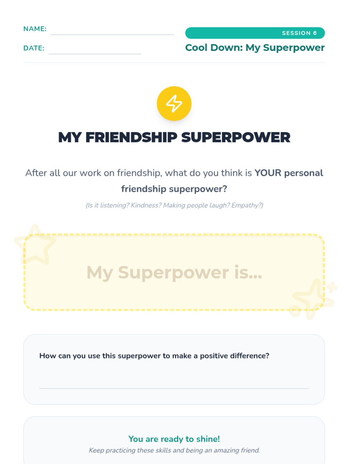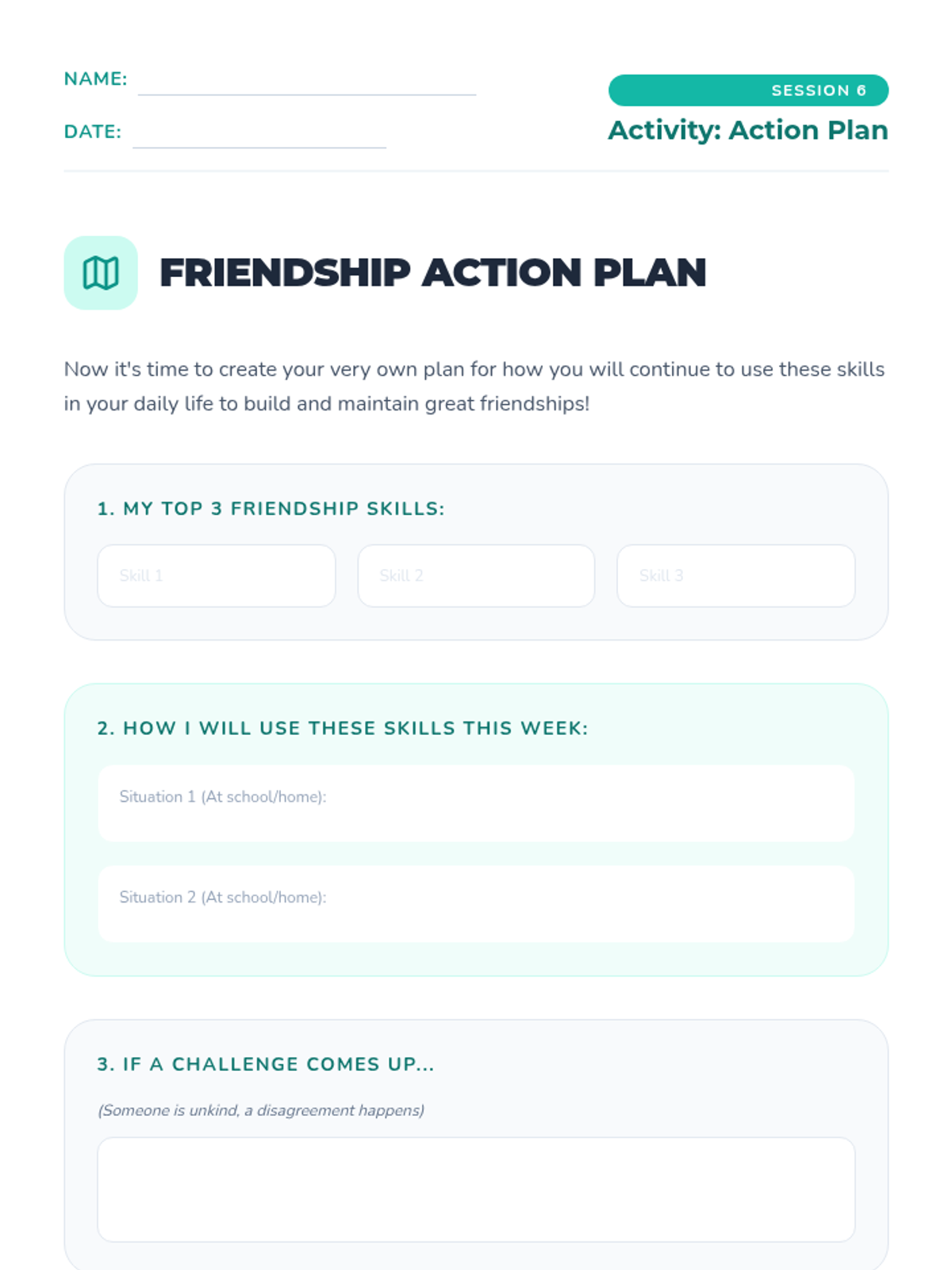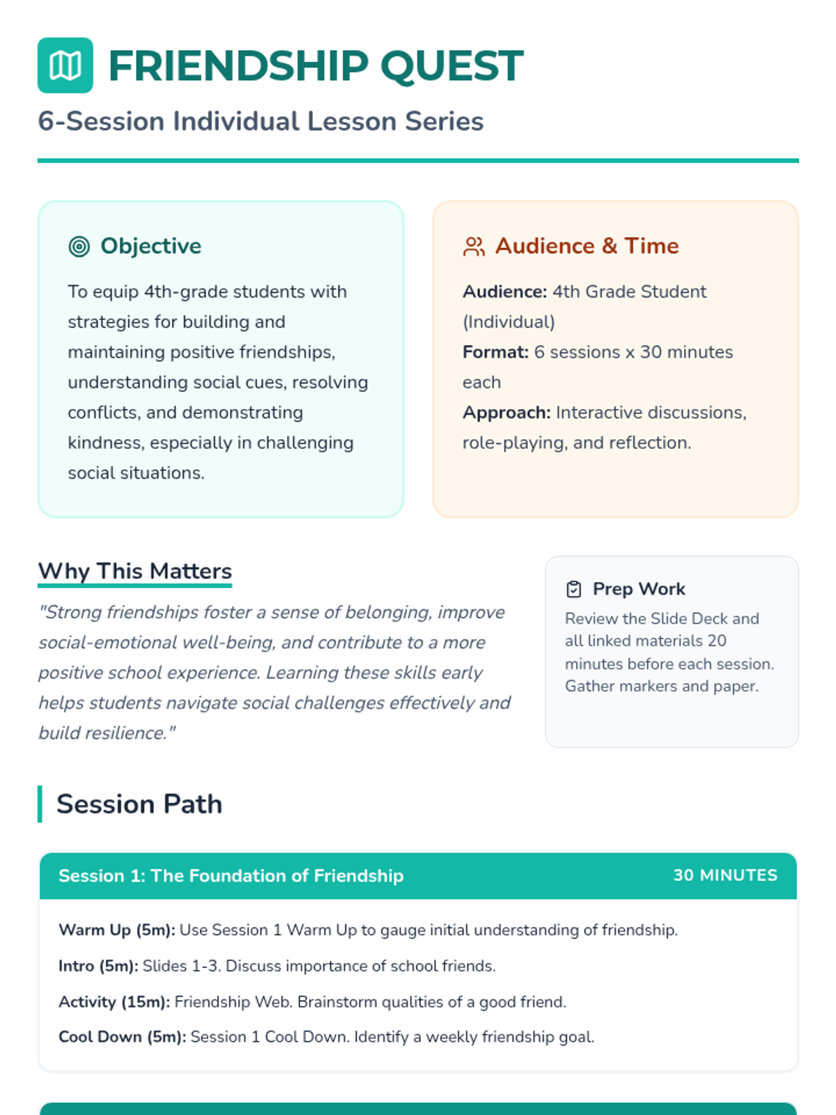 A six-week individual counseling series for 4th graders focused on building healthy friendships, effective communication, conflict resolution, and empathy.