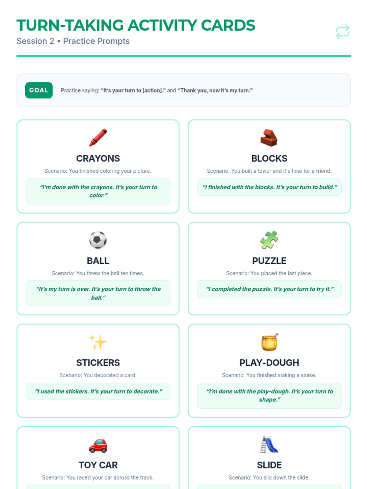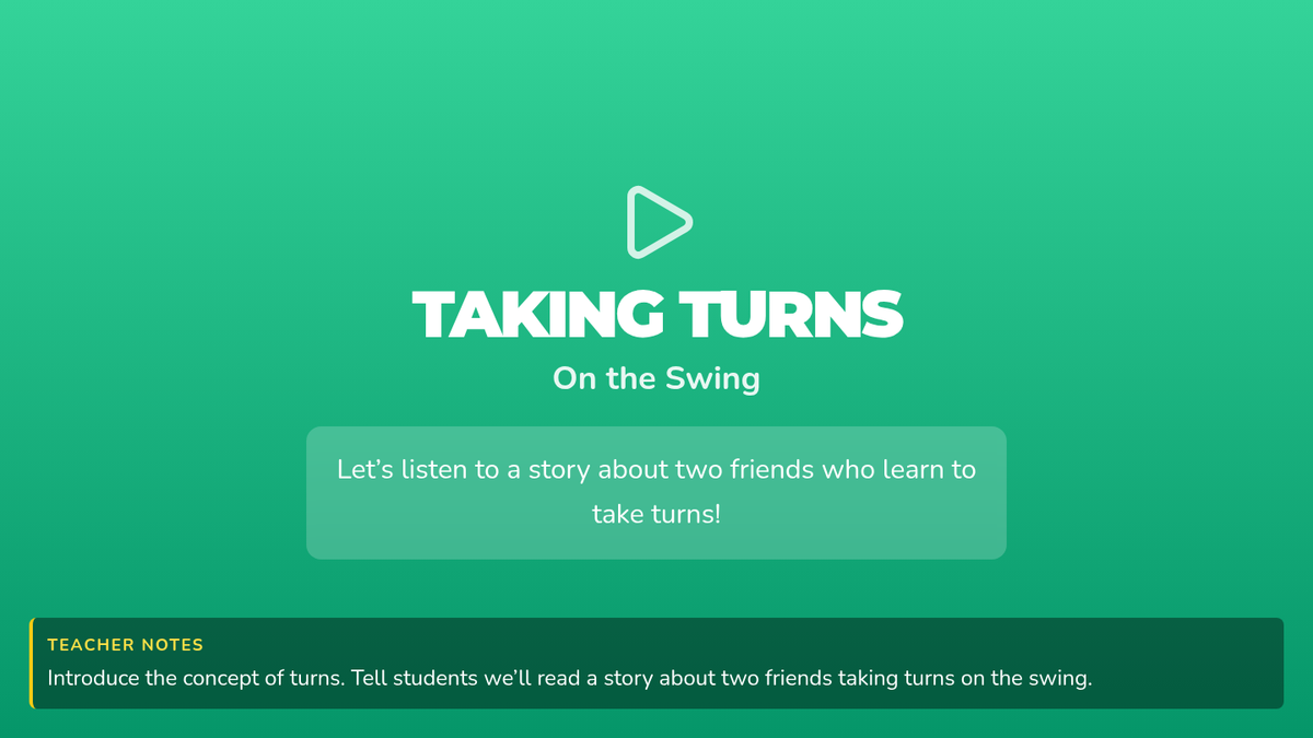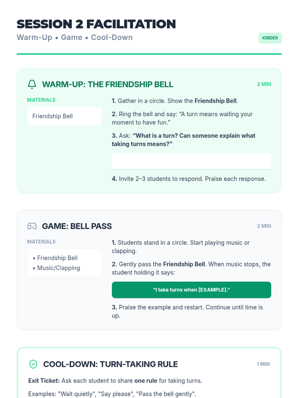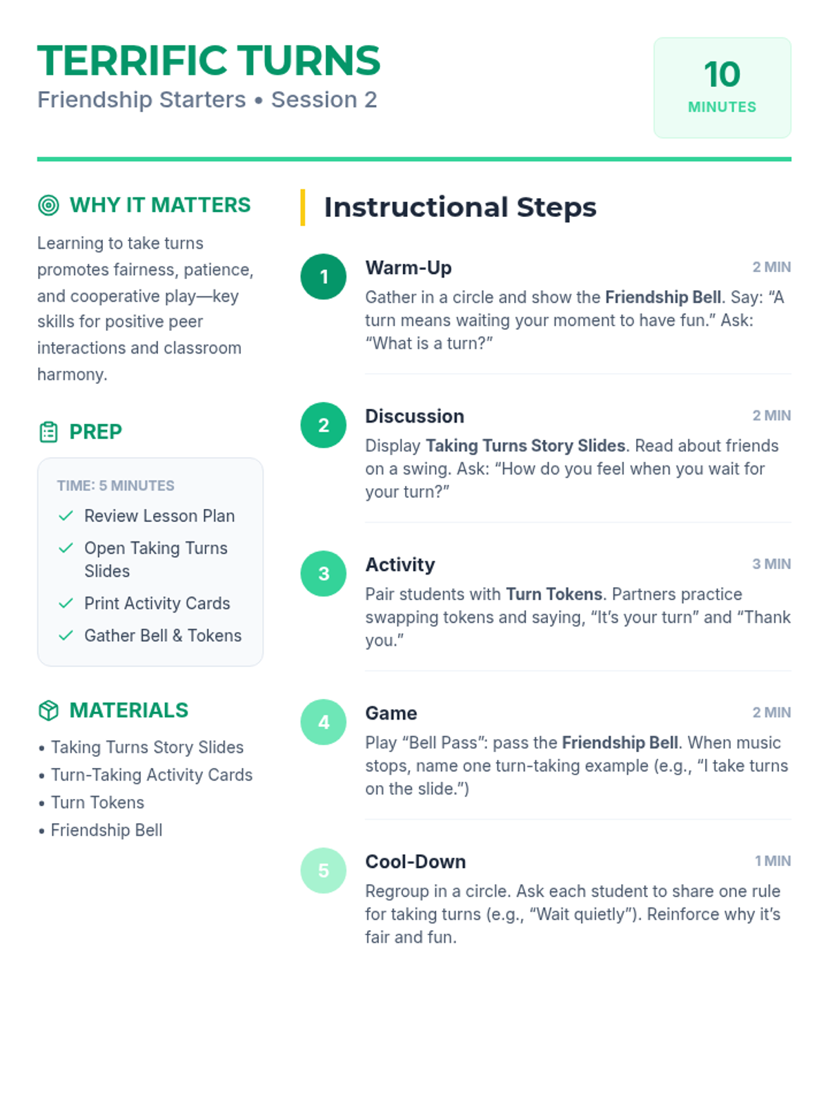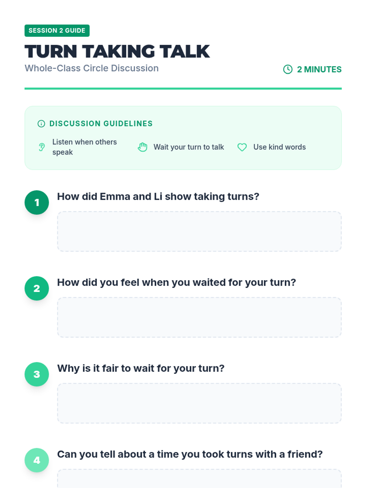 A 4-session kindergarten social skills series teaching sharing, taking turns, empathy, and cooperation through interactive stories, games, and guided practice.