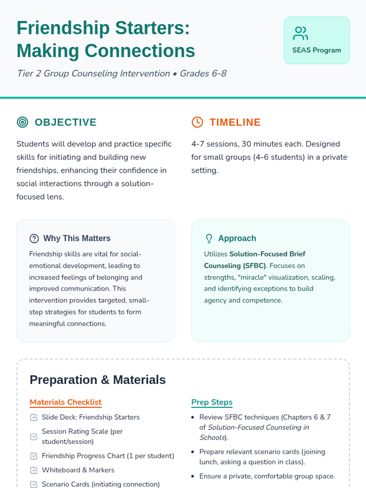 A comprehensive Tier 2 group counseling intervention for middle schoolers, using solution-focused strategies to build practical friend-making skills over 6-7 sessions.