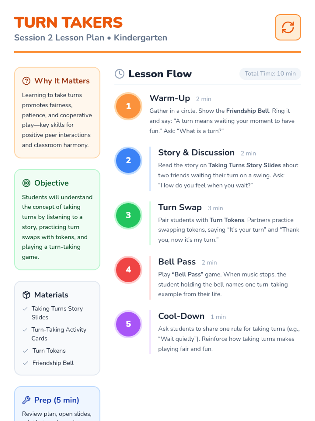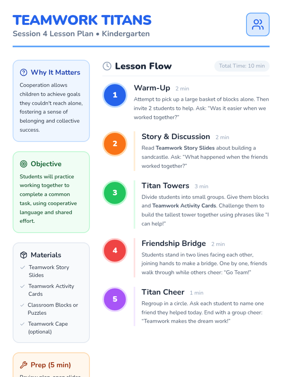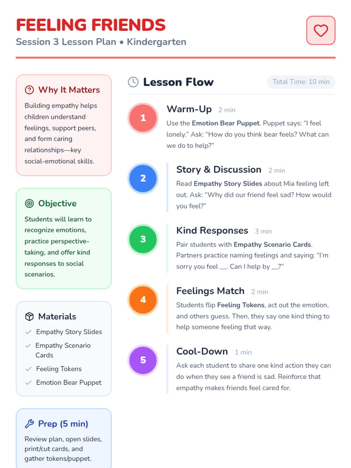 A 4-session kindergarten series designed to build foundational social-emotional skills including sharing, taking turns, empathy, and cooperation through interactive stories and games.