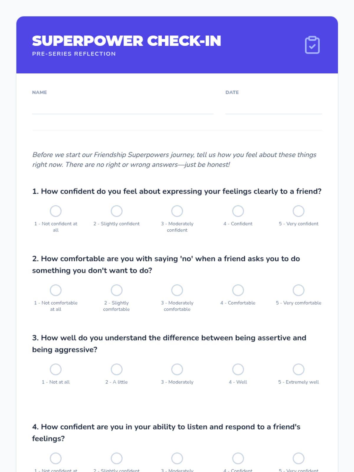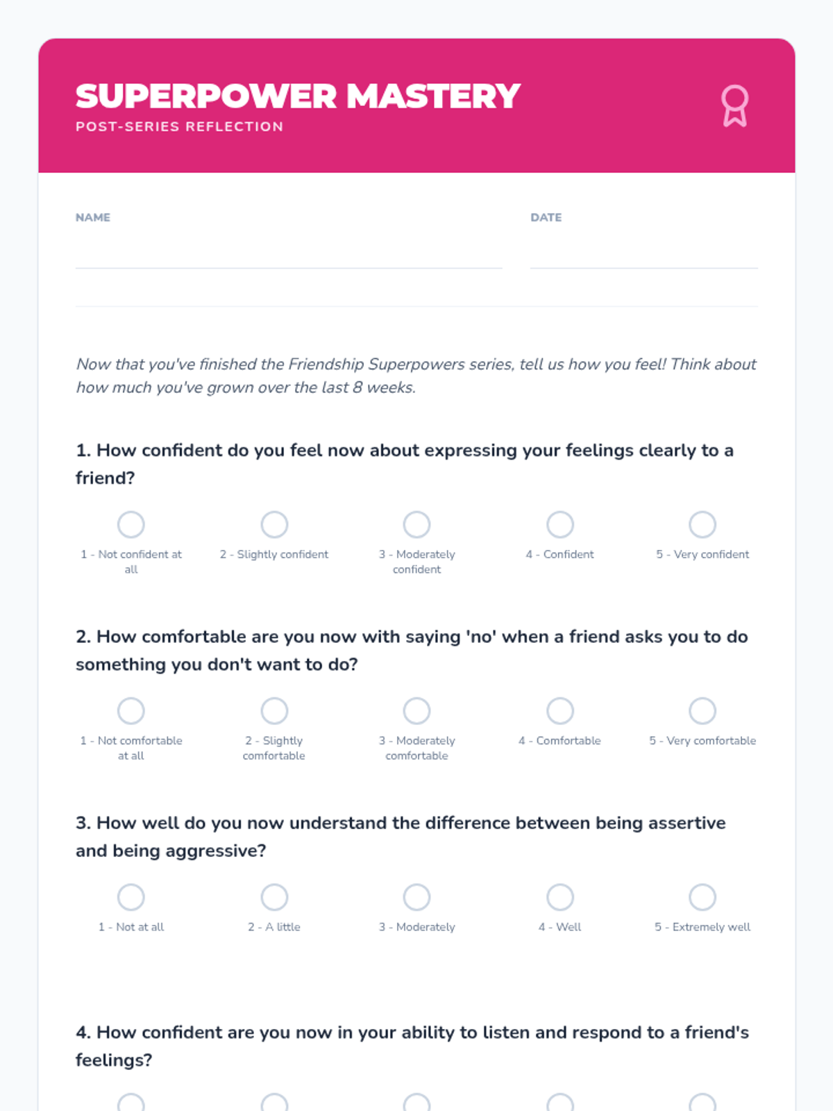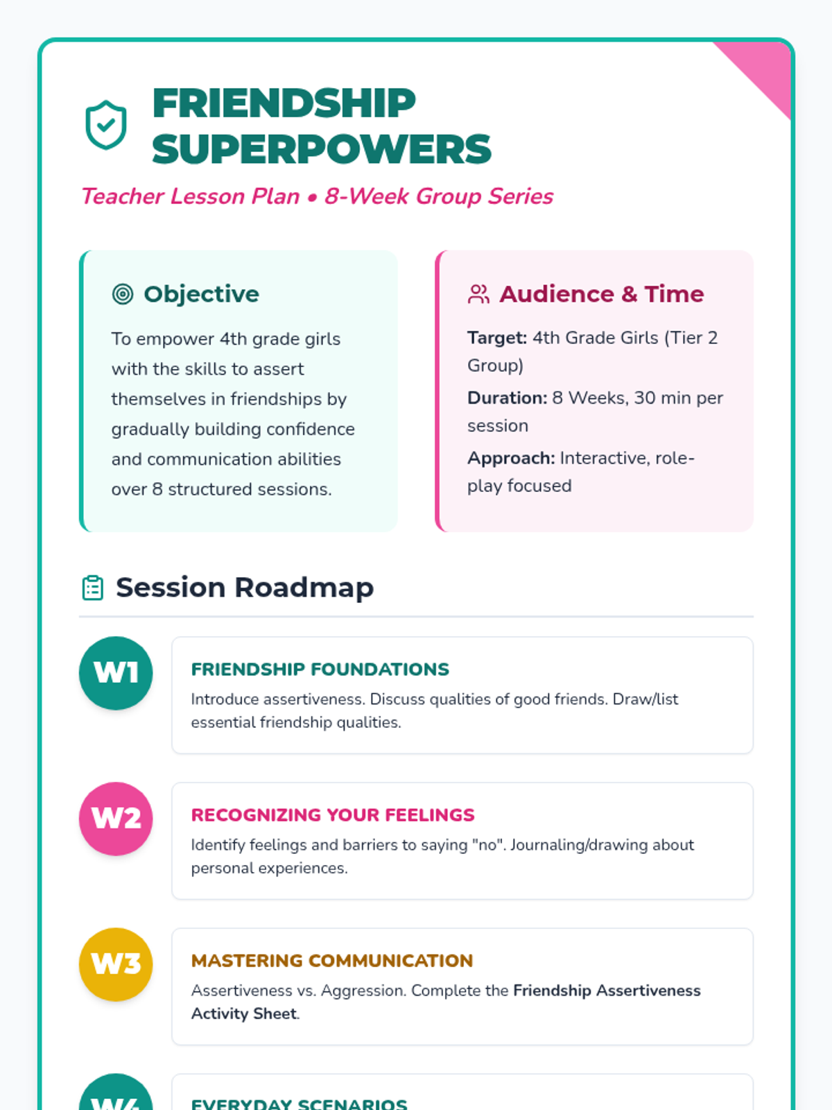 An 8-session series for 4th-grade girls focusing on assertiveness, communication, and standing up for oneself in friendships through role-play, games, and discussions.