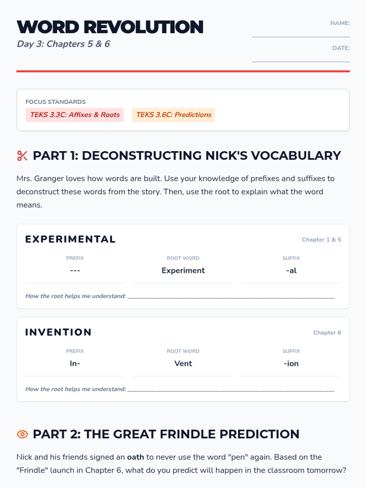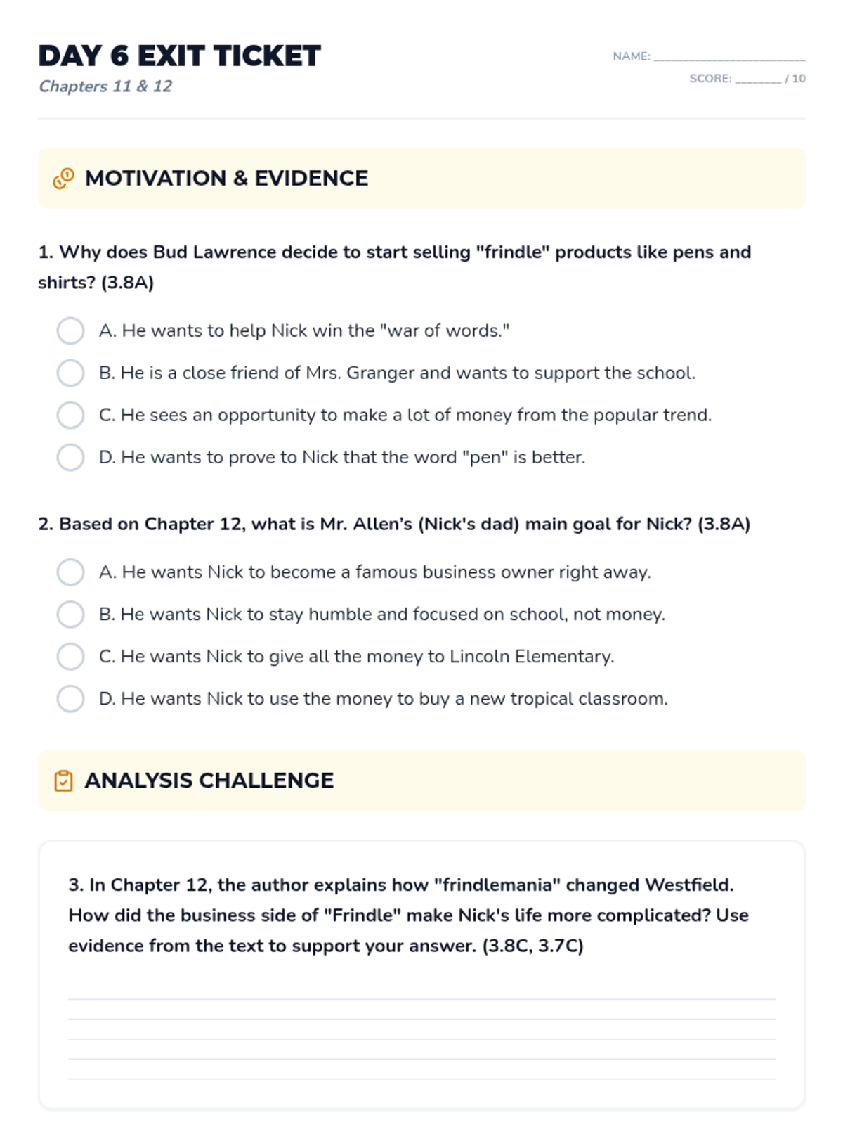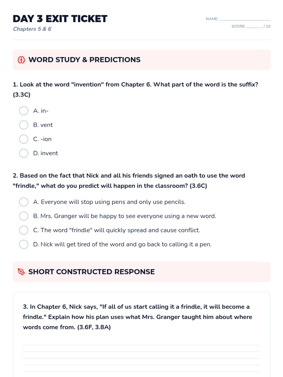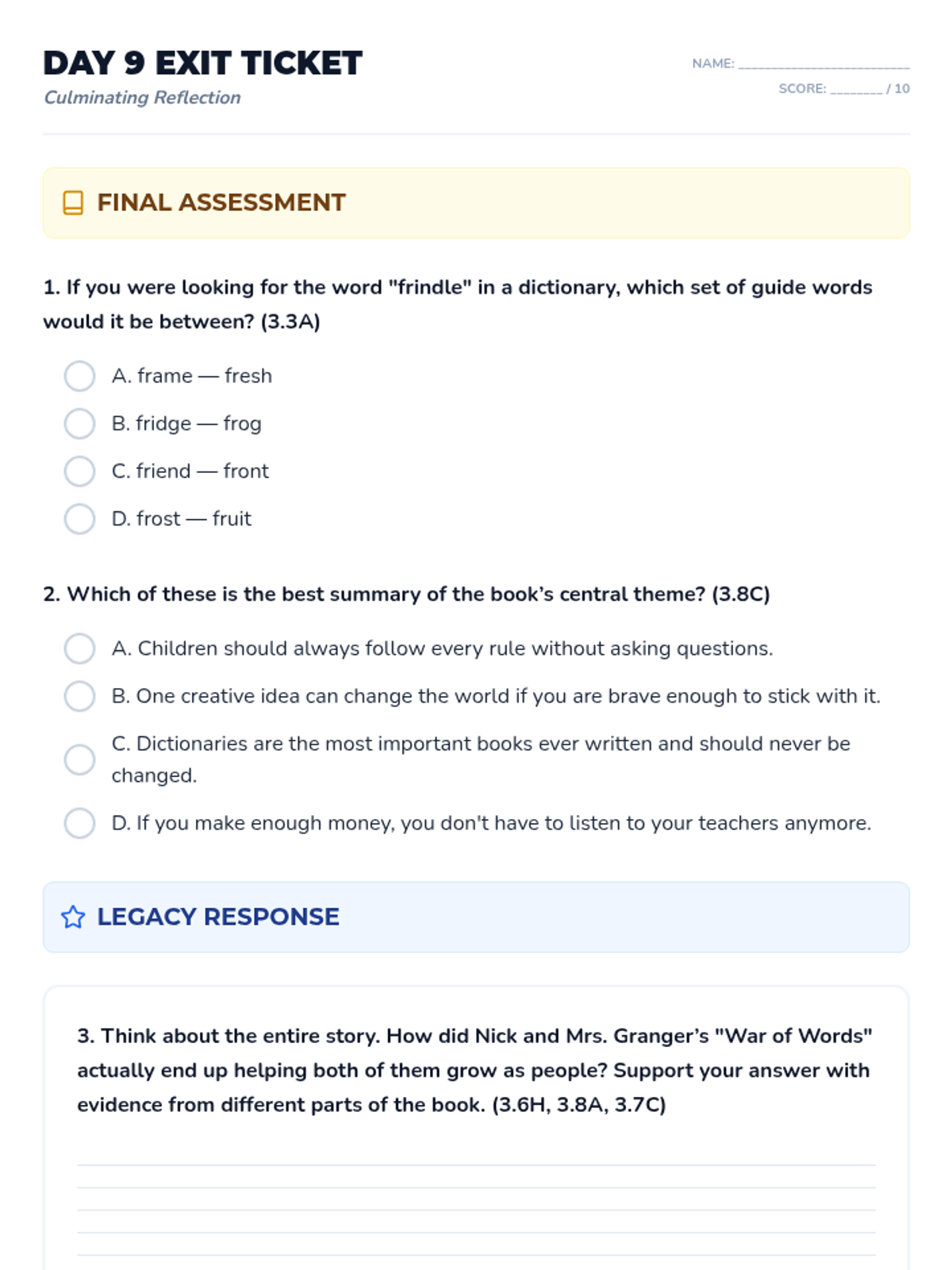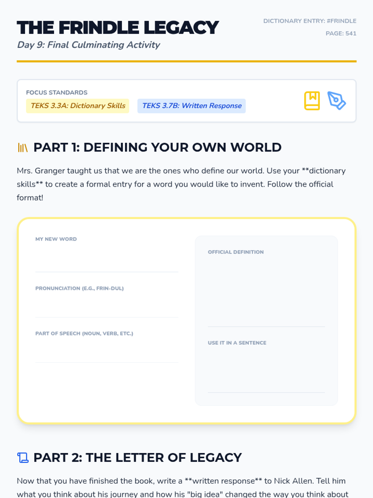 A comprehensive 9-day novel study for Andrew Clements' 'Frindle', focusing on 3rd Grade TEKS. Each day includes two chapters of reading, a rigorous skill-based activity, and a TEKS-aligned exit ticket.