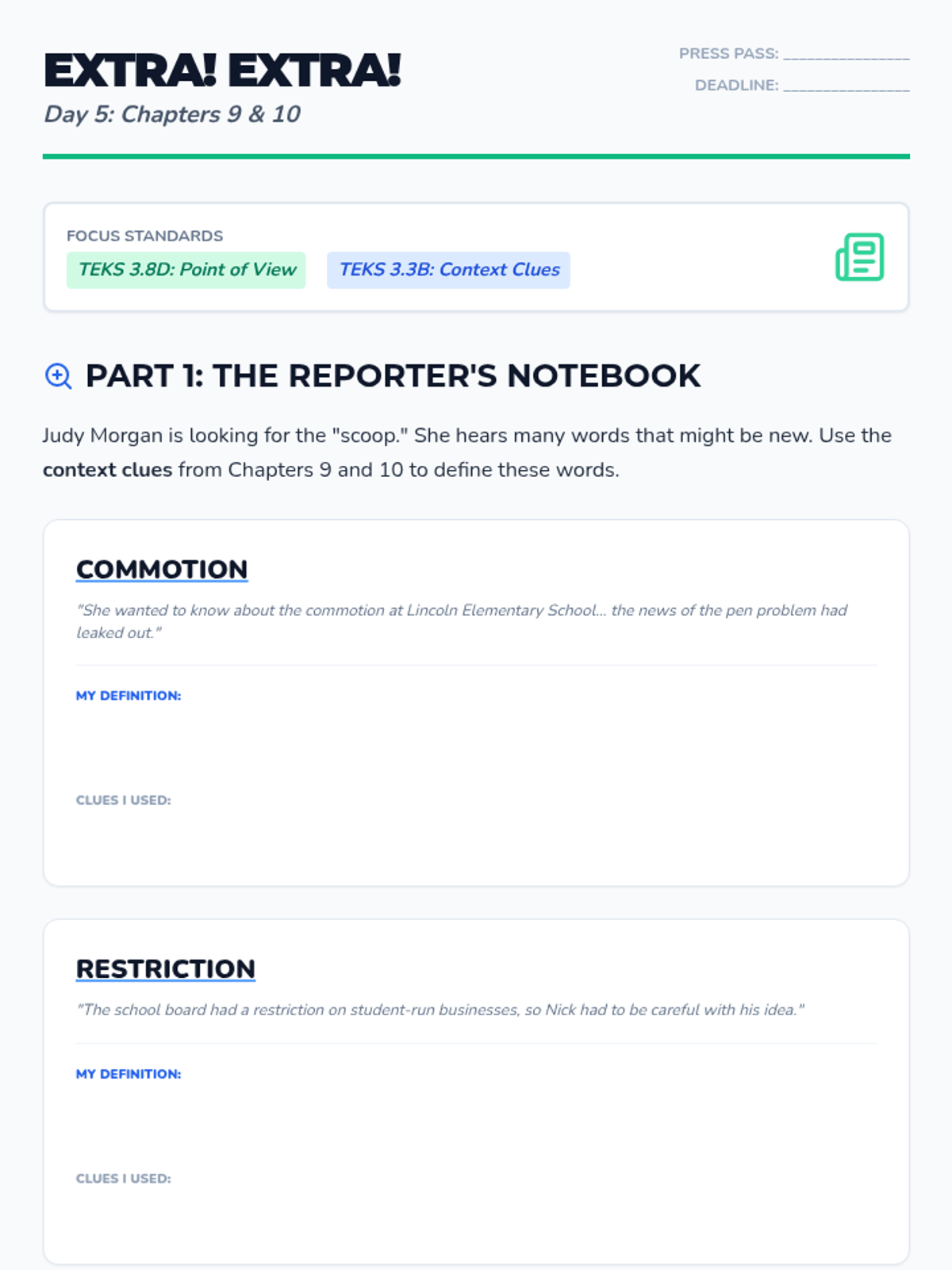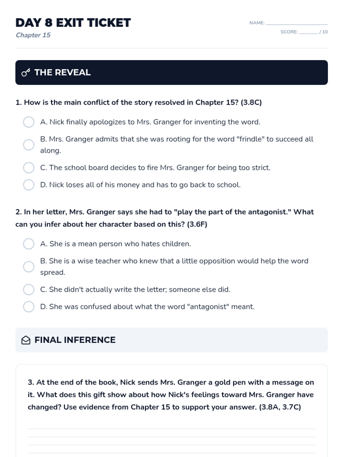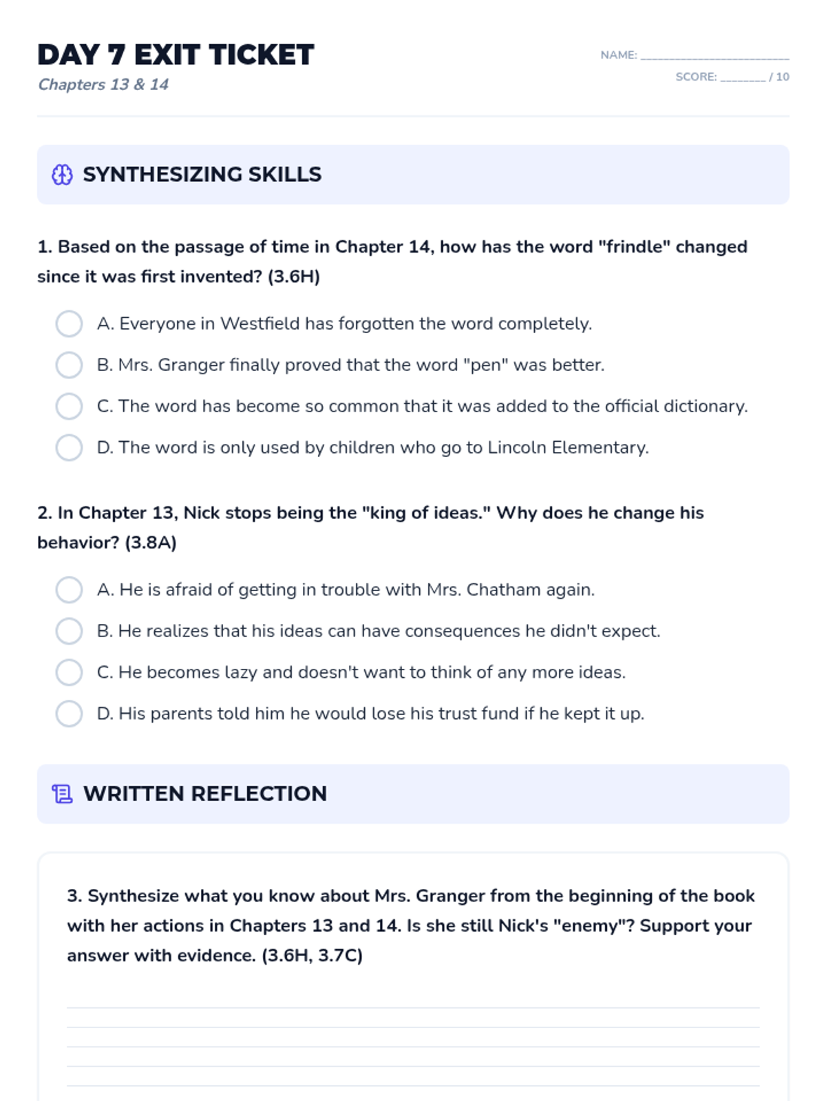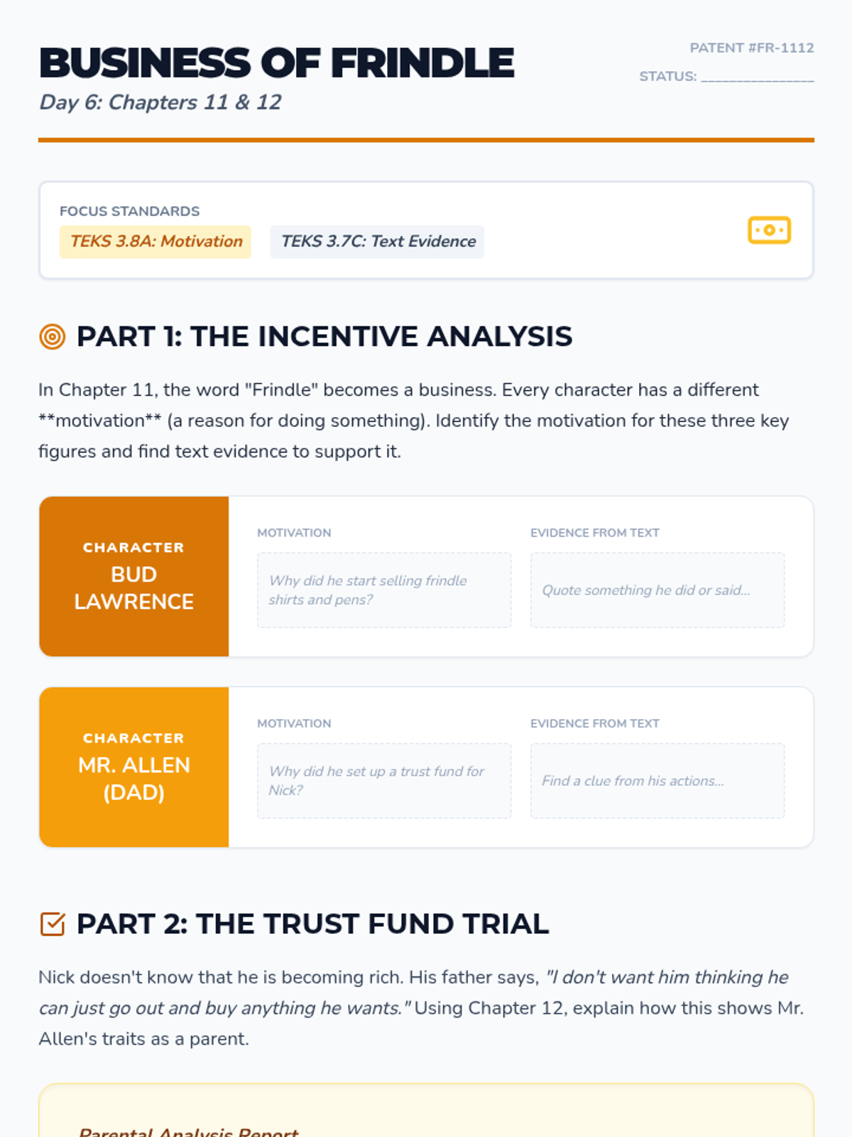 A comprehensive 9-day novel study for Andrew Clements' 'Frindle', focusing on 3rd Grade TEKS. Each day includes two chapters of reading, a rigorous skill-based activity, and a TEKS-aligned exit ticket.