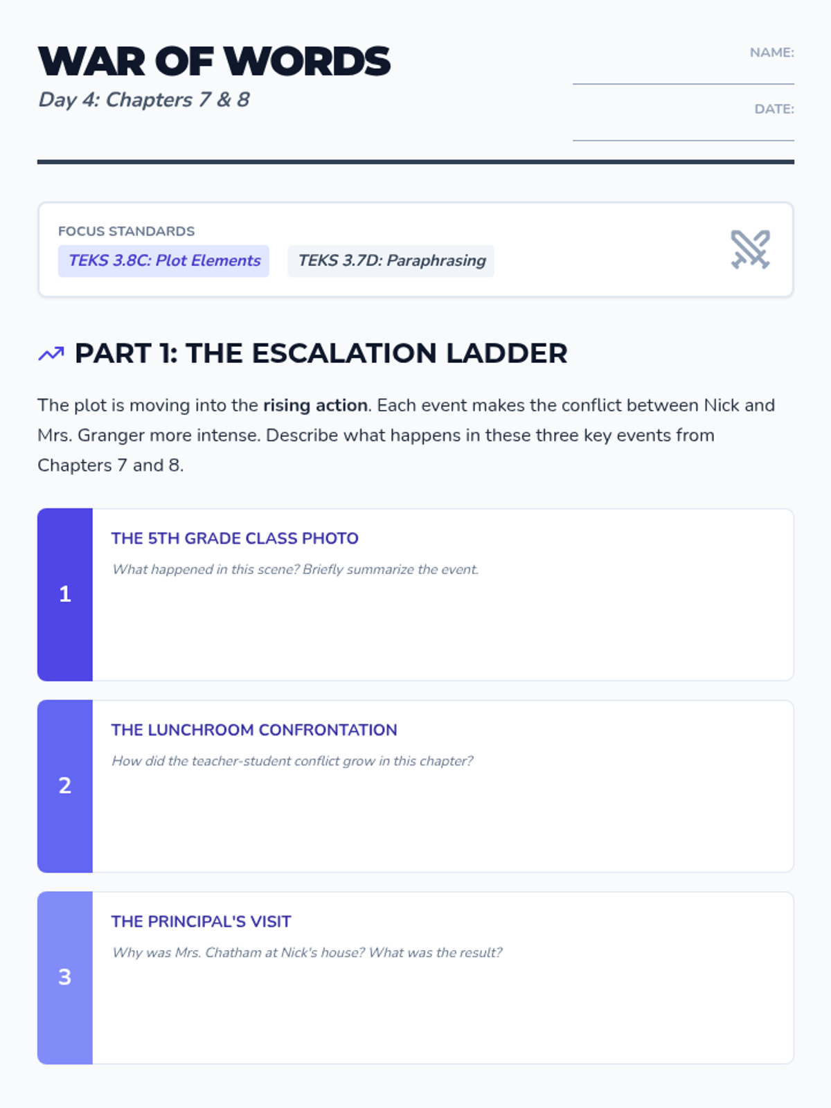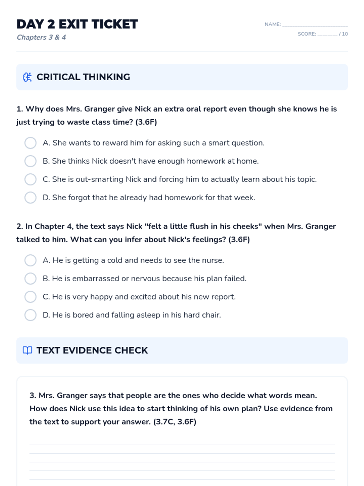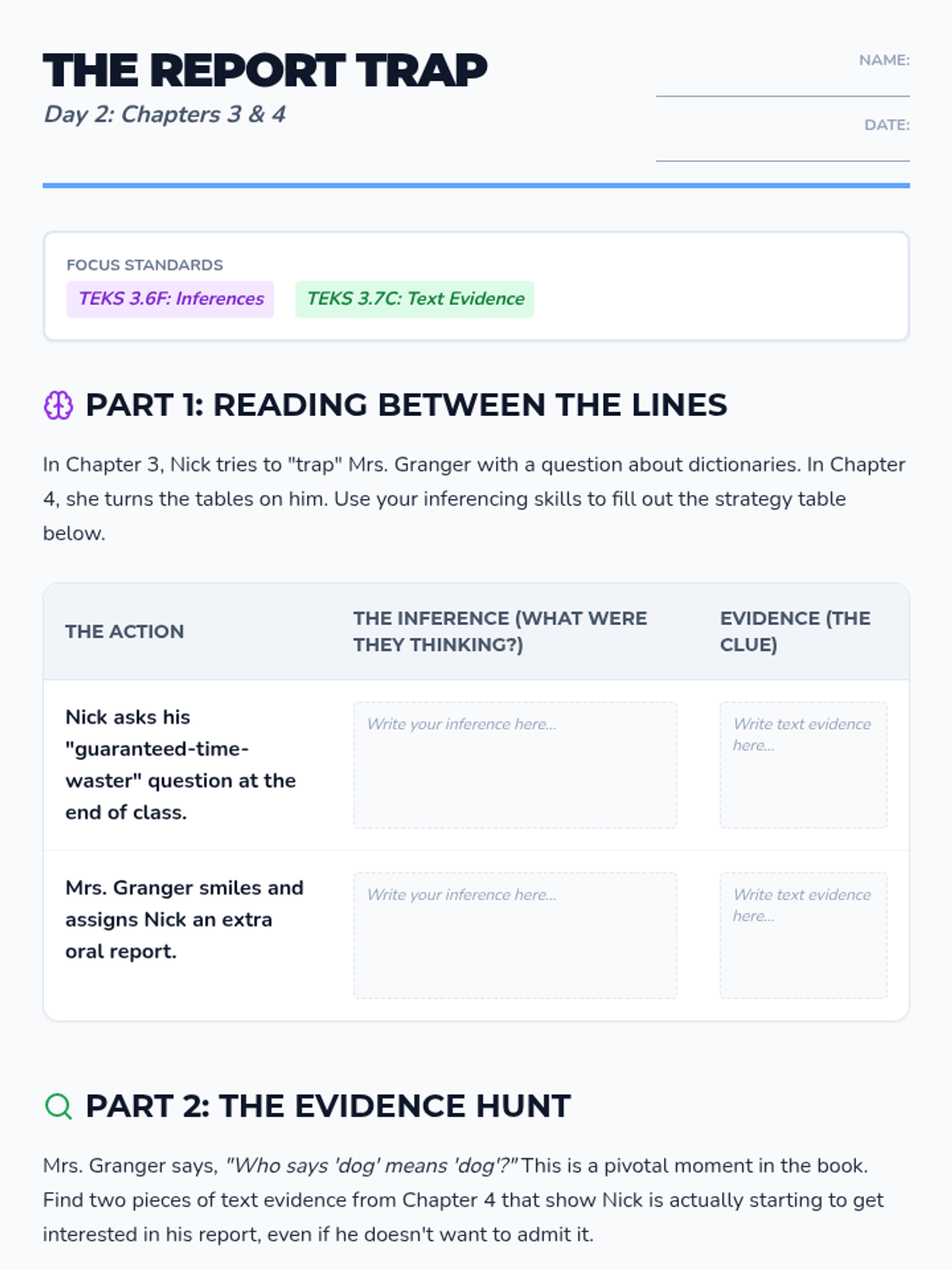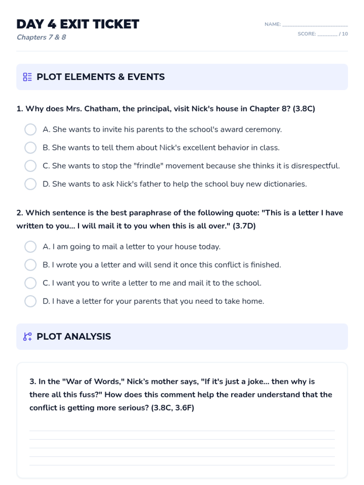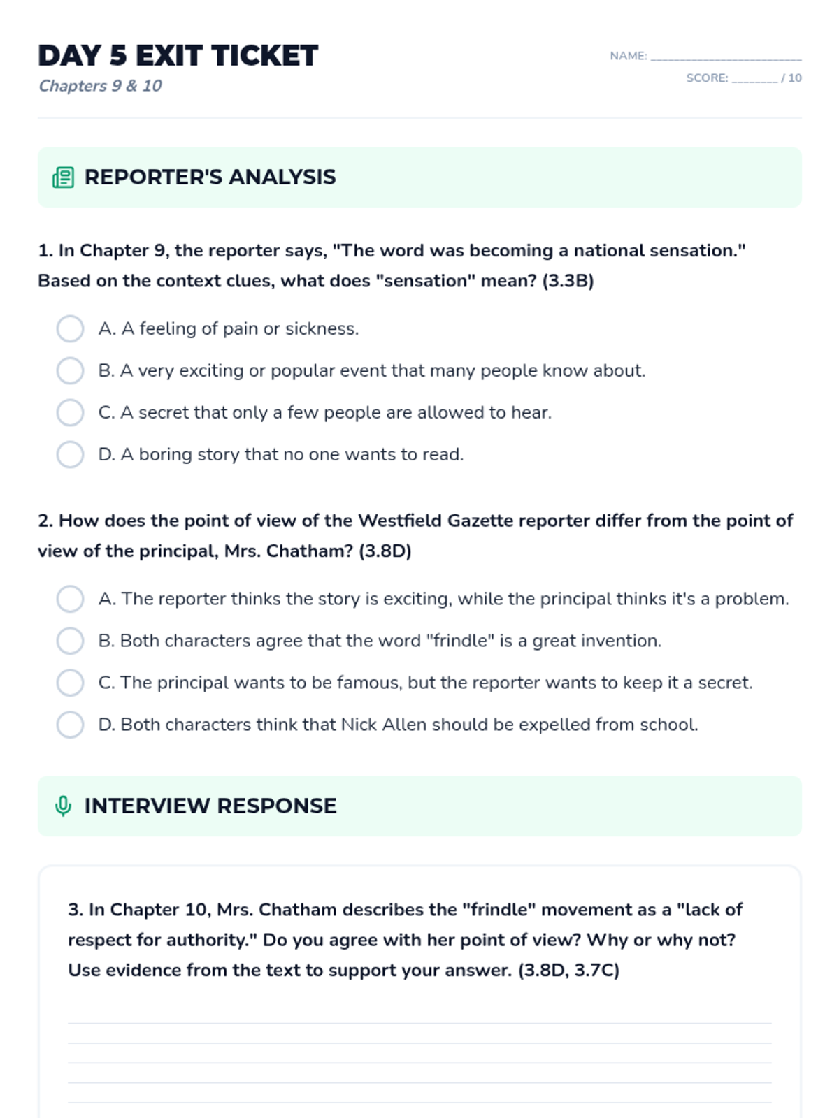 A comprehensive 9-day novel study for Andrew Clements' 'Frindle', focusing on 3rd Grade TEKS. Each day includes two chapters of reading, a rigorous skill-based activity, and a TEKS-aligned exit ticket.