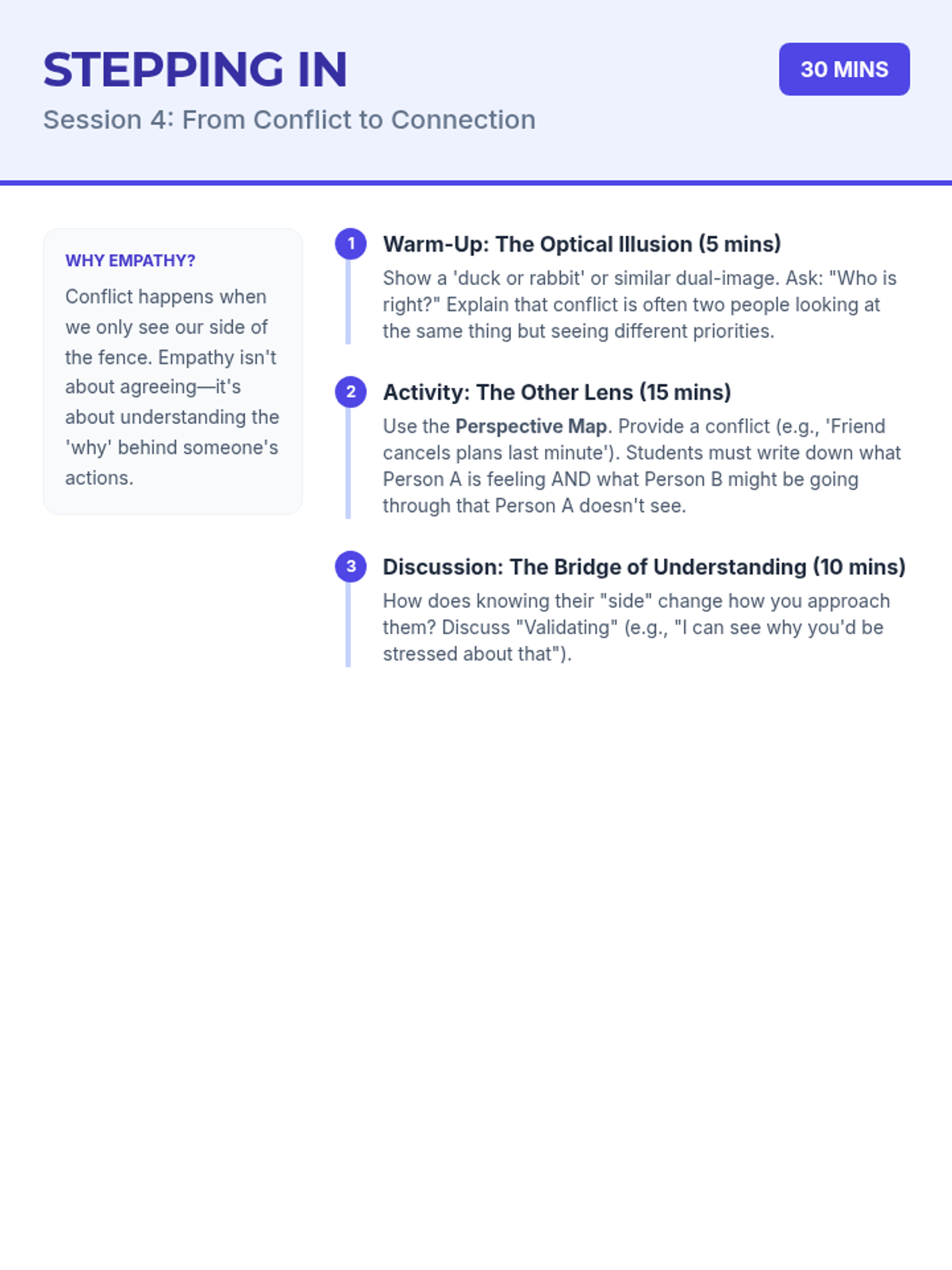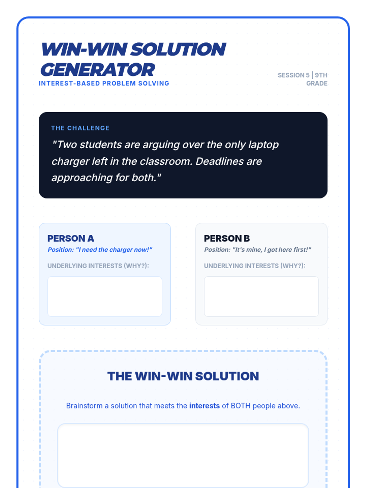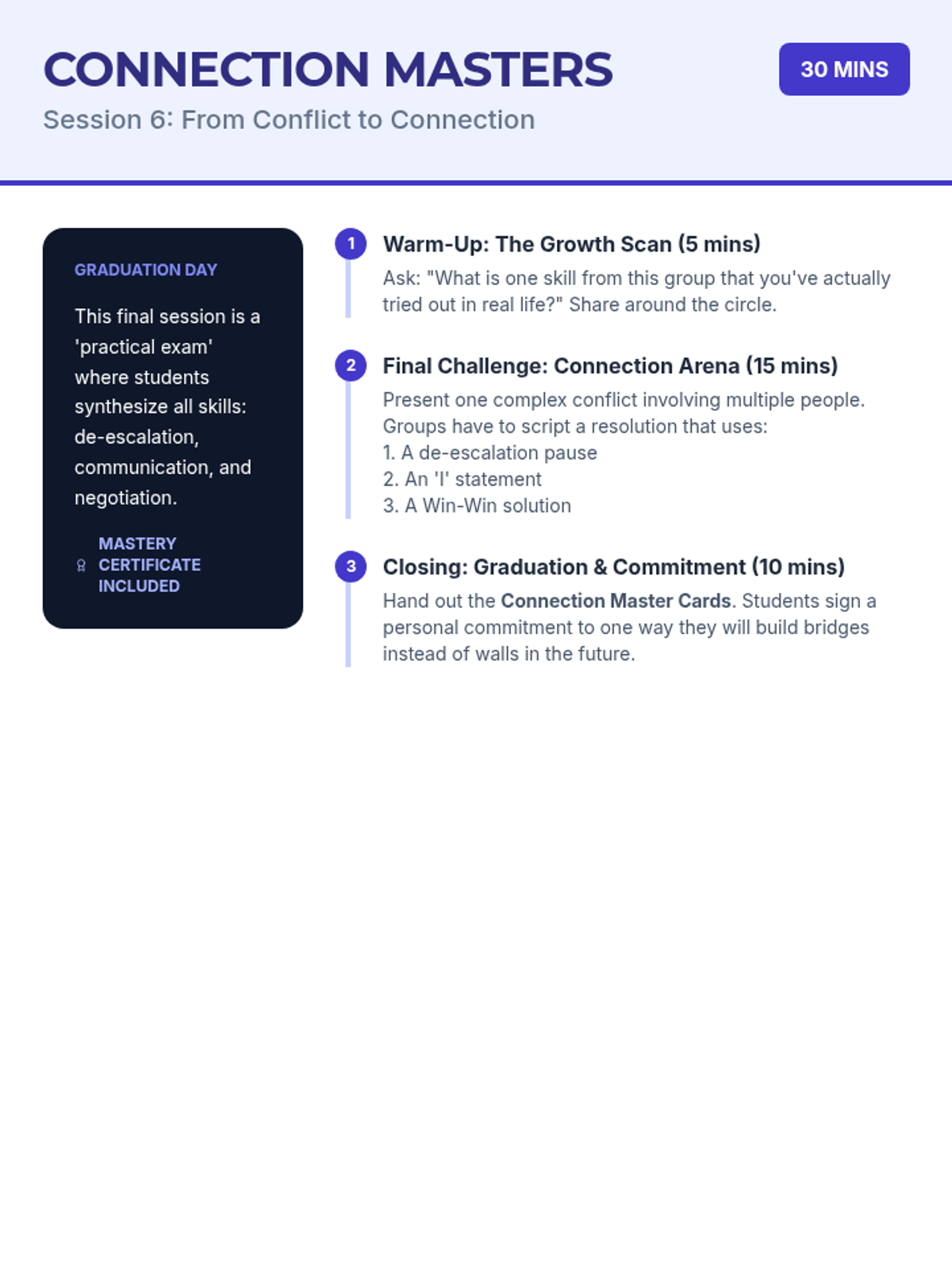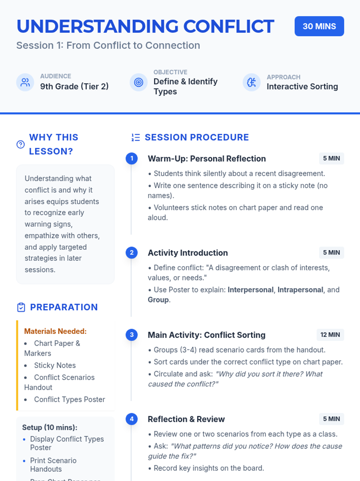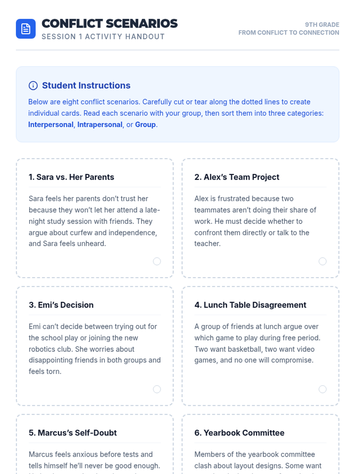 A 6-session Tier 2 group course teaching 9th graders practical conflict resolution skills. Through interactive activities, students build empathy, communication, and problem-solving strategies to transform conflicts into positive connections.