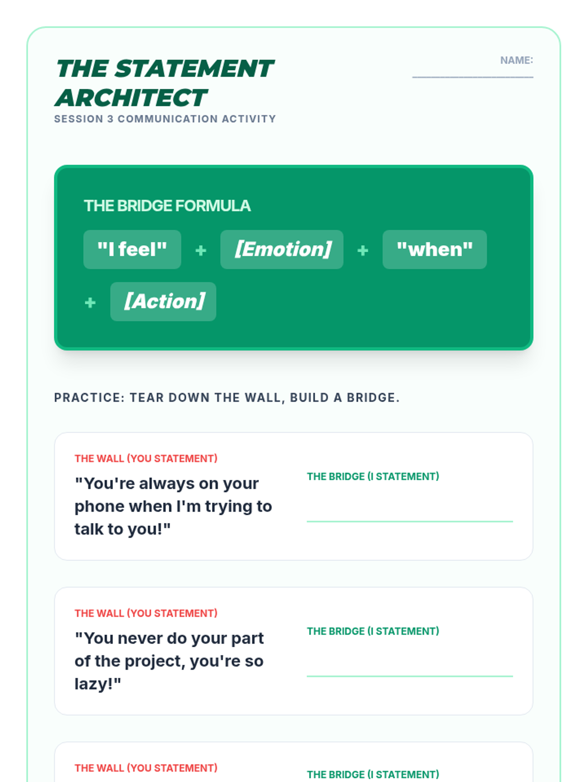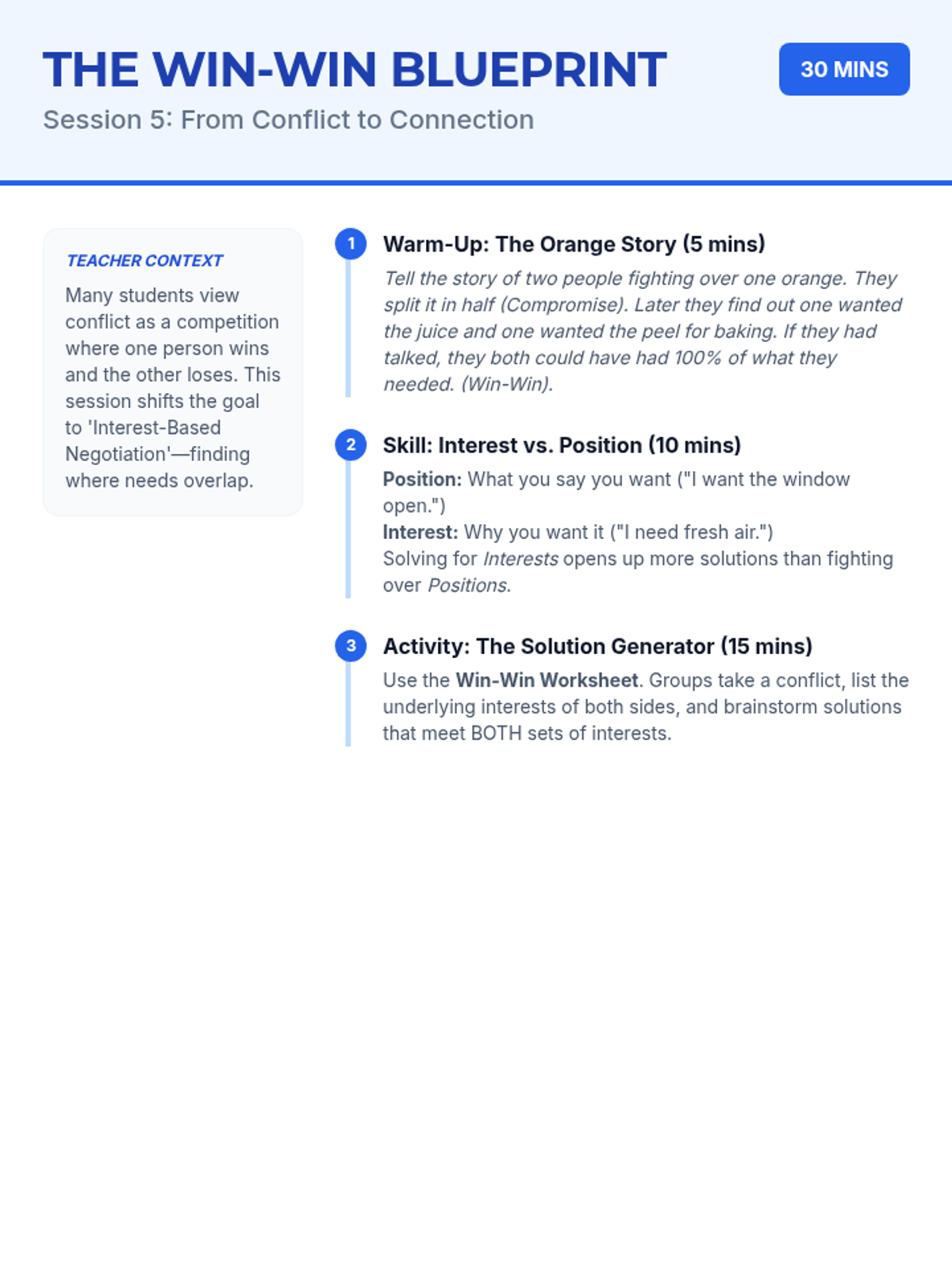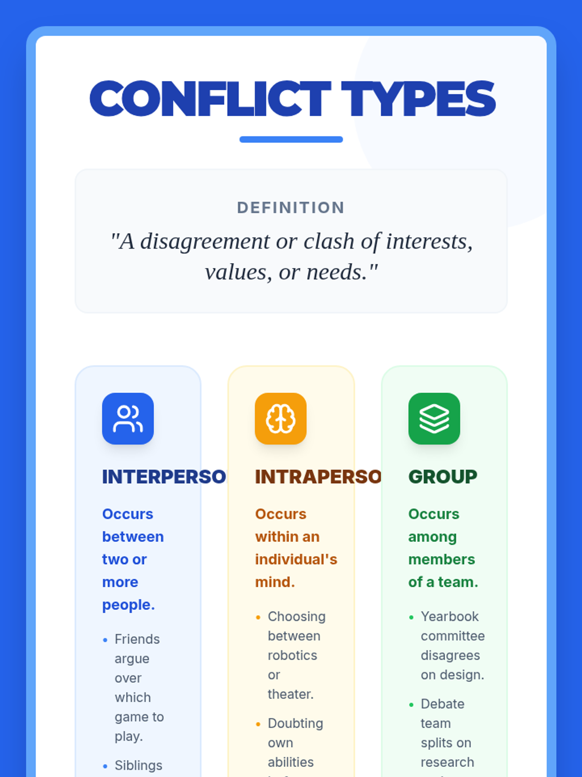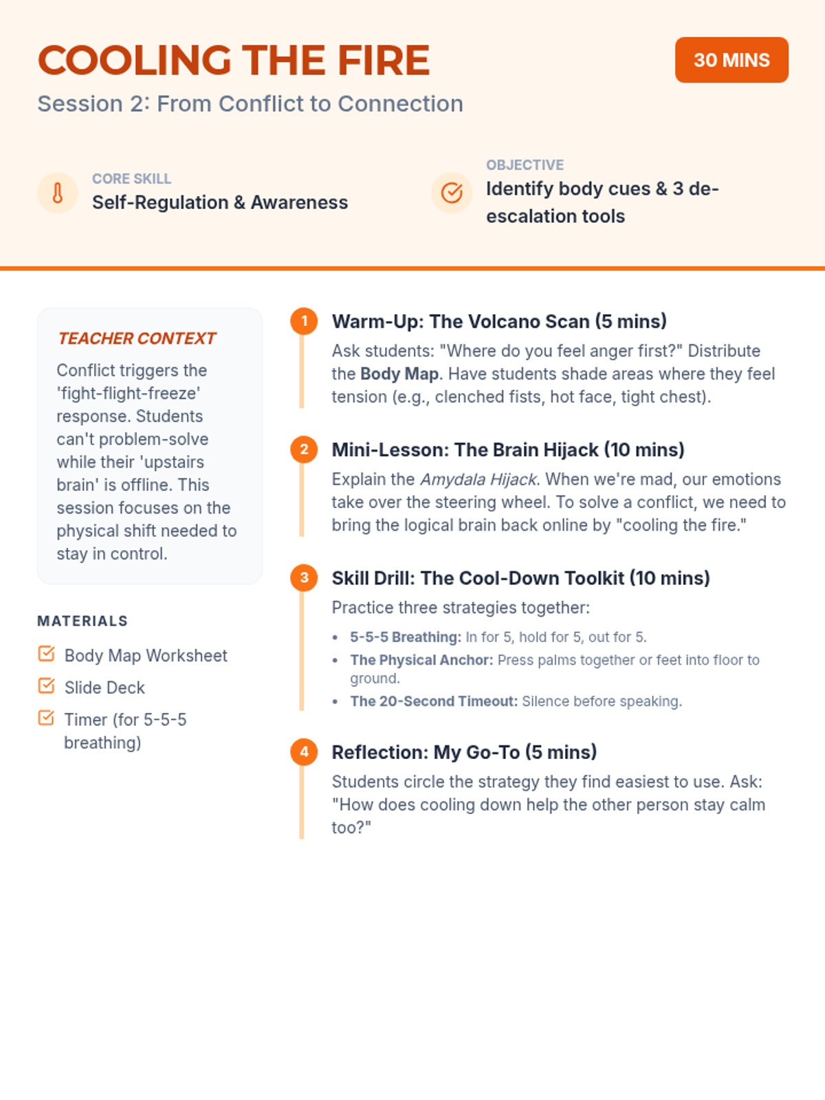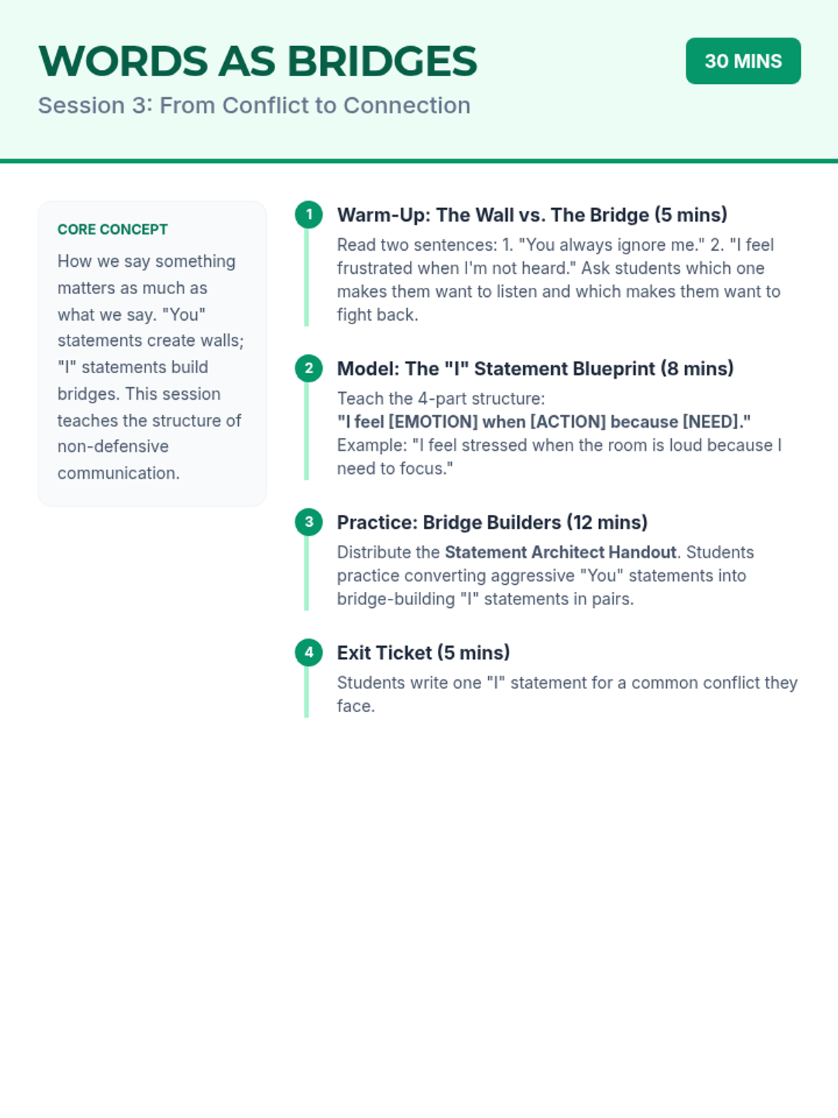 A 6-session Tier 2 group course teaching 9th graders practical conflict resolution skills. Through interactive activities, students build empathy, communication, and problem-solving strategies to transform conflicts into positive connections.