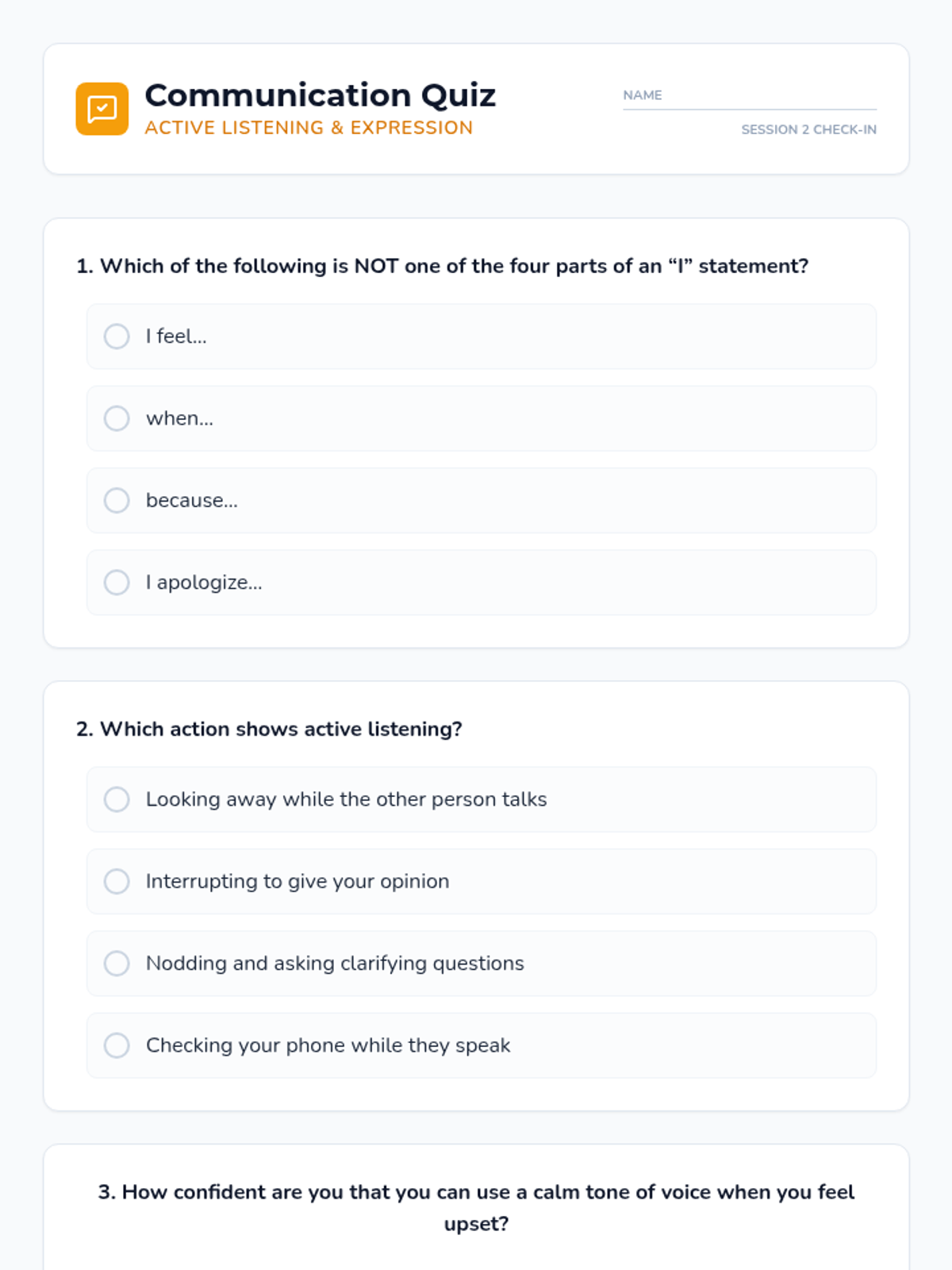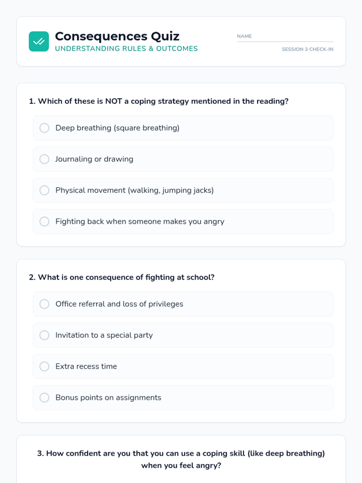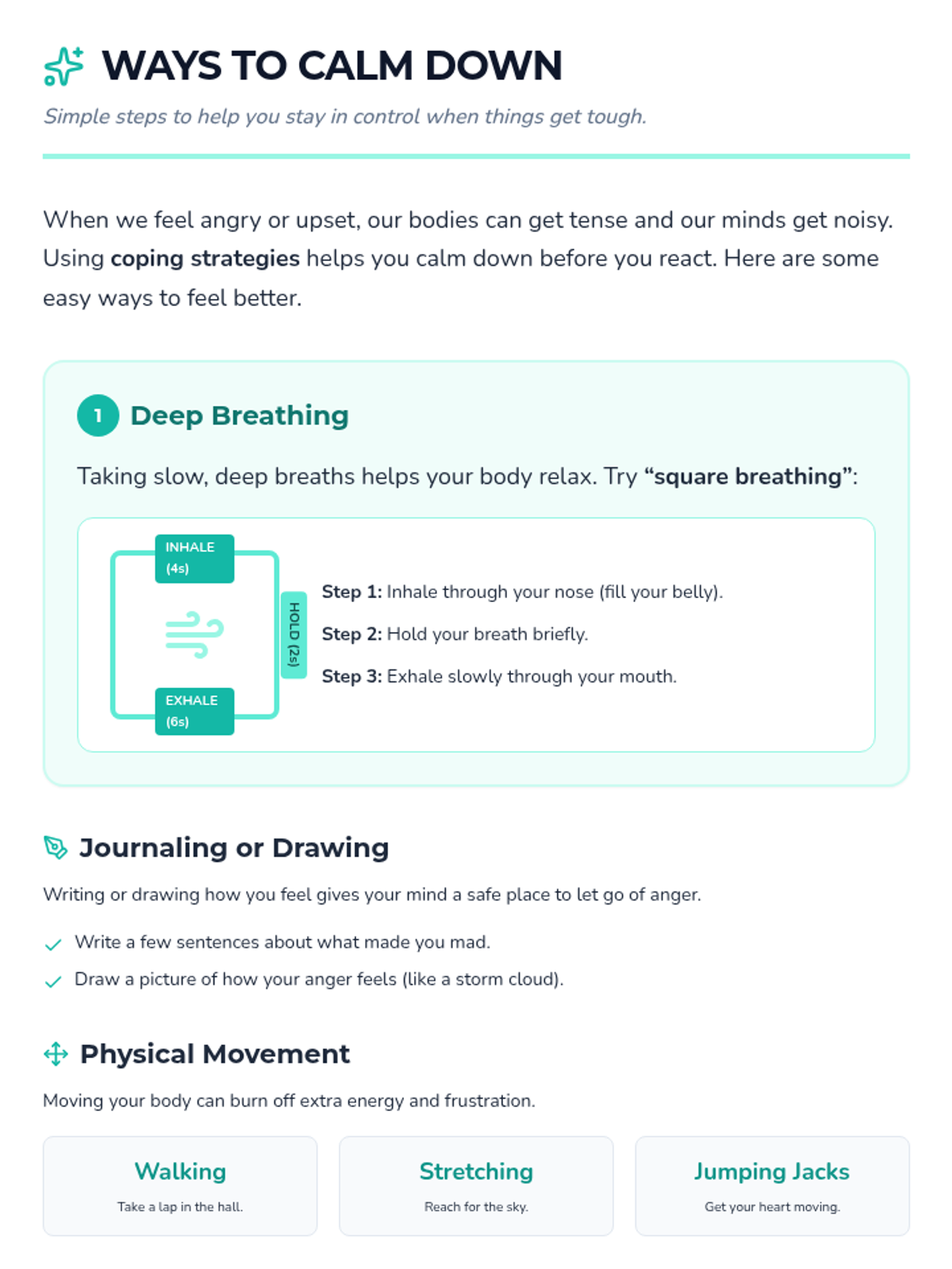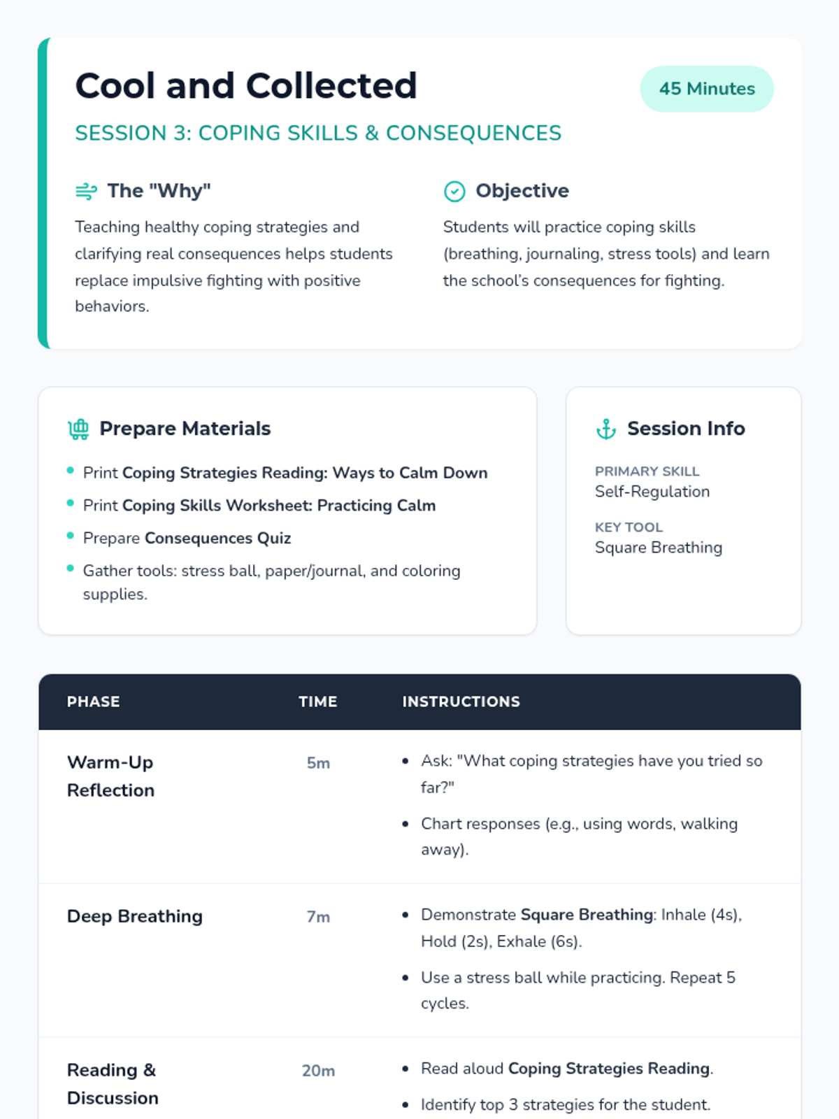 A 3-session individual intervention for 4th graders to reduce physical aggression by teaching the risks of fighting, effective communication techniques, and healthy coping strategies.
