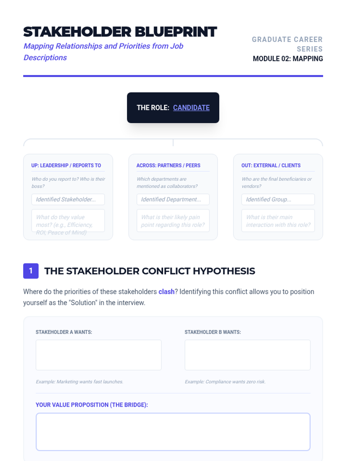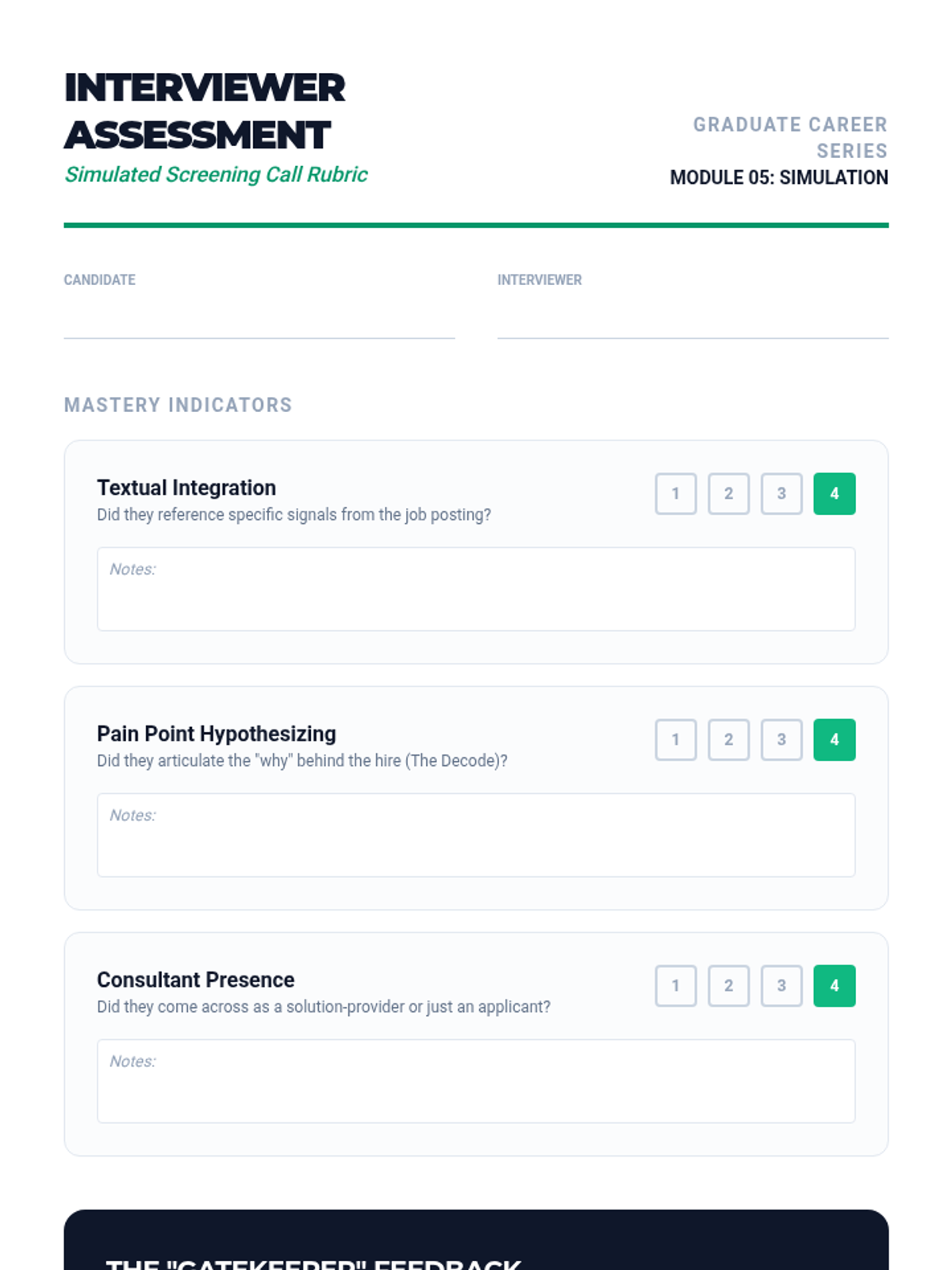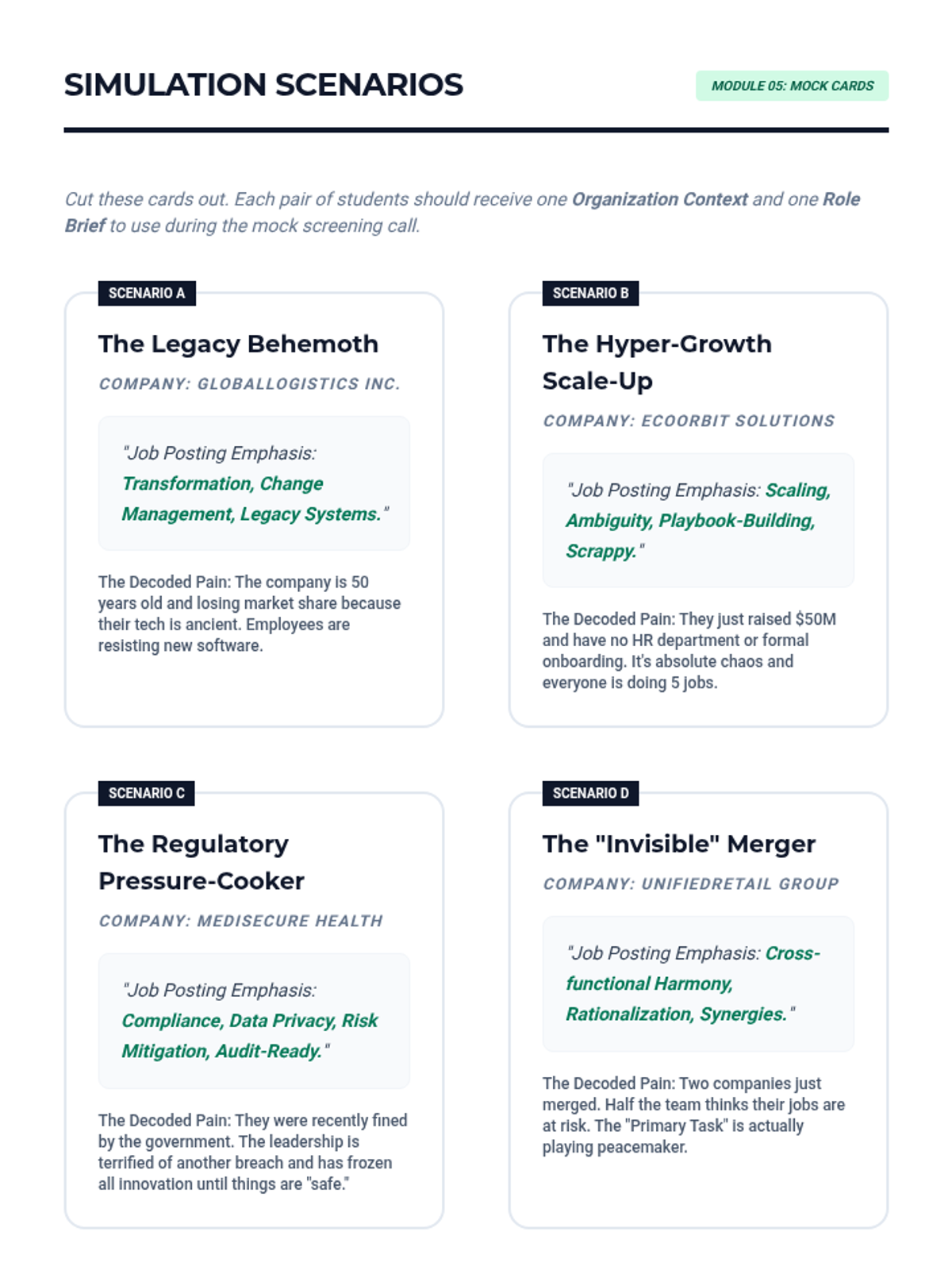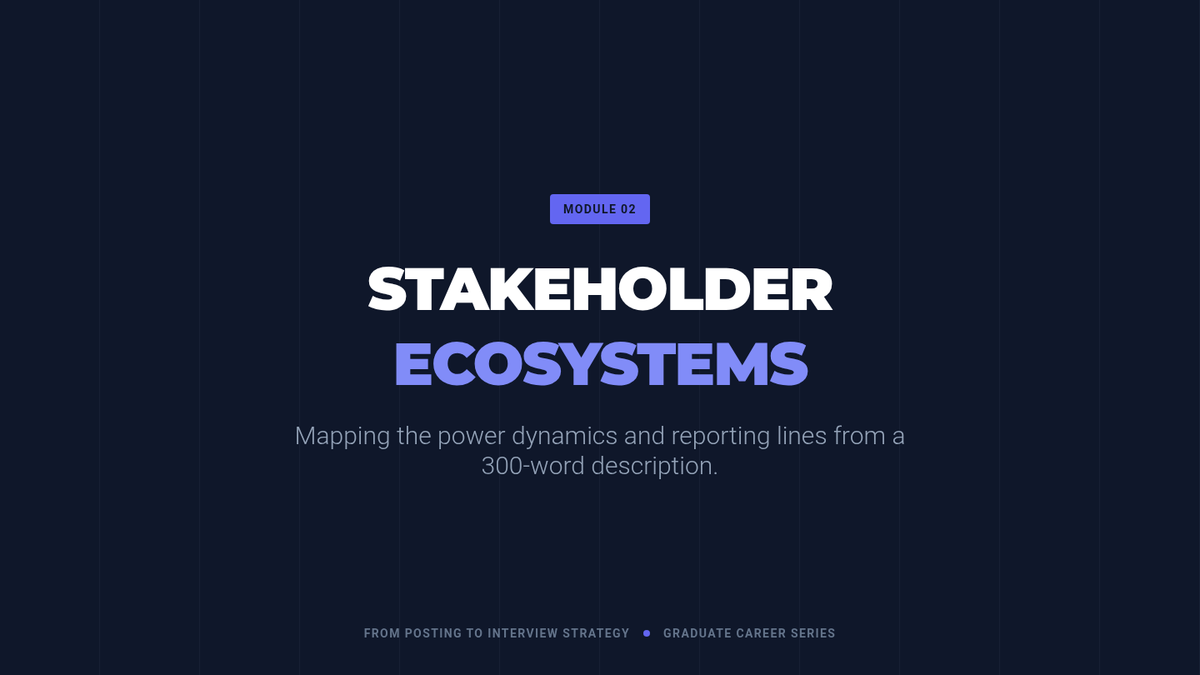 A 5-lesson sequence for graduate students focused on reverse-engineering job postings to identify organizational pain points, map stakeholder ecosystems, and develop high-impact interview strategies. Students transition from passive readers to strategic consultants by decoding job descriptions.