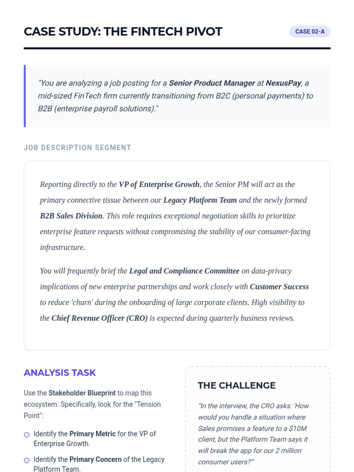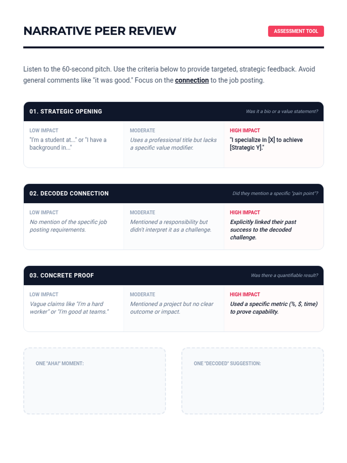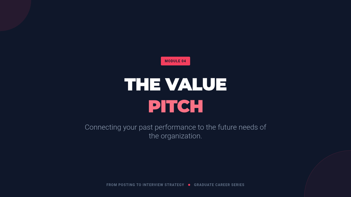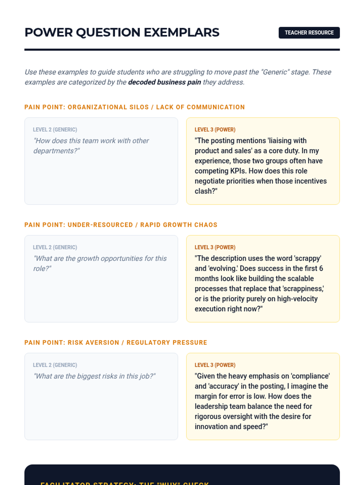 A 5-lesson sequence for graduate students focused on reverse-engineering job postings to identify organizational pain points, map stakeholder ecosystems, and develop high-impact interview strategies. Students transition from passive readers to strategic consultants by decoding job descriptions.