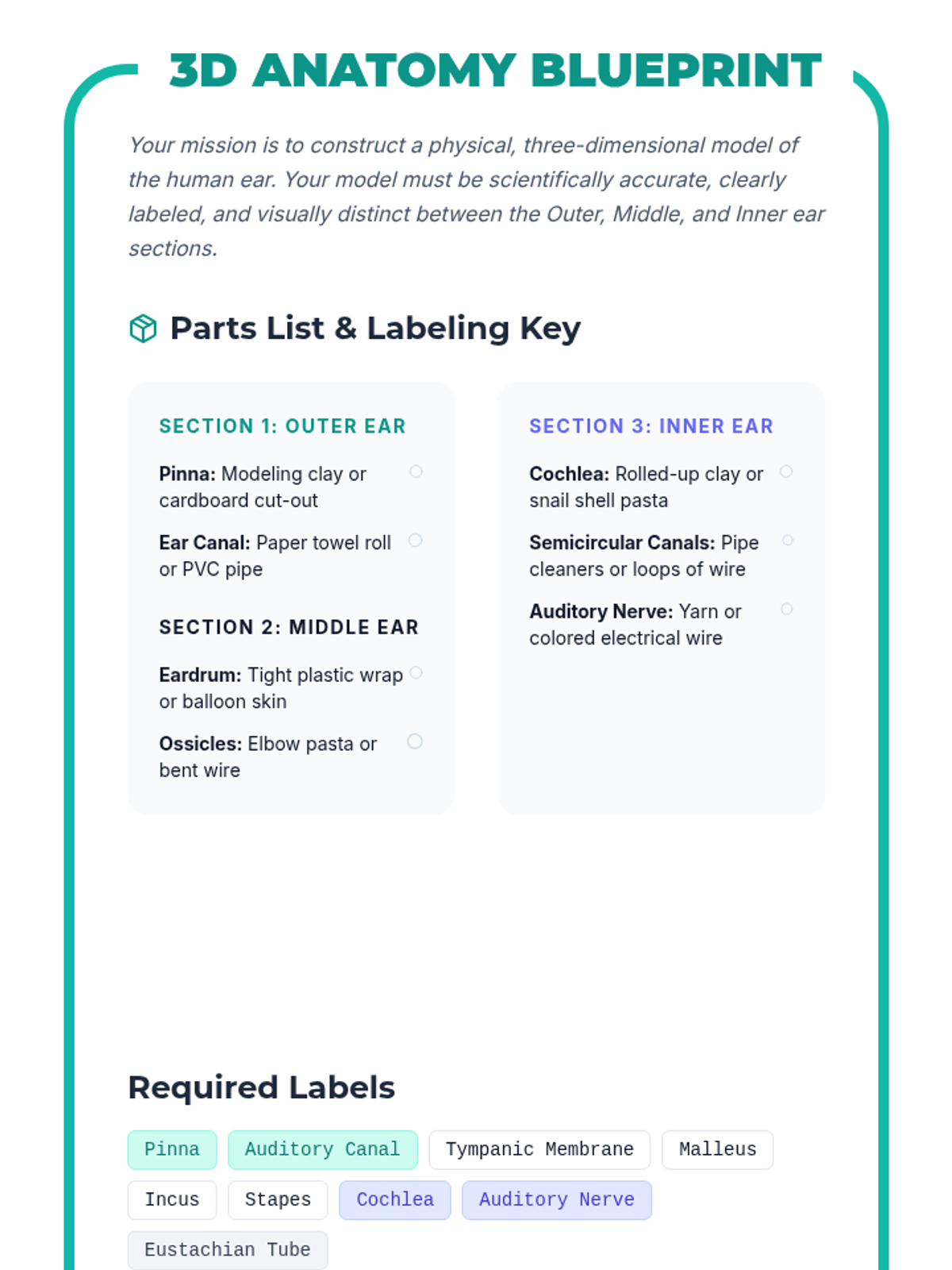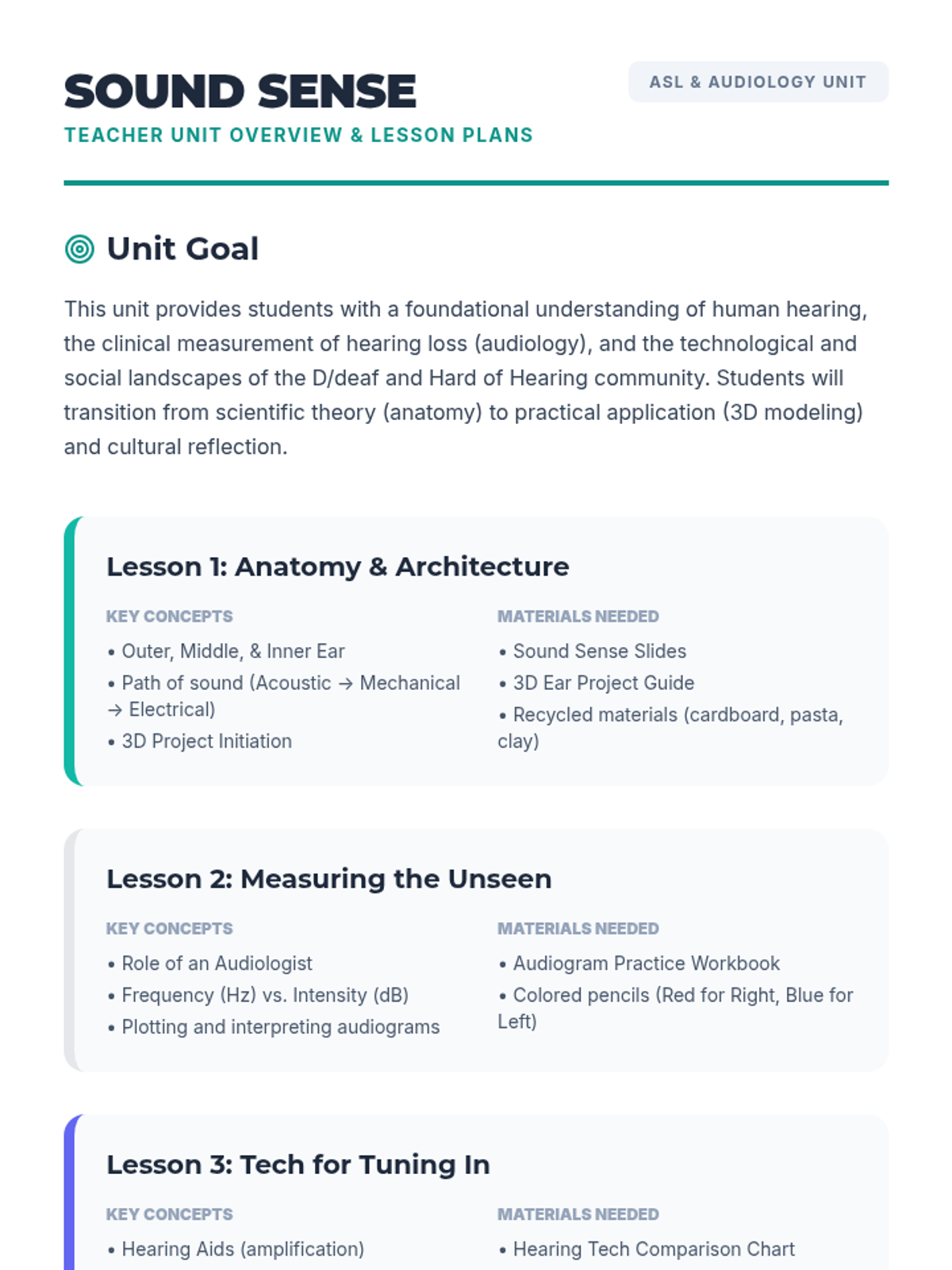 A comprehensive unit exploring the science of hearing, the technology used to assist hearing loss, and the personal impact of being D/deaf or hard of hearing. Students will build a 3D ear model, learn to read audiograms, and understand the difference between hearing aids and cochlear implants.