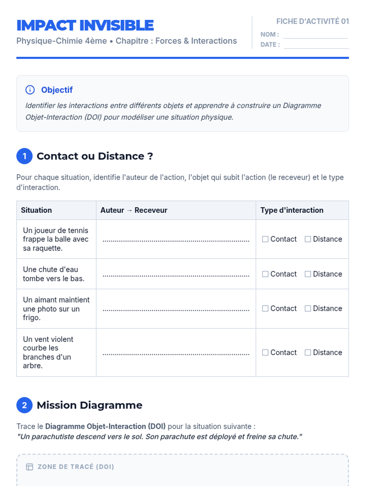 Une séquence complète sur les forces et les interactions pour le niveau 4ème, centrée sur la modélisation par des vecteurs. Les élèves explorent les types d'interactions, apprennent à représenter les forces par des segments fléchés et utilisent le dynamomètre.