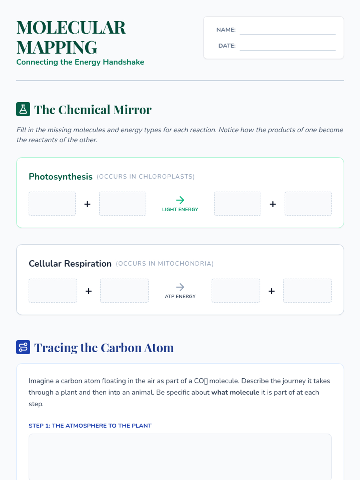 A 2-3 day project-based learning sequence where students explore the relationship between photosynthesis and cellular respiration, culminating in a creative project where they explain the cycling of matter and flow of energy in ecosystems.