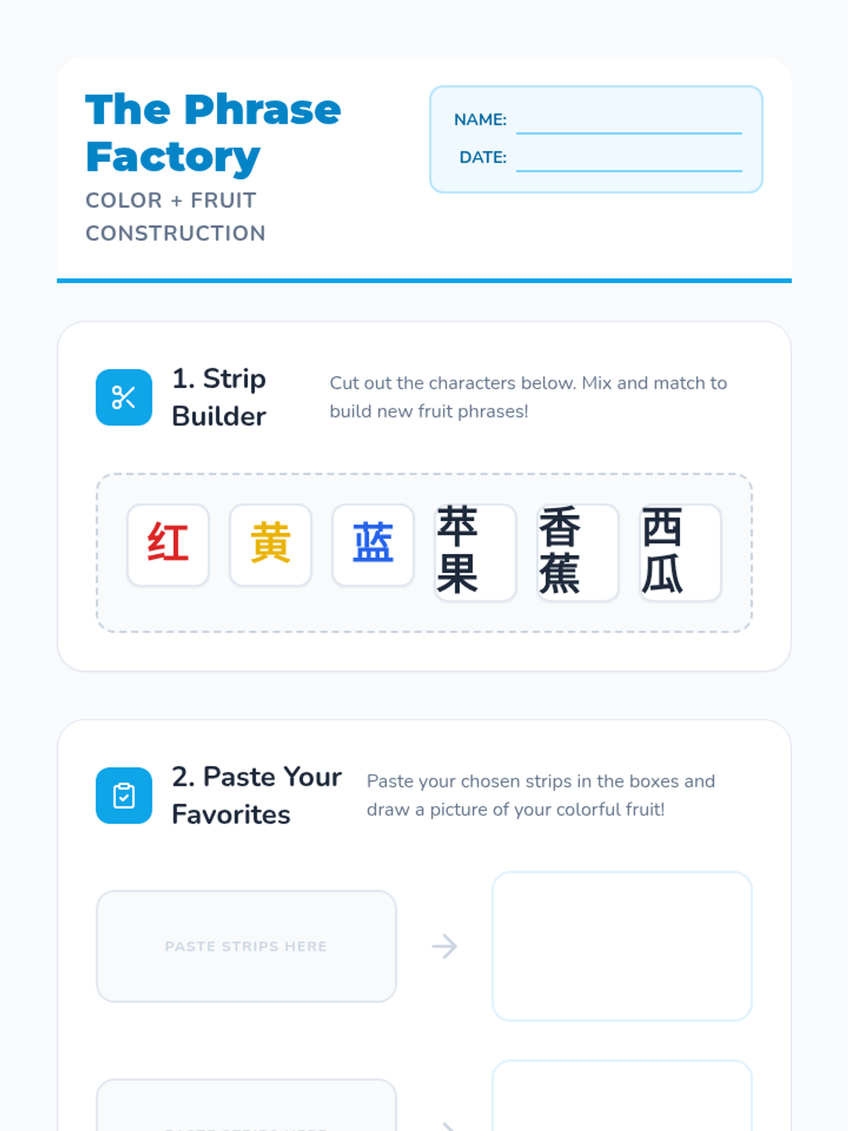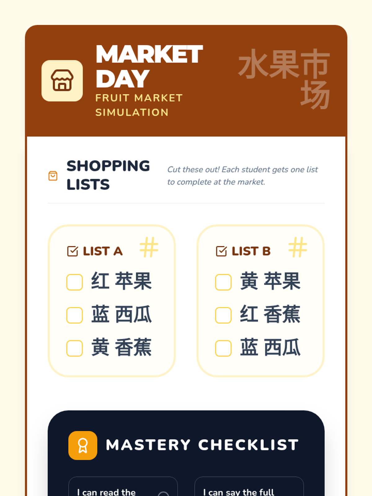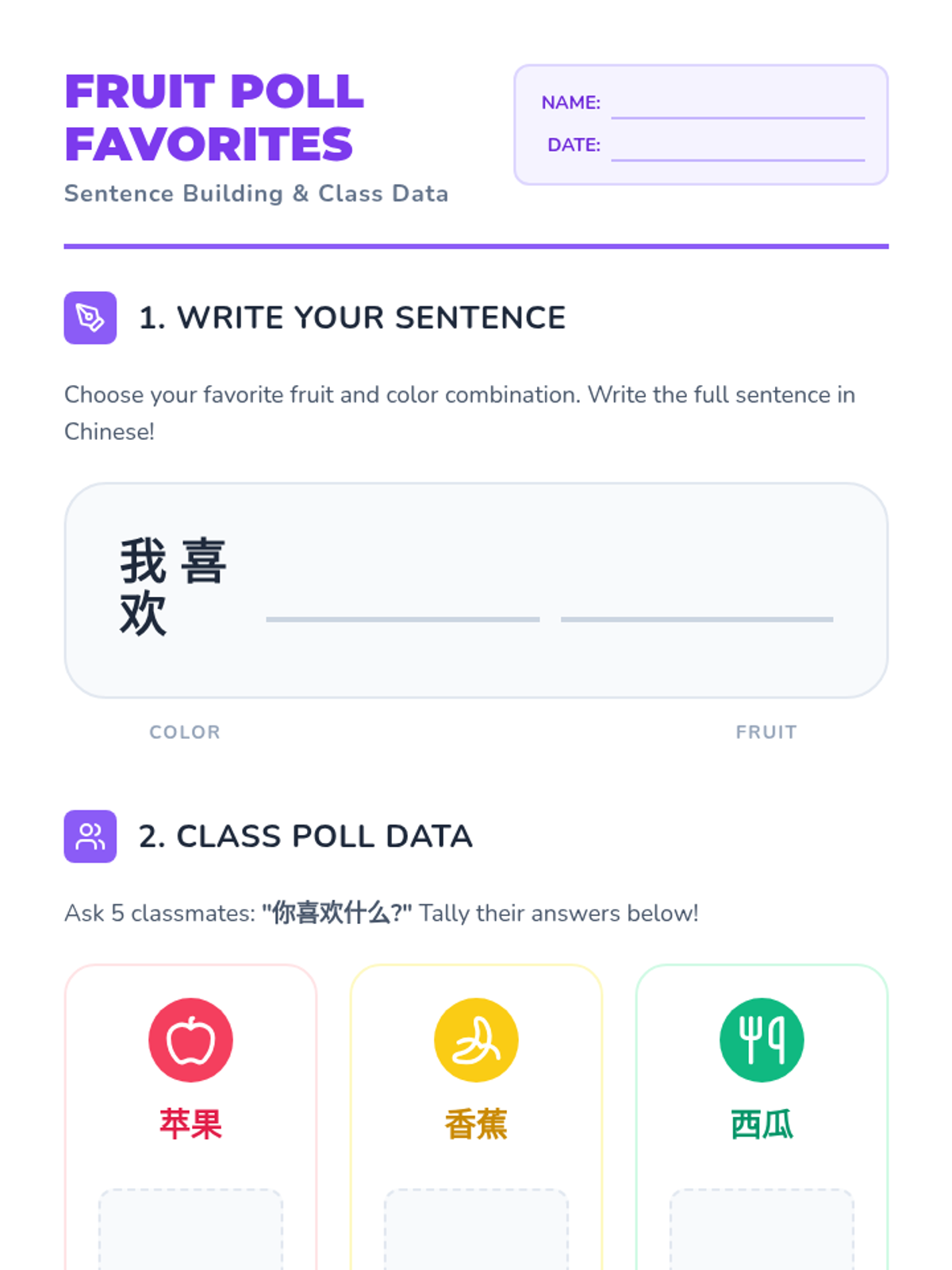 This sequence introduces 2nd-grade students to basic Mandarin Chinese characters for colors and fruits. Students progress from writing single characters to constructing full 'Subject + Verb + Object' sentences, culminating in a real-world market simulation.