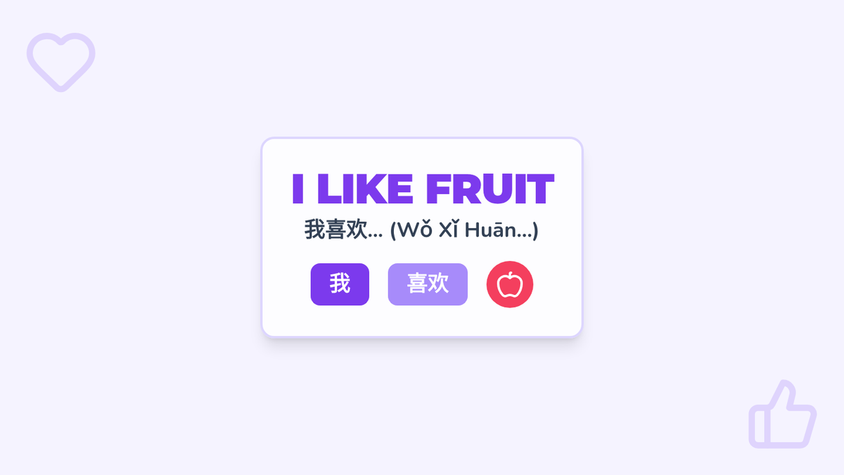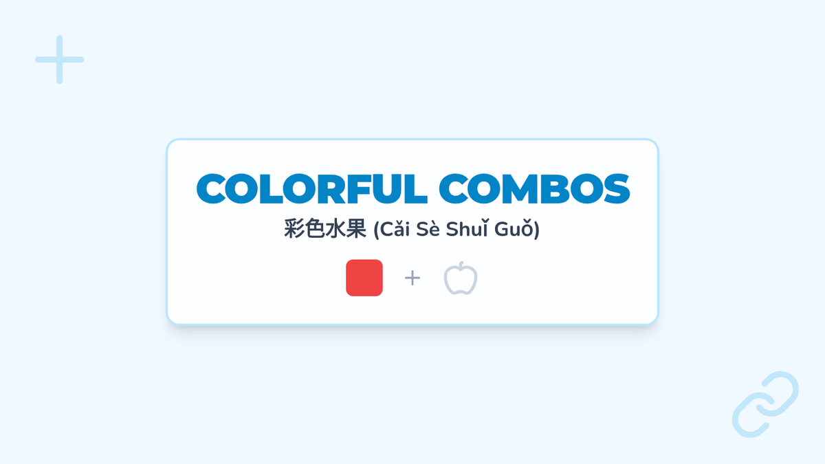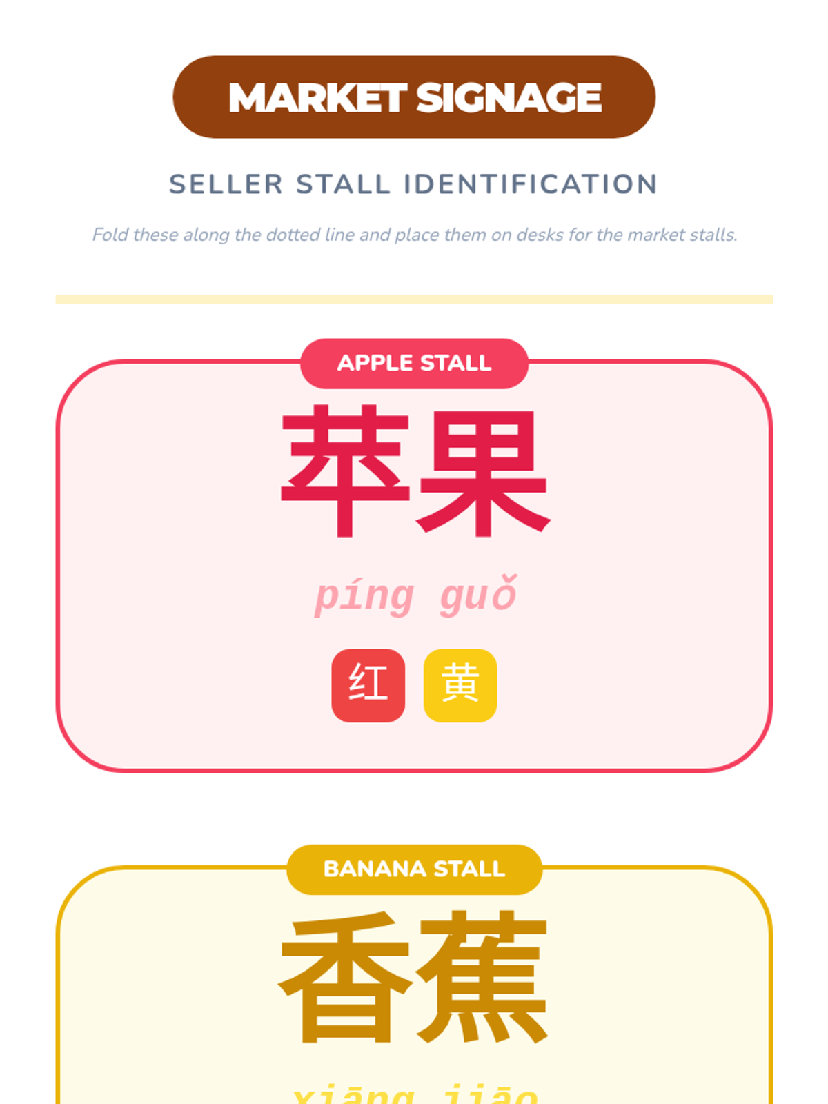 This sequence introduces 2nd-grade students to basic Mandarin Chinese characters for colors and fruits. Students progress from writing single characters to constructing full 'Subject + Verb + Object' sentences, culminating in a real-world market simulation.