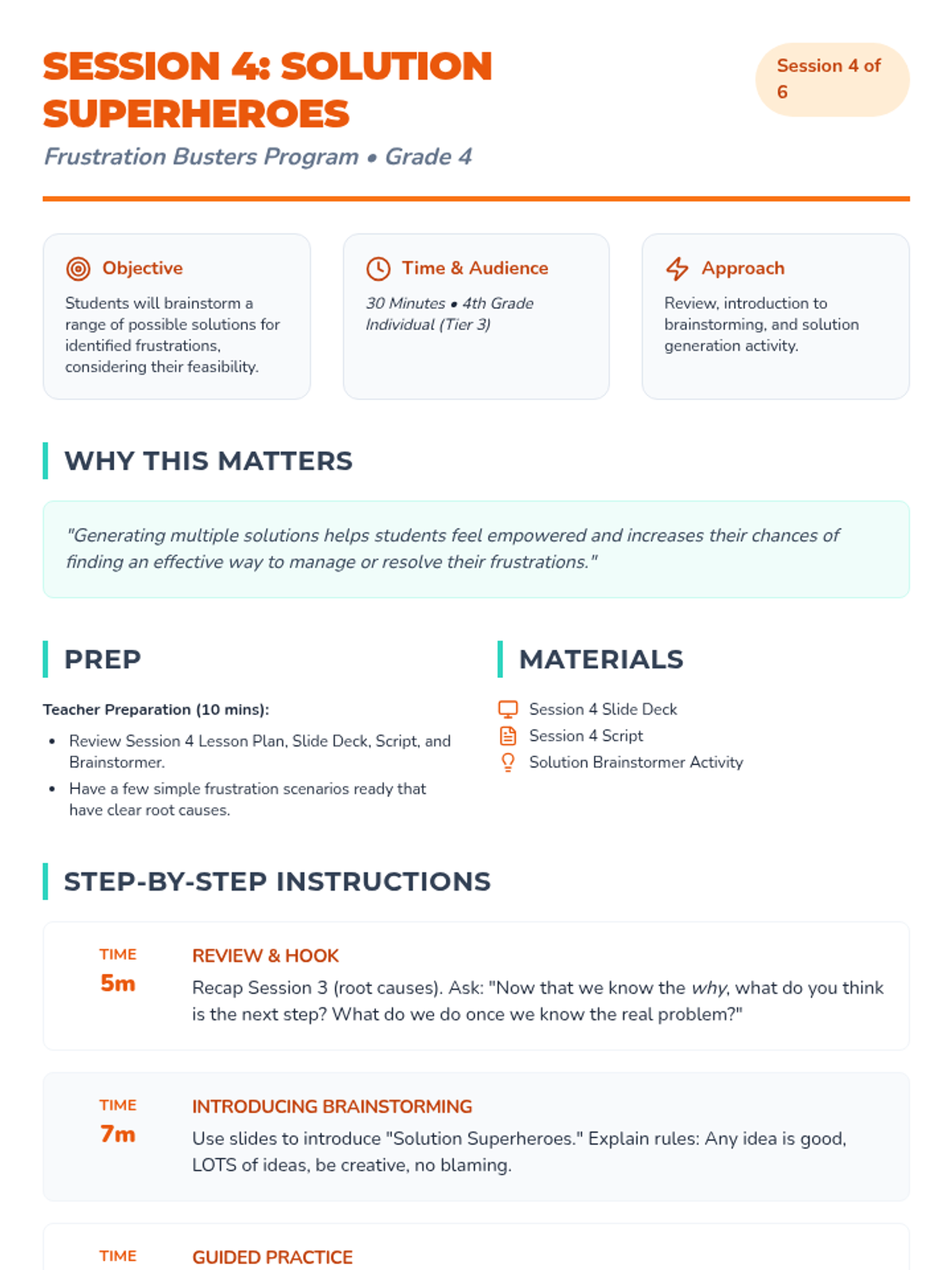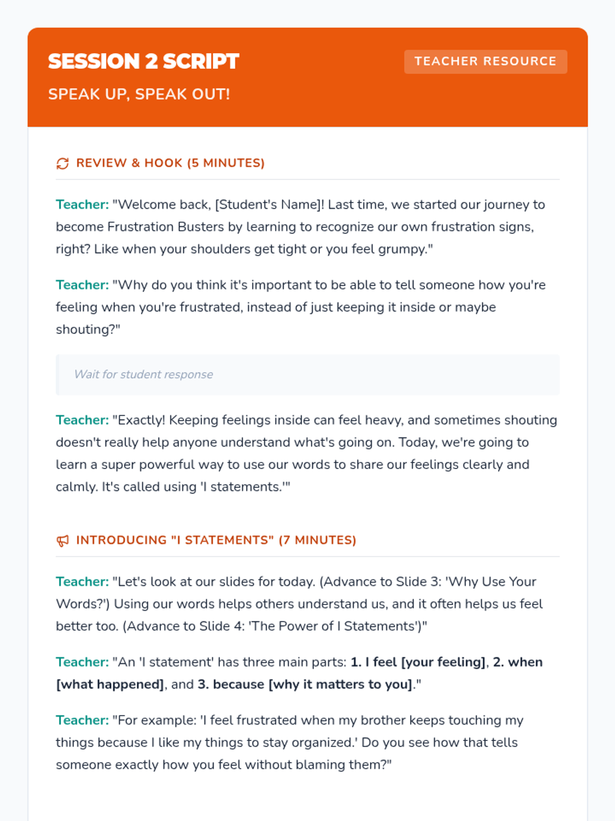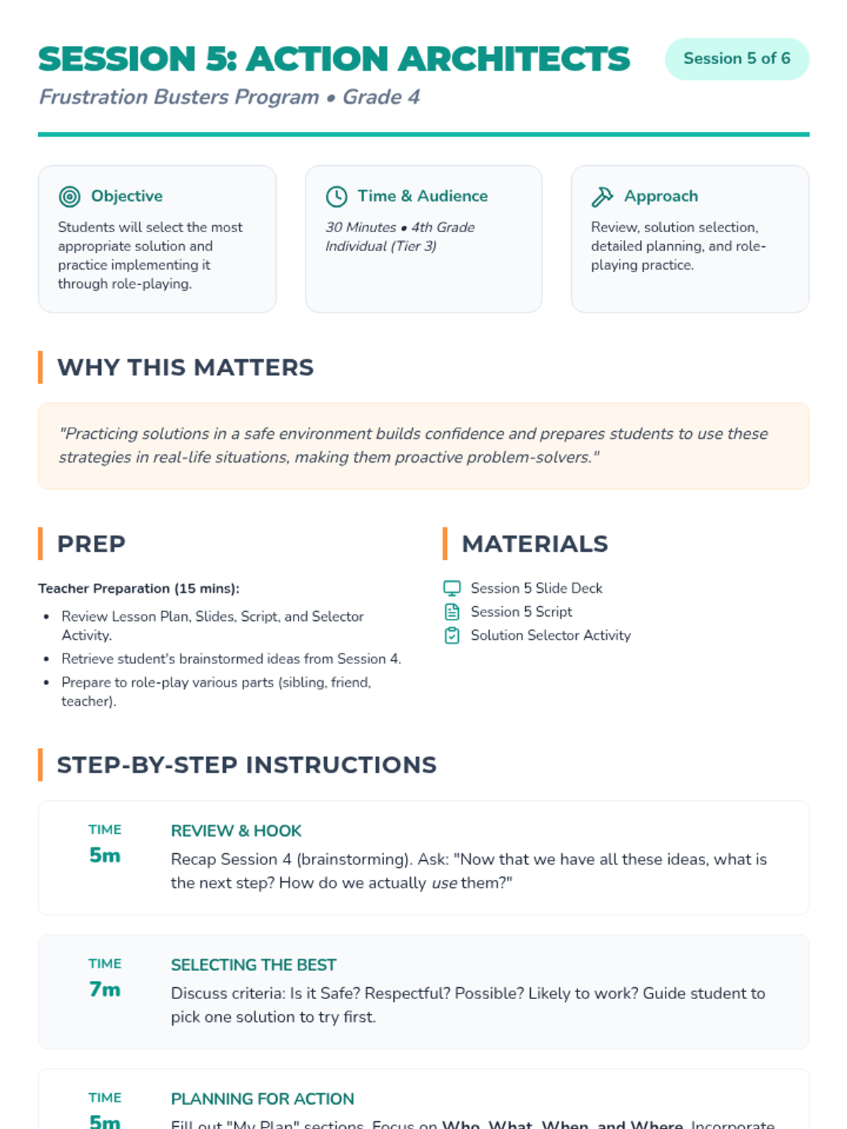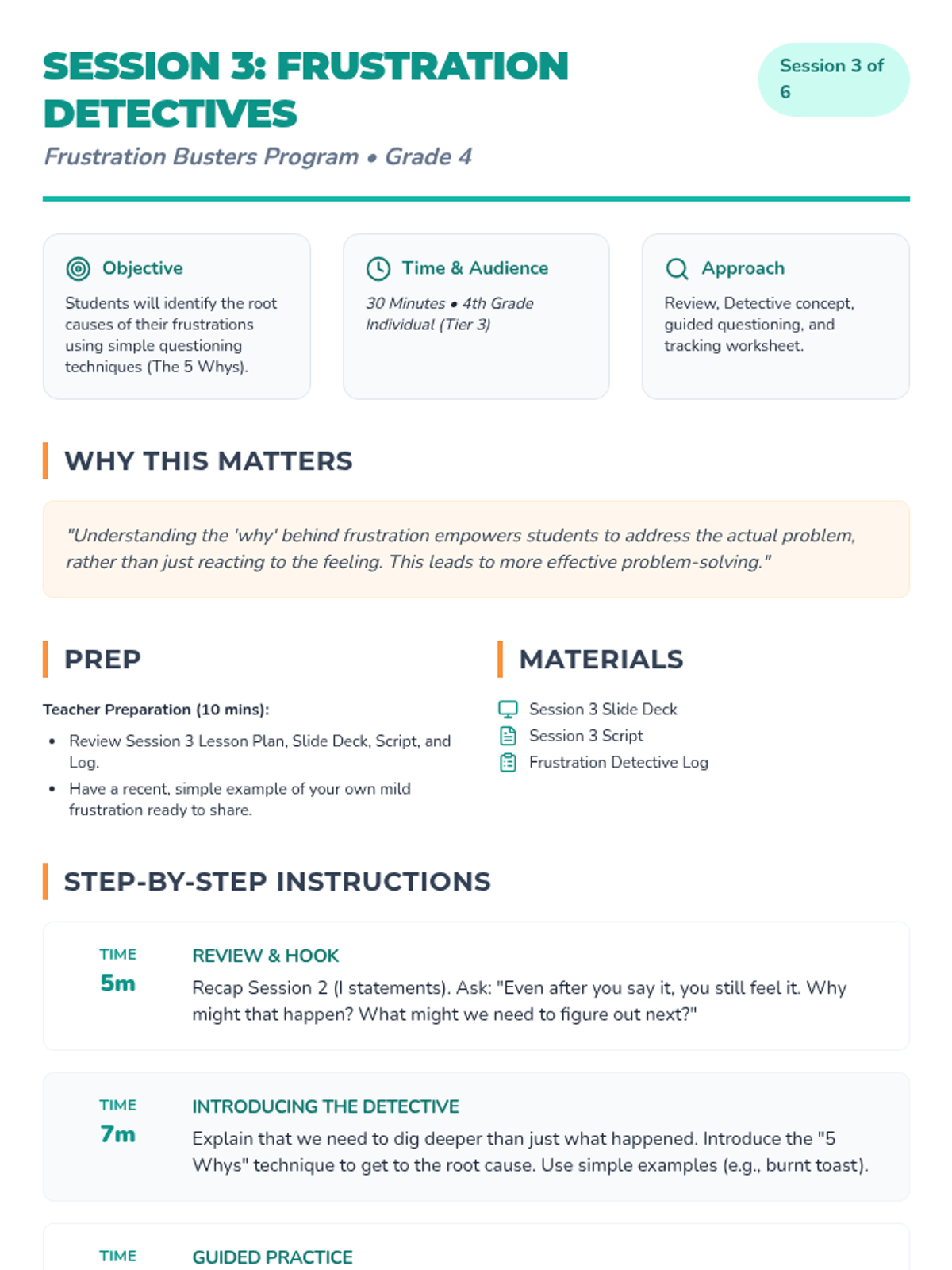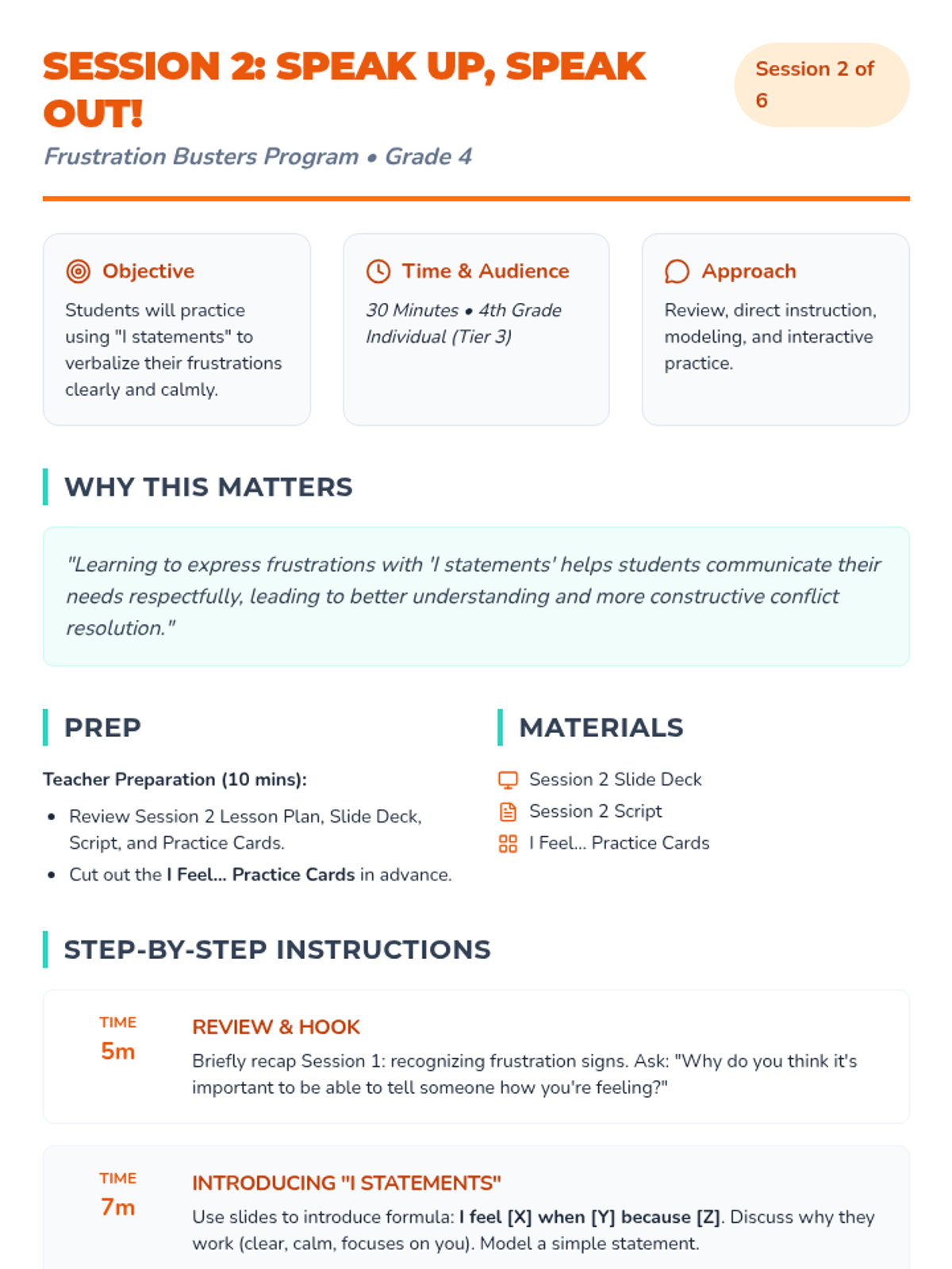 A 6-week Tier 3 intervention for 4th graders to develop emotional regulation and problem-solving skills to manage frustration. students learn to recognize triggers, express feelings with I-statements, and implement action plans.