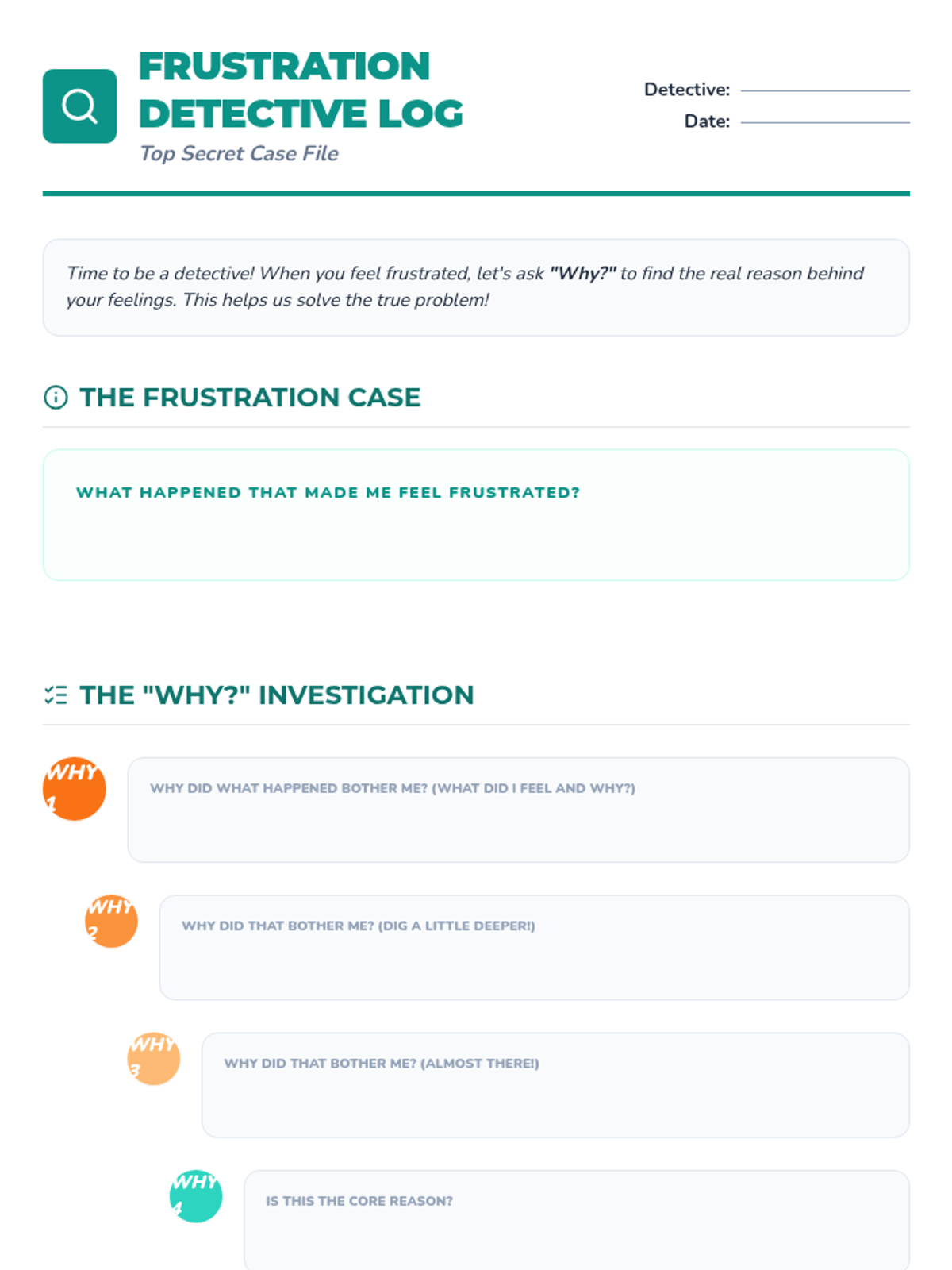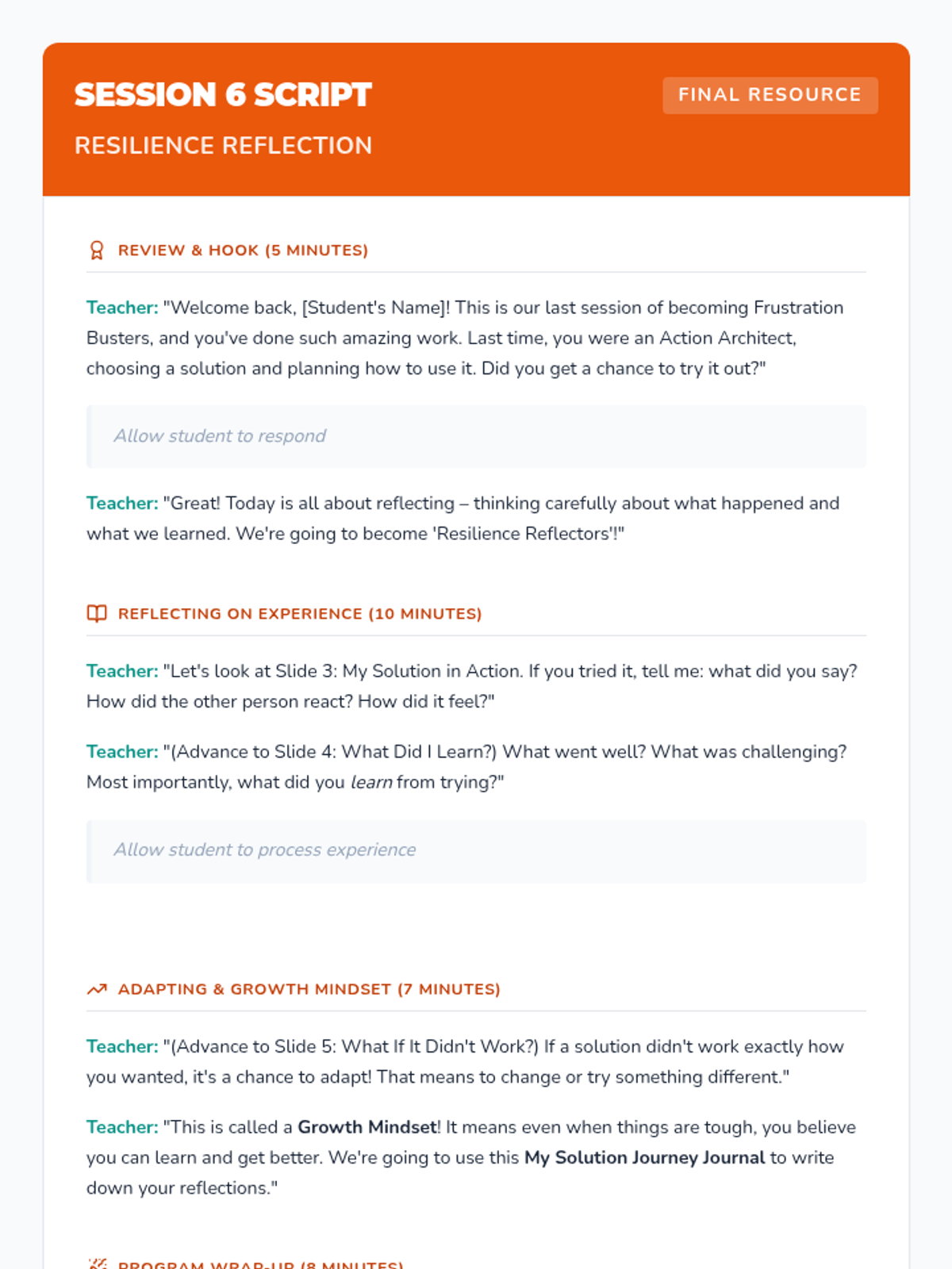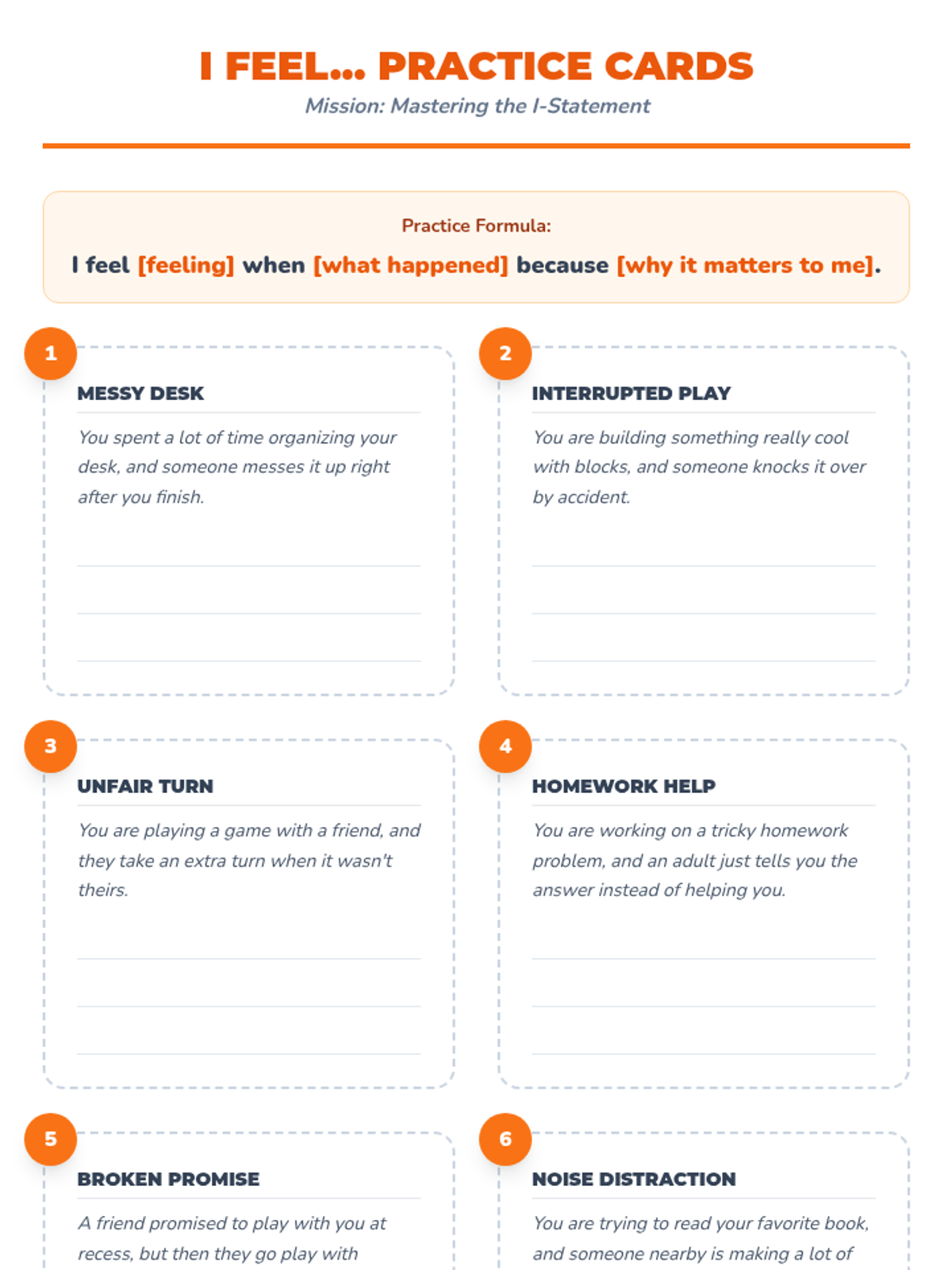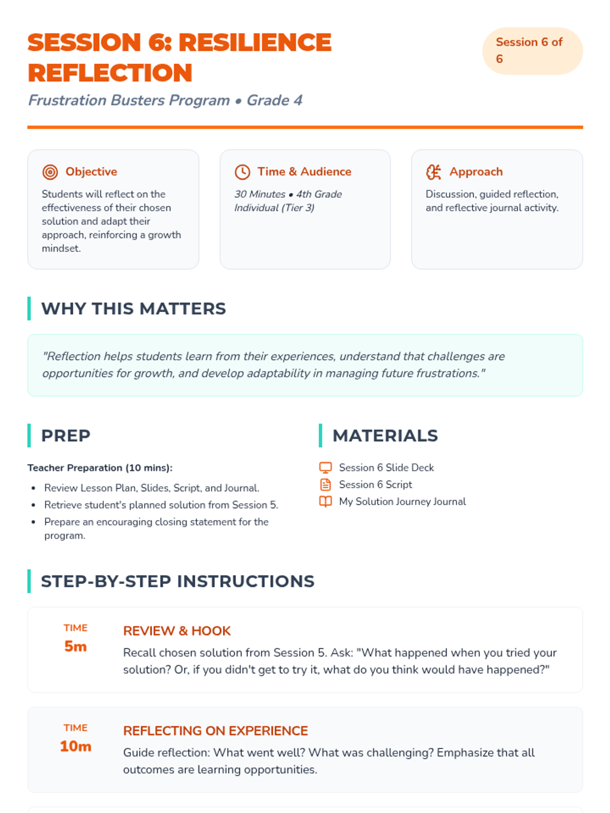 A 6-week Tier 3 intervention for 4th graders to develop emotional regulation and problem-solving skills to manage frustration. students learn to recognize triggers, express feelings with I-statements, and implement action plans.