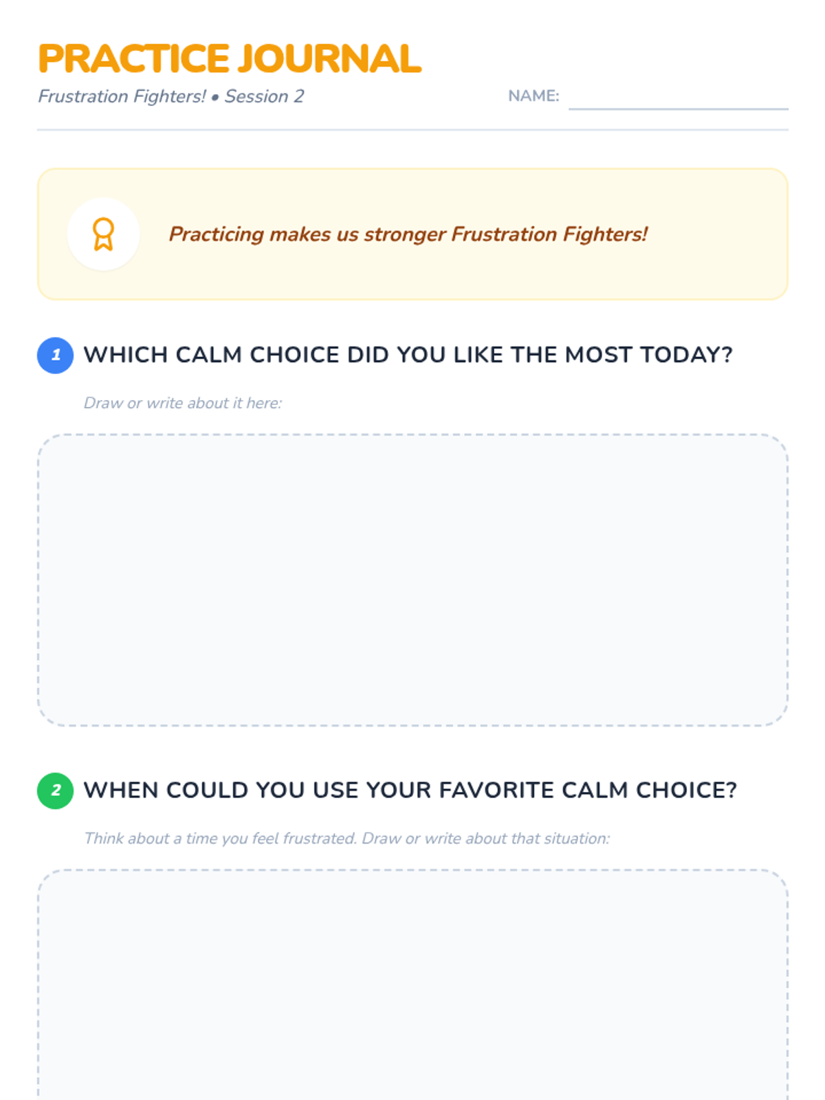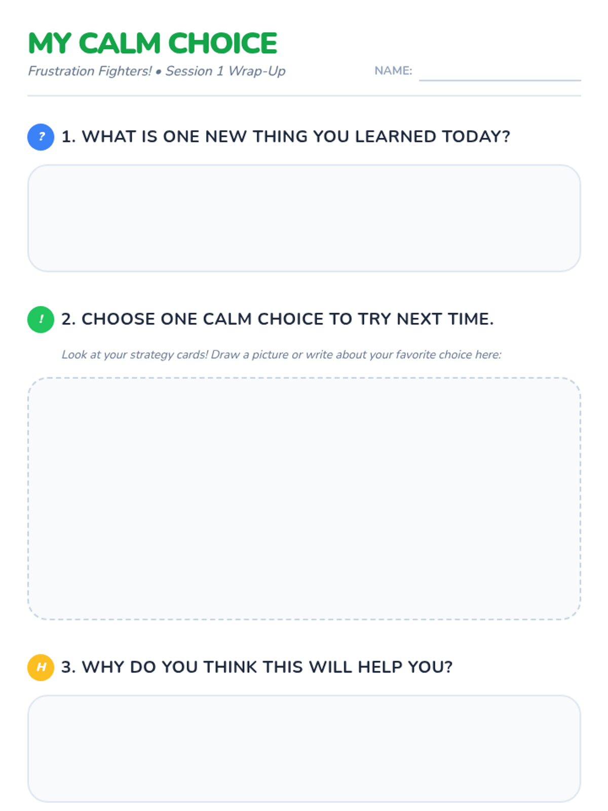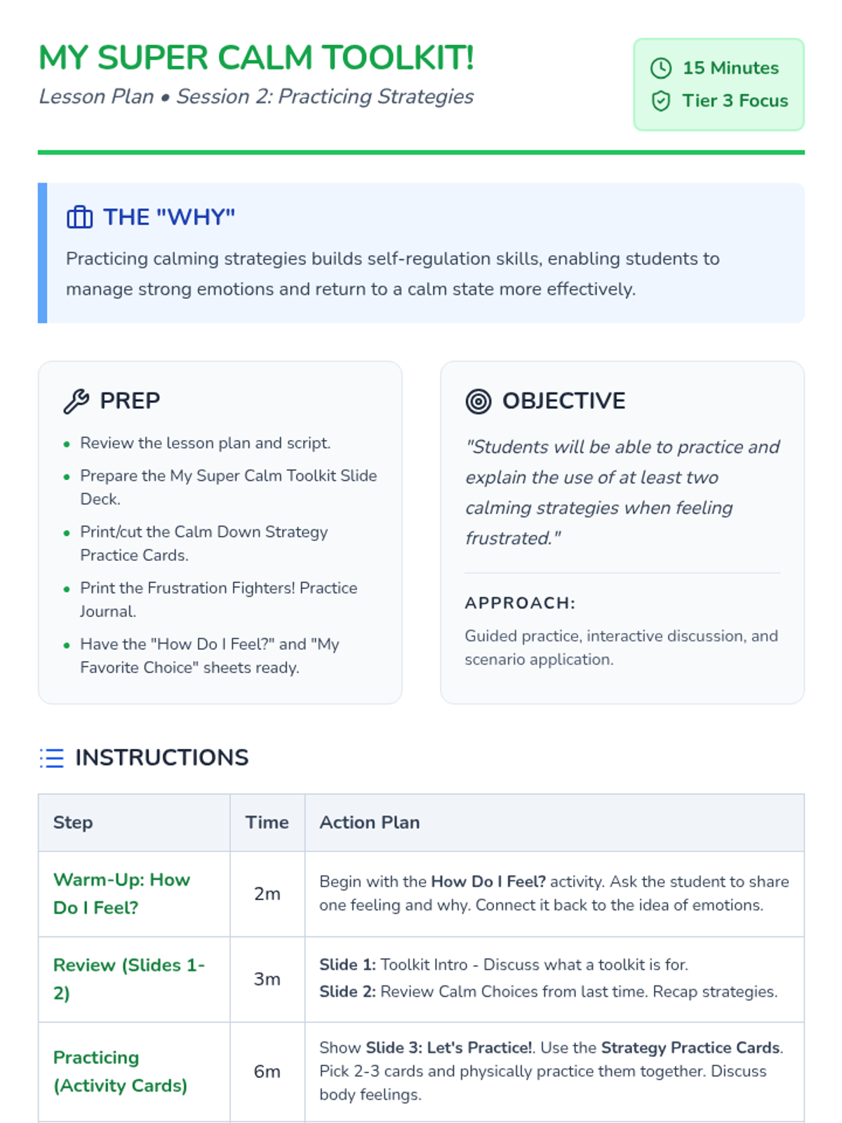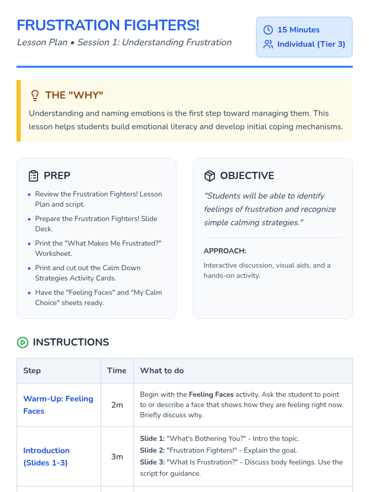 A two-session Tier 3 intervention for 2nd graders to identify frustration triggers and build a toolkit of effective calming strategies.
