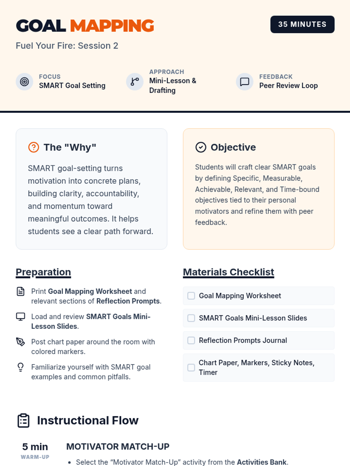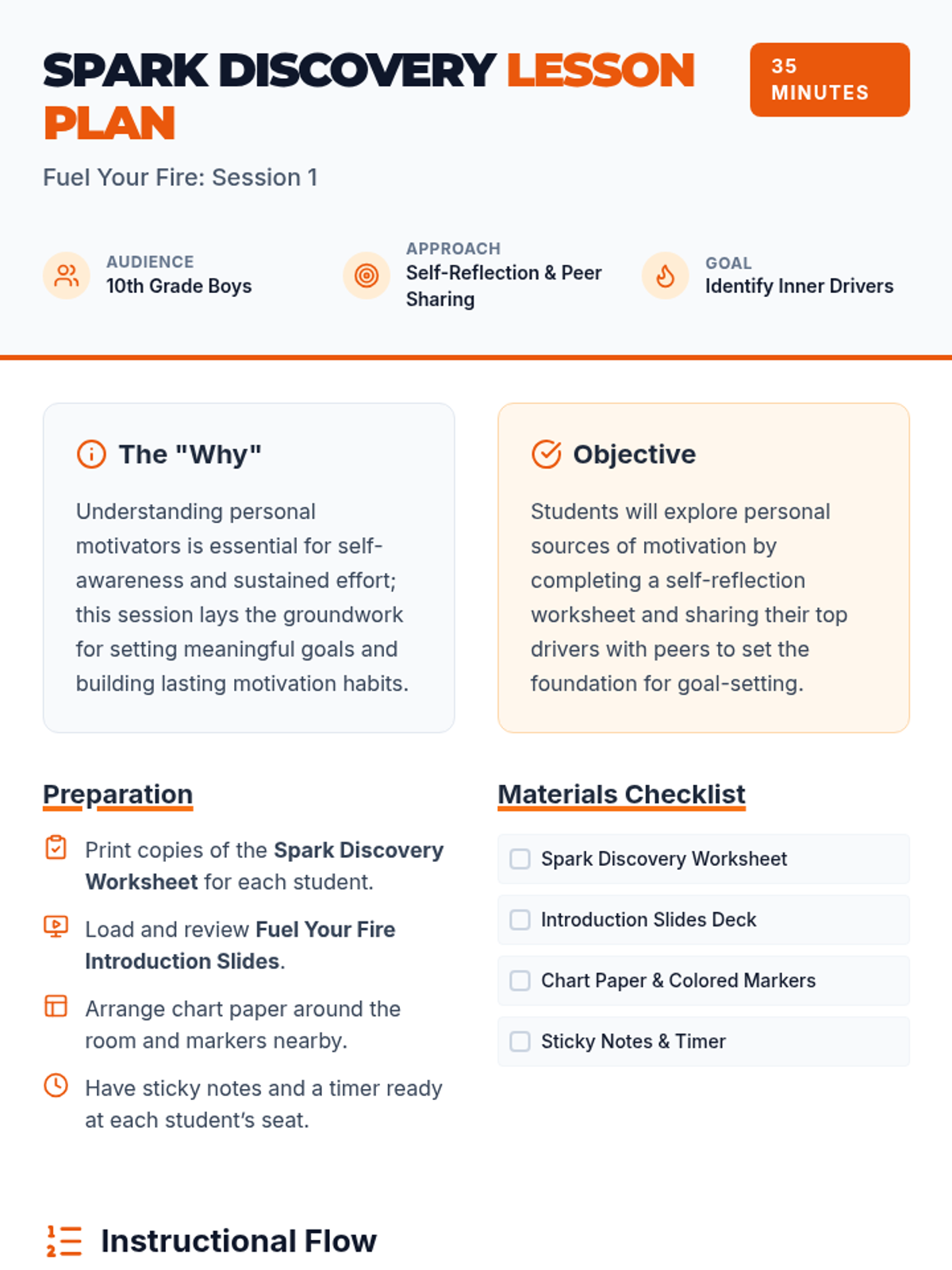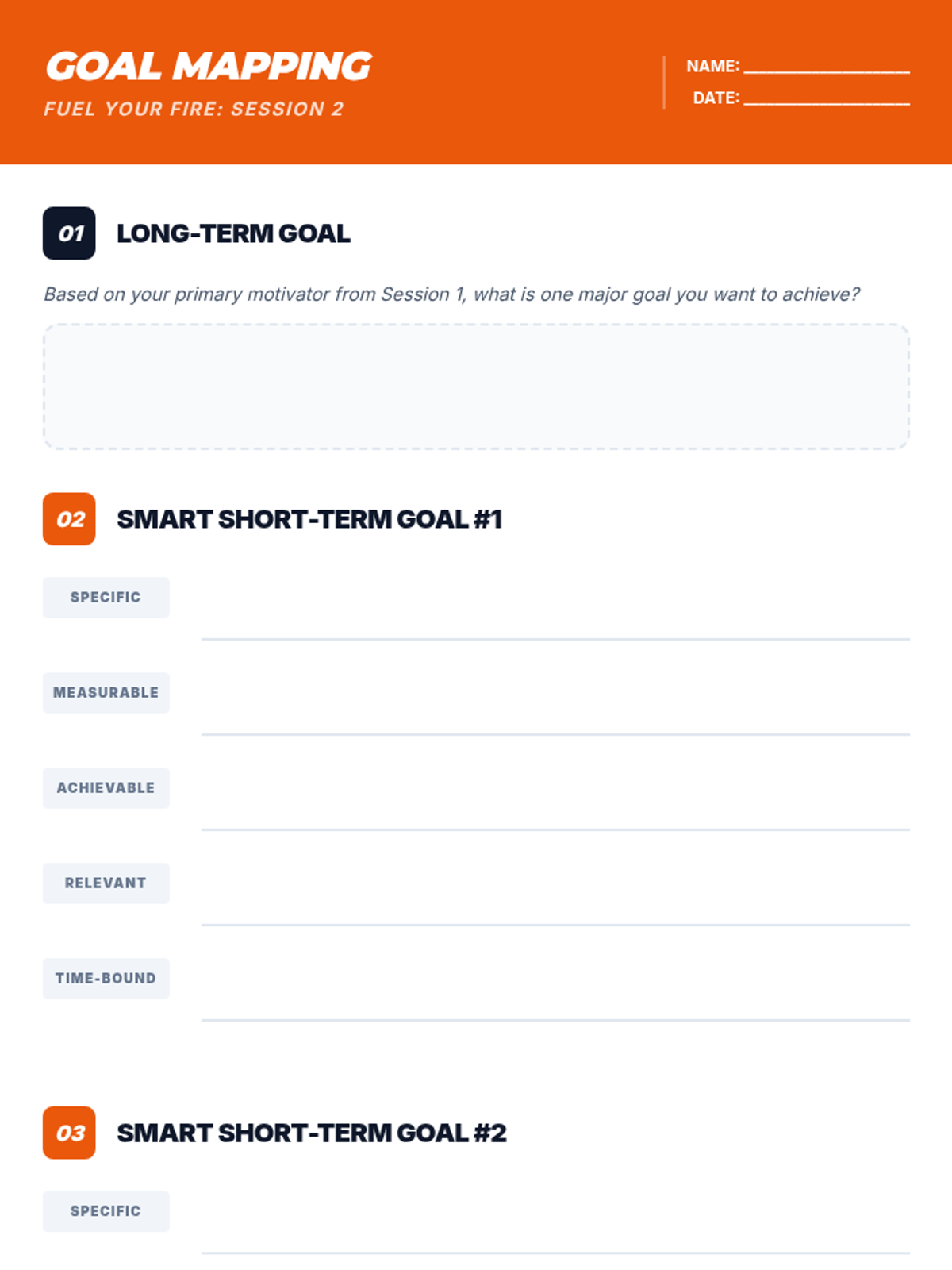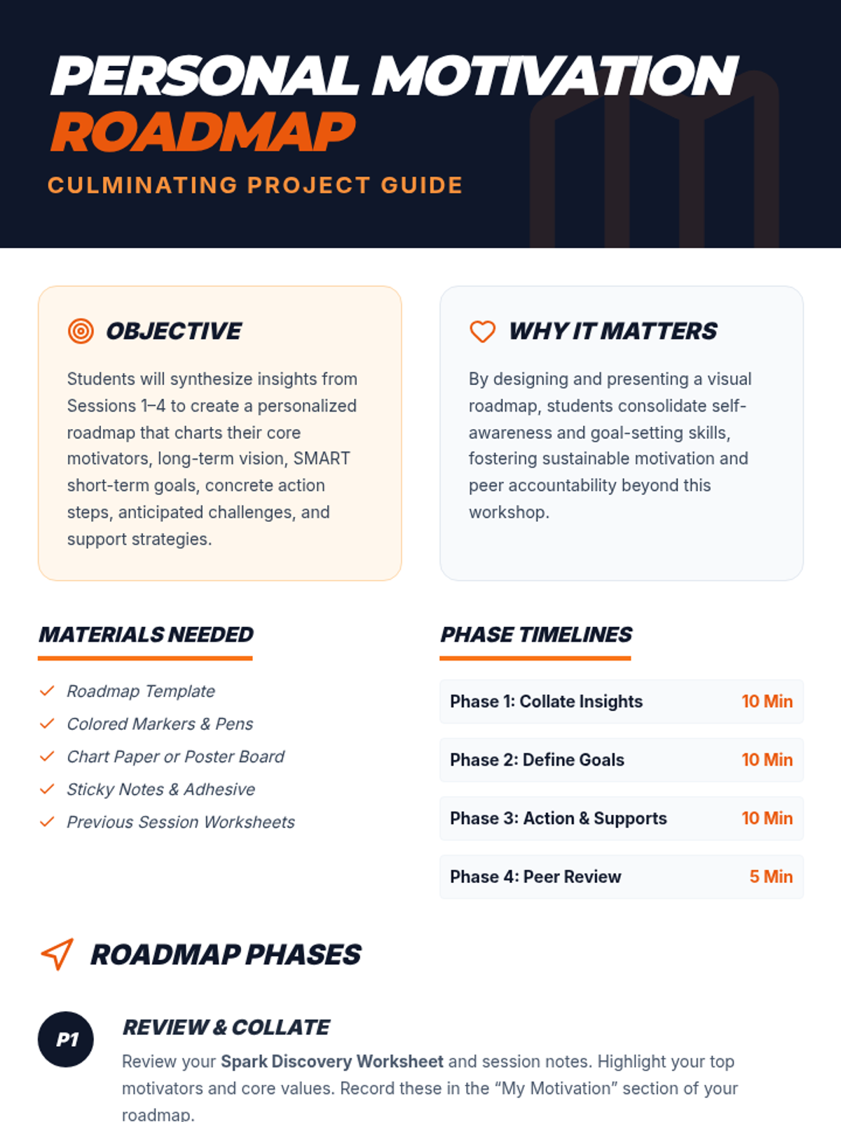 A 5-session motivation and goal-setting series for 10th-grade boys, focusing on identifying internal drivers, setting SMART goals, and creating a personal roadmap for success.