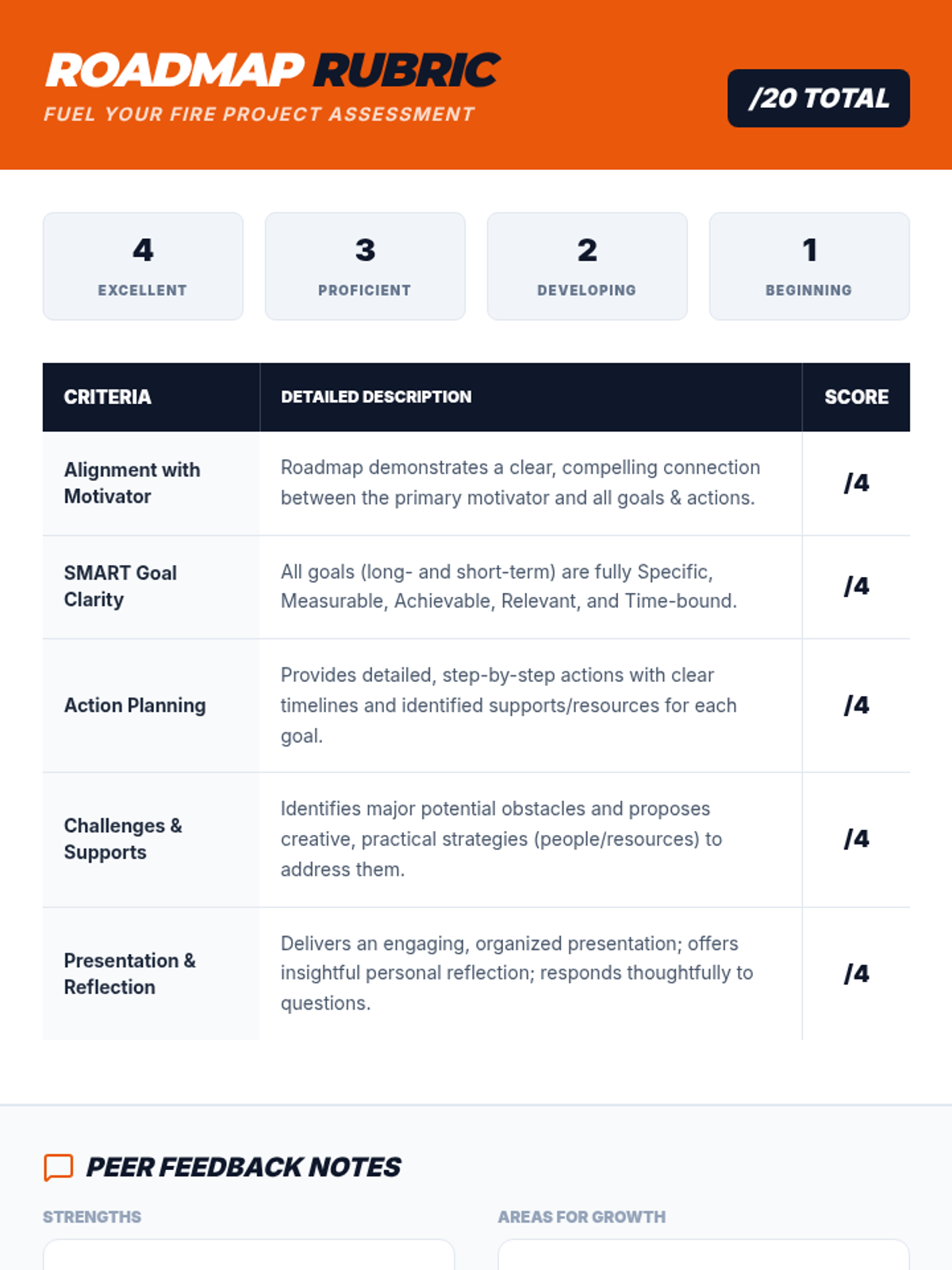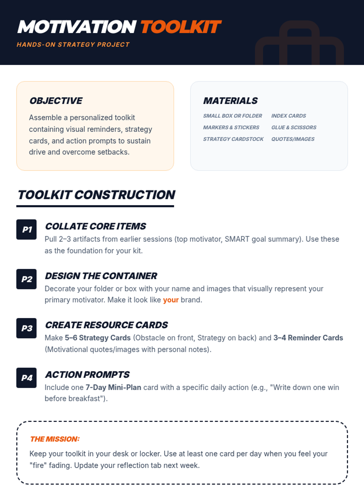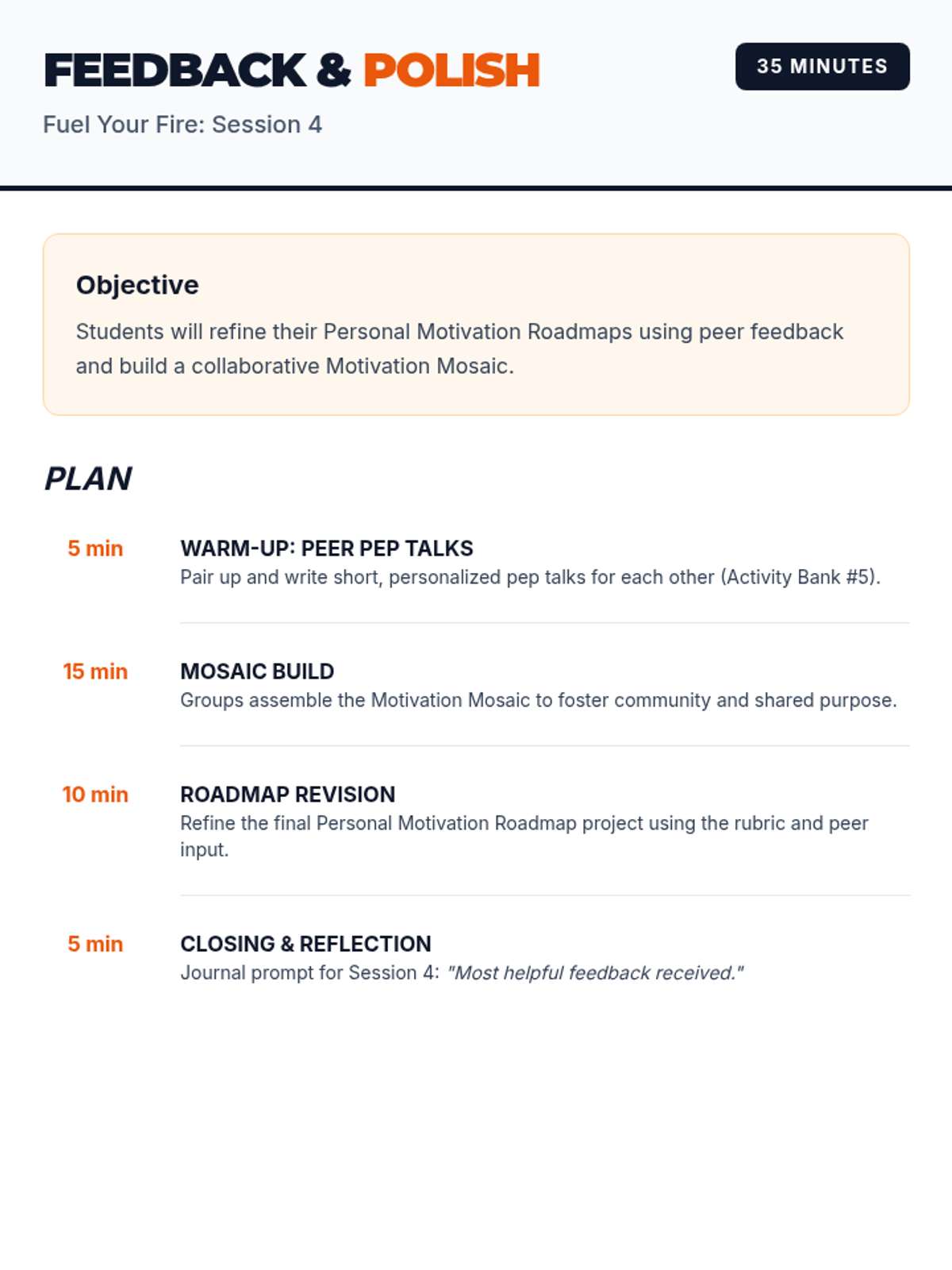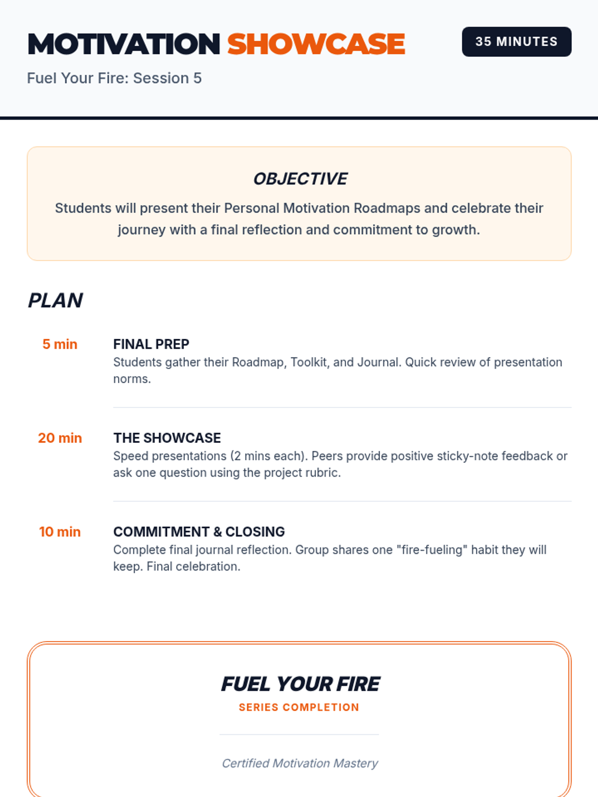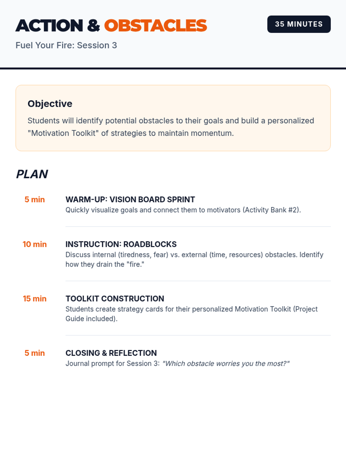 A 5-session motivation and goal-setting series for 10th-grade boys, focusing on identifying internal drivers, setting SMART goals, and creating a personal roadmap for success.