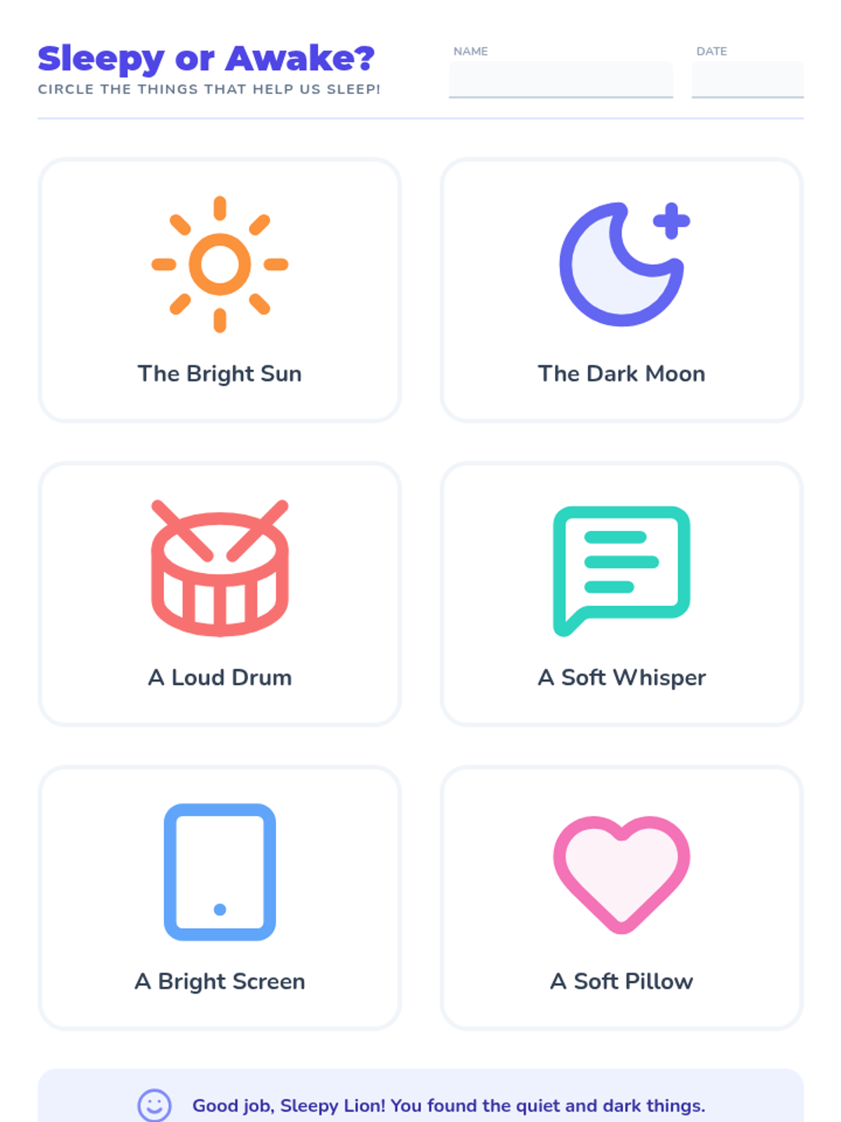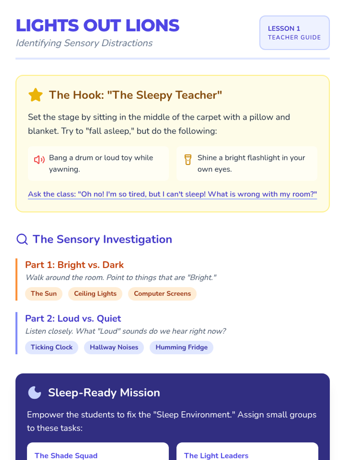 A sensory-focused project-based sequence for Pre-K students to learn how to create and manage their environment for better sleep and rest. Students explore light, sound, texture, and internal mindfulness tools to design their own 'Sleep Kit'.