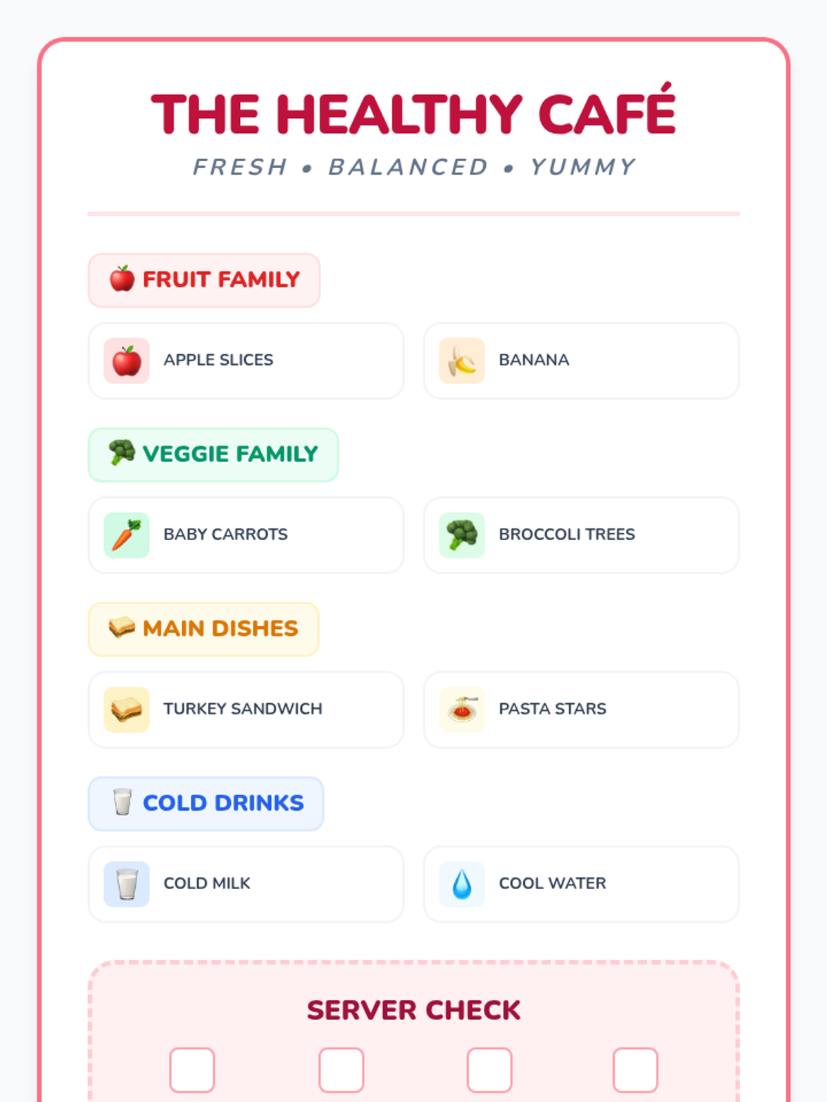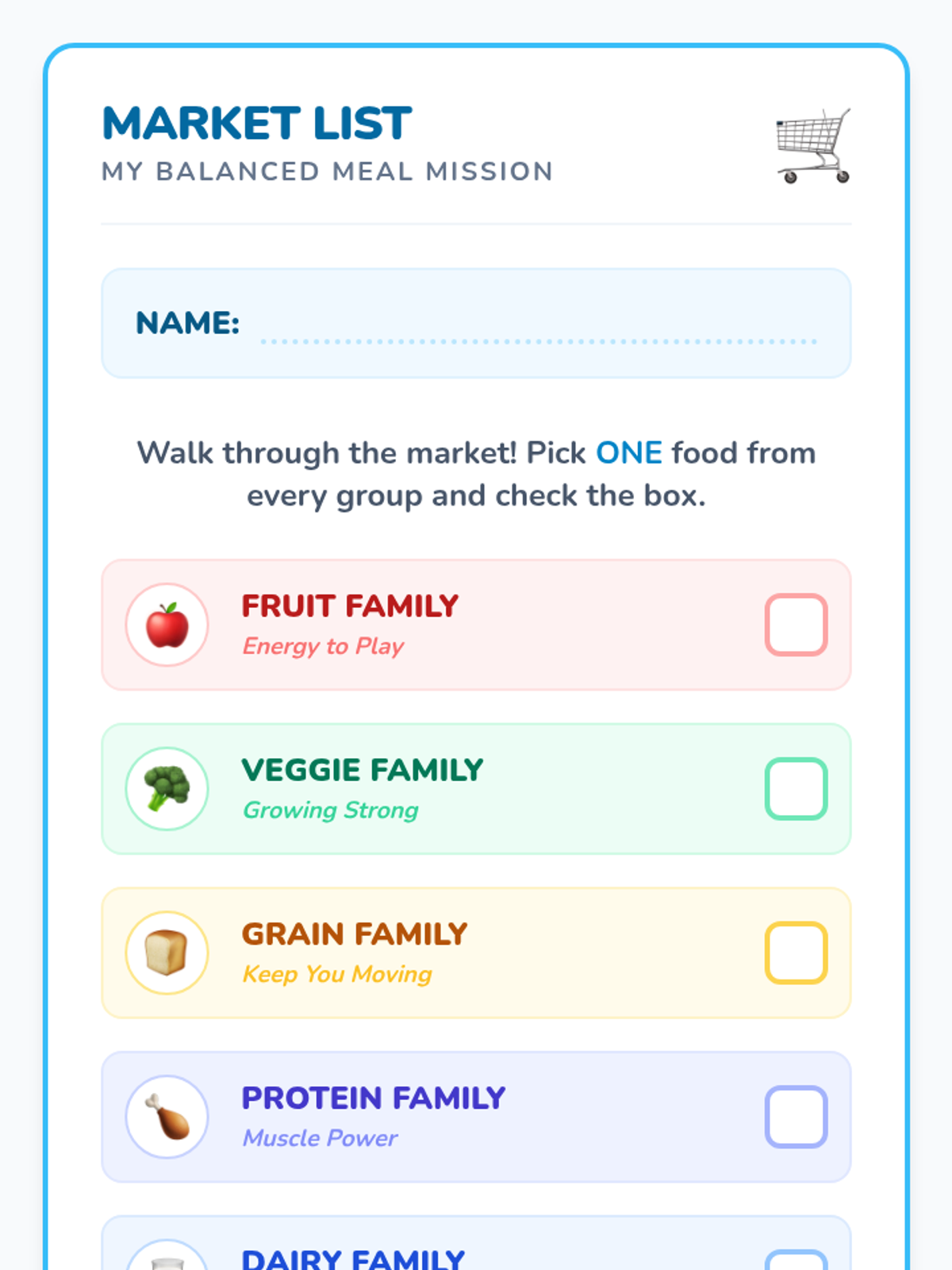 A vibrant, song-filled introduction to the five food groups for early learners. Students explore the Rainbow Garden (fruits and veggies), the Strength Squad (protein and dairy), and the Energy Engine (grains) through interactive scripts and catchy melodies.