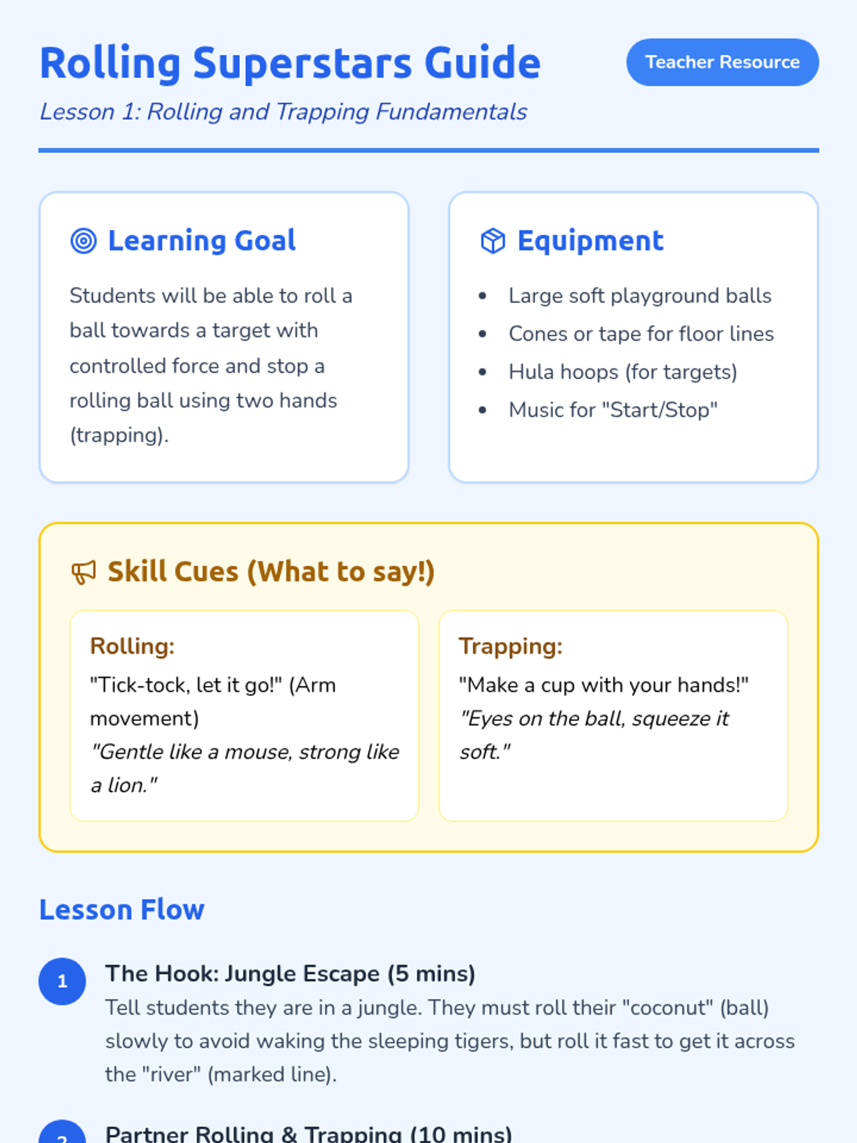 This sequence introduces Pre-K students to fundamental manipulative skills through play-based activities focusing on hand-eye and foot-eye coordination. Students practice rolling, trapping, underhand tossing, catching, kicking, and striking objects in a safe, energetic environment.