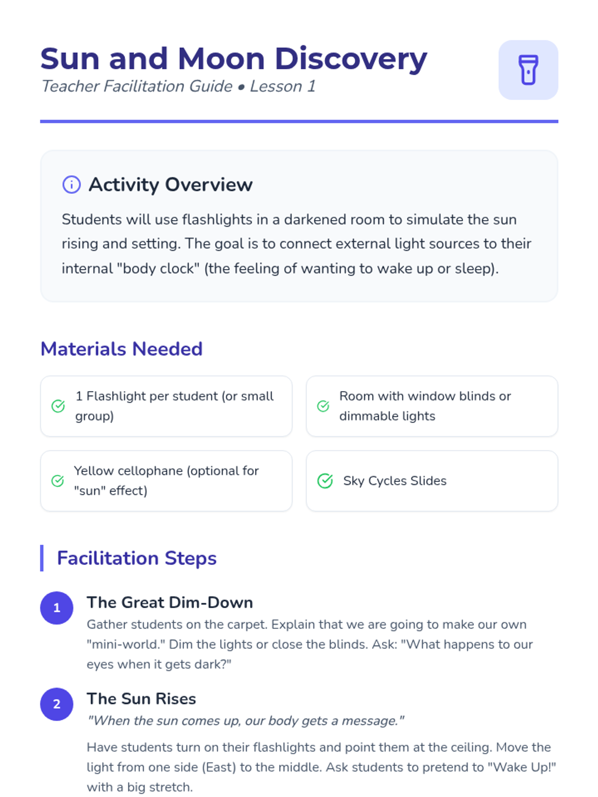 A Pre-K sequence focused on helping children understand their internal body clocks and the physical signs of tiredness. Students explore light and dark cycles, animal sleep patterns, and the metaphor of 'recharging' to develop self-awareness and healthy rest habits.