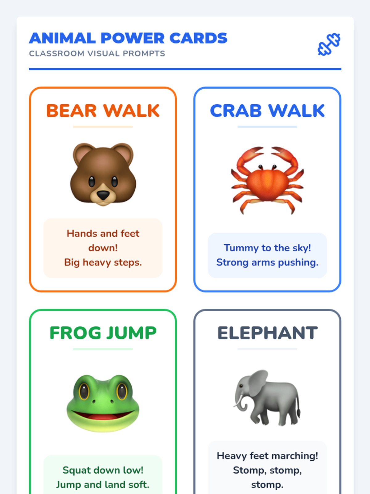 A Pre-K sequence introducing flexibility and body awareness through imaginative animal-inspired movements. Students explore vertical, lateral, seated, and rotational stretches to improve gross motor control and learn how to cool down their bodies.
