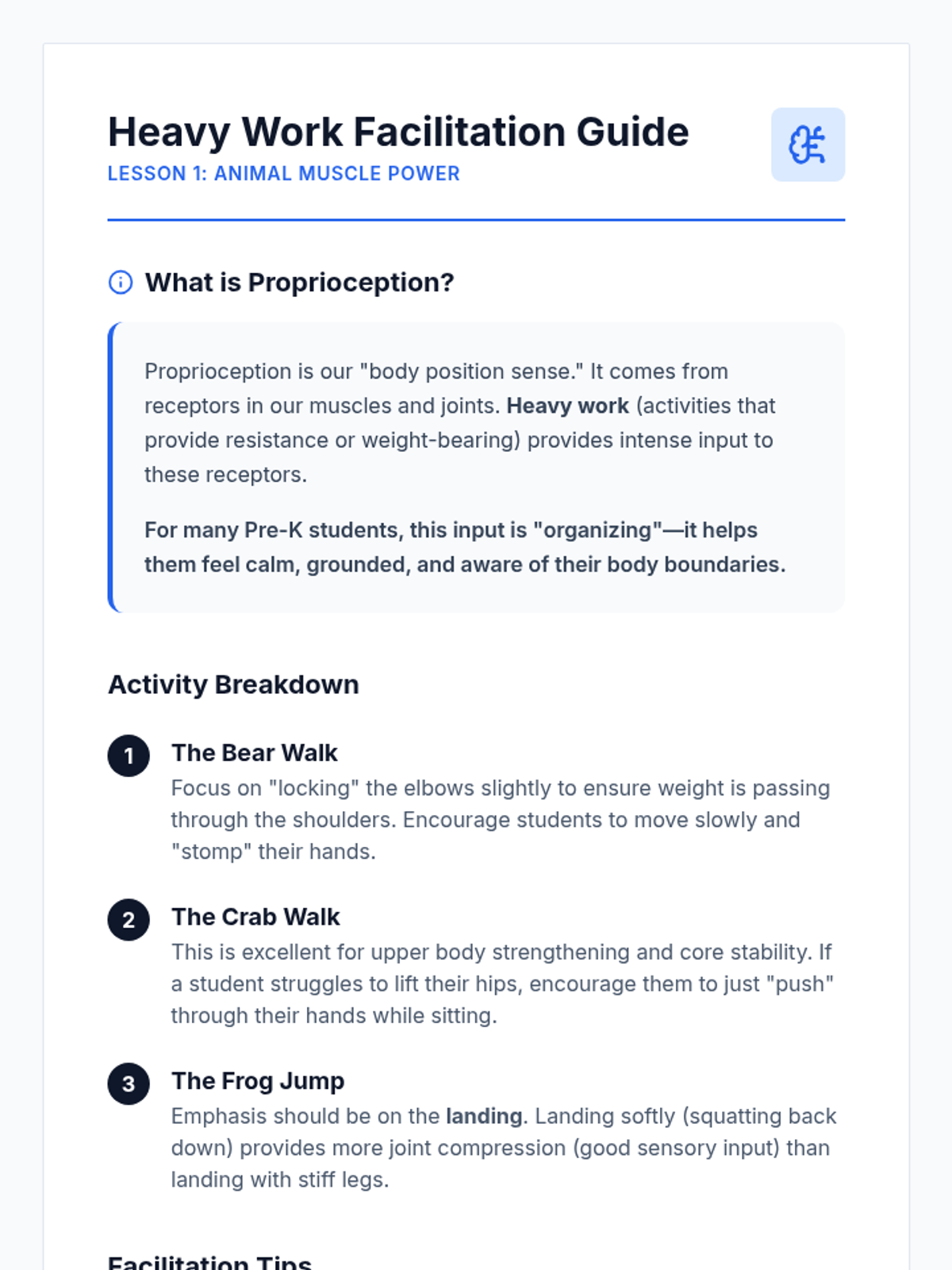 A comprehensive sequence for Pre-K students to learn and utilize proprioceptive 'heavy work' activities. Students explore how pushing, pulling, and weight-bearing movements help regulate their nervous systems for smoother transitions and better focus.