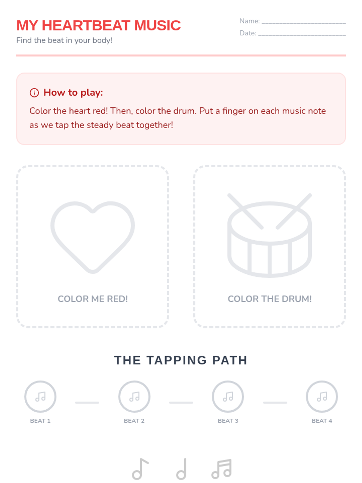 A sequence for Pre-K students focused on developing rhythmic awareness through auditory discrimination and movement synchronization. Students explore the concepts of steady beat, marching in time, tempo (fast/slow), impulse control (freeze dance), and body percussion patterns.
