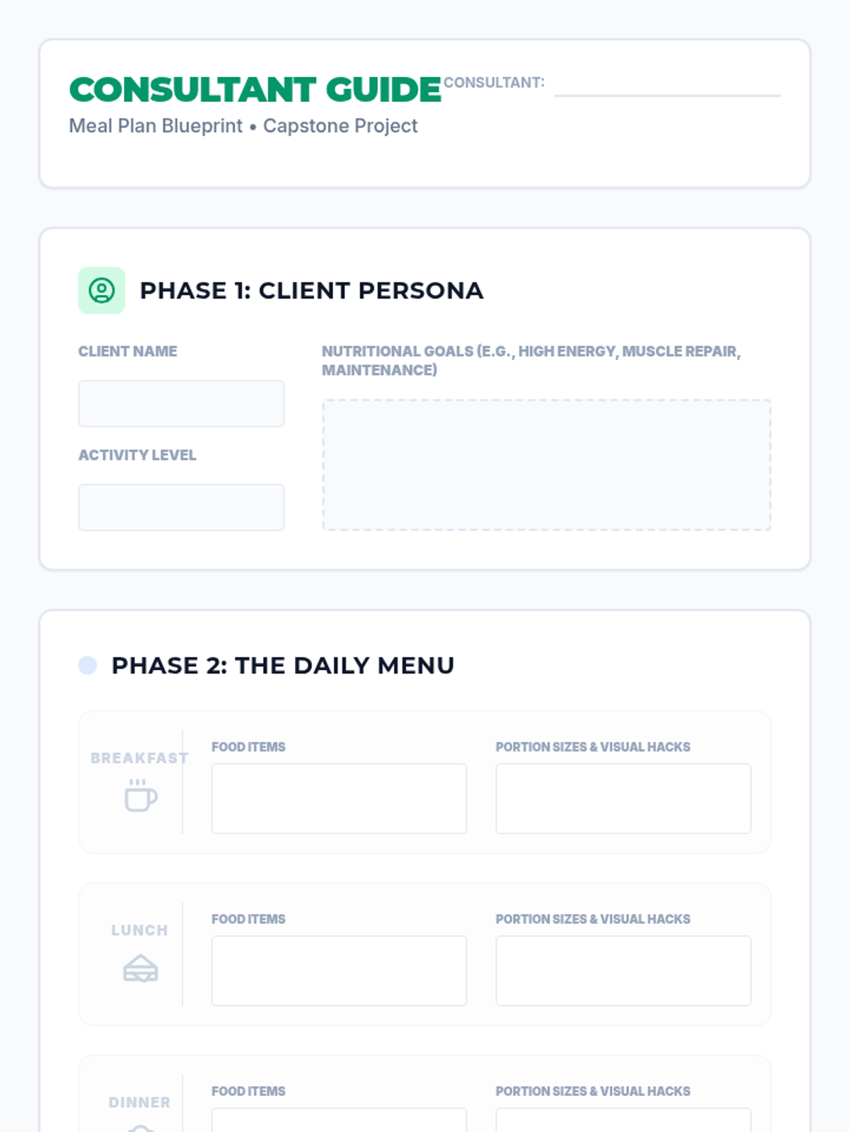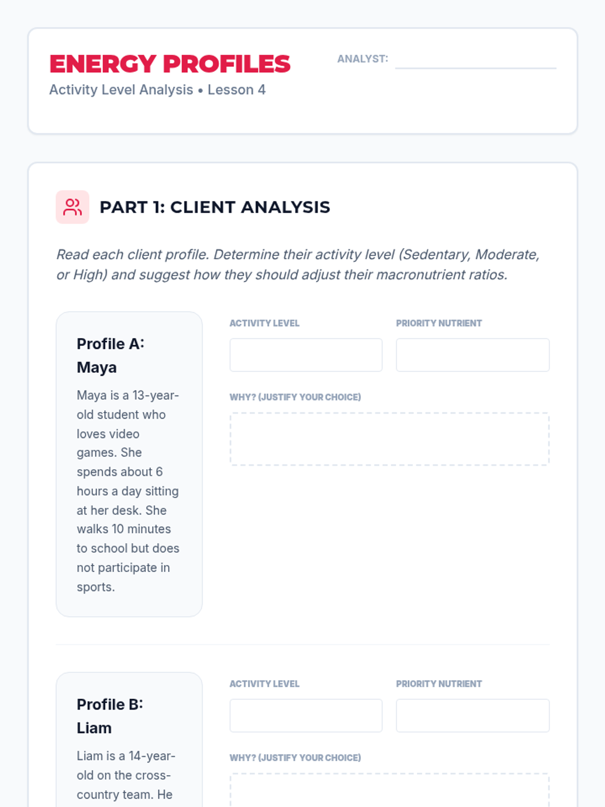 Students transition from understanding basic food groups to applying nutritional science in real-world scenarios. The unit covers macronutrients, portion control, label reading, and activity-based needs, culminating in a meal plan design project.