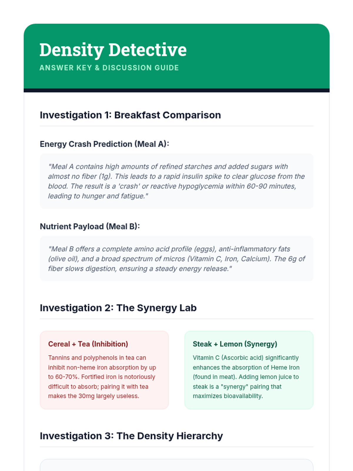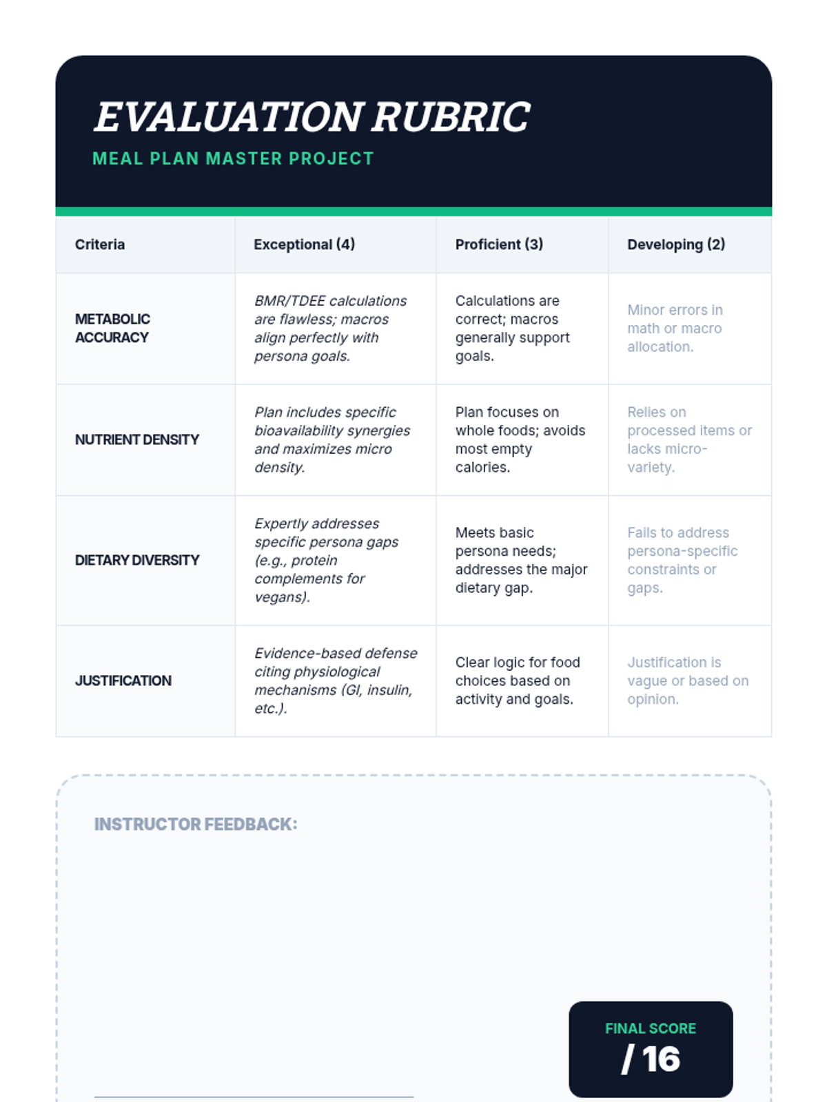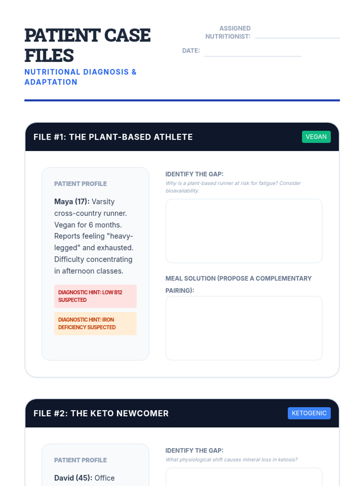 This advanced 11th-grade nutrition sequence explores the physiological requirements of the human body. Students move from basic food groups to complex metabolic calculations, nutrient density analysis, and the design of personalized meal plans for diverse dietary needs.