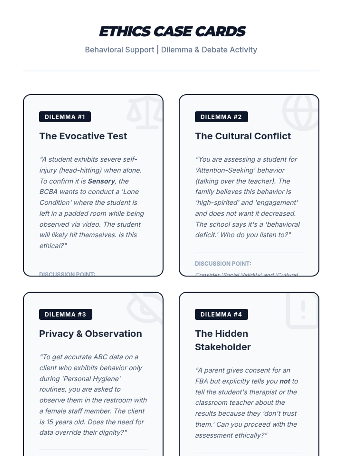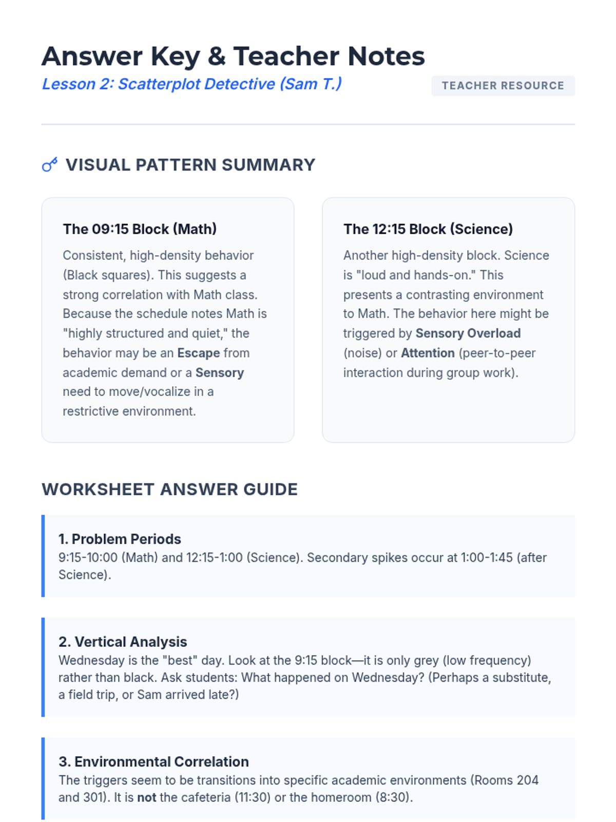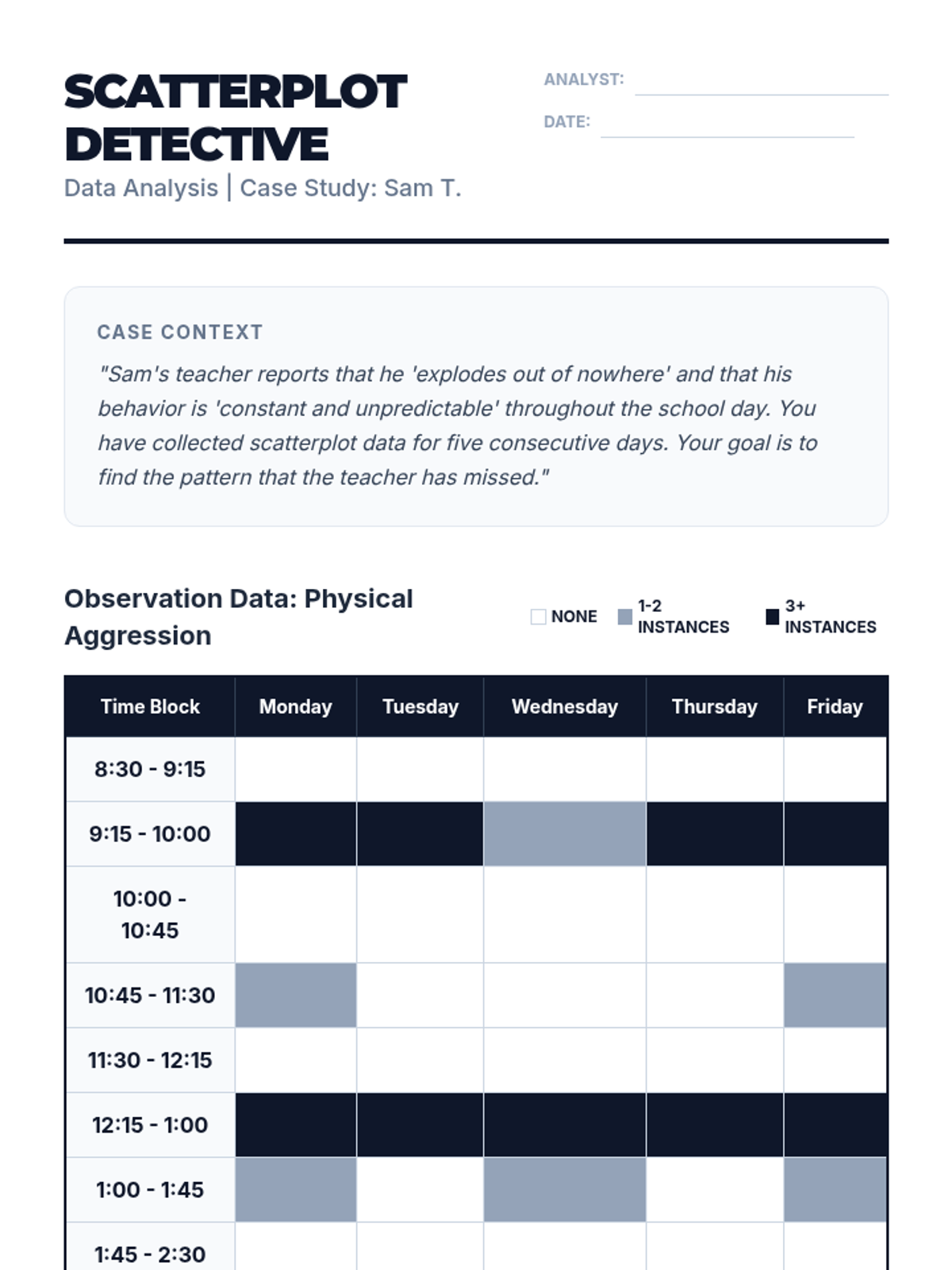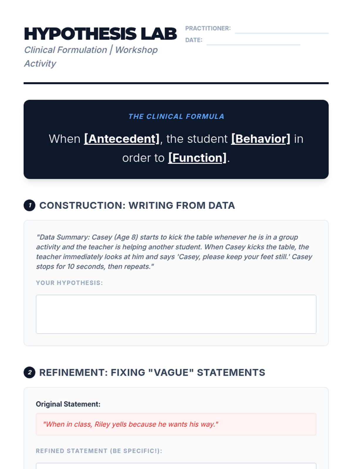 This sequence guides undergraduate students through the analytical phase of Behavioral Support, focusing on Functional Behavior Assessment (FBA). Students move from simple observation to pattern recognition, learning to triangulate data and formulate hypothesis statements that identify the function of behavior.
