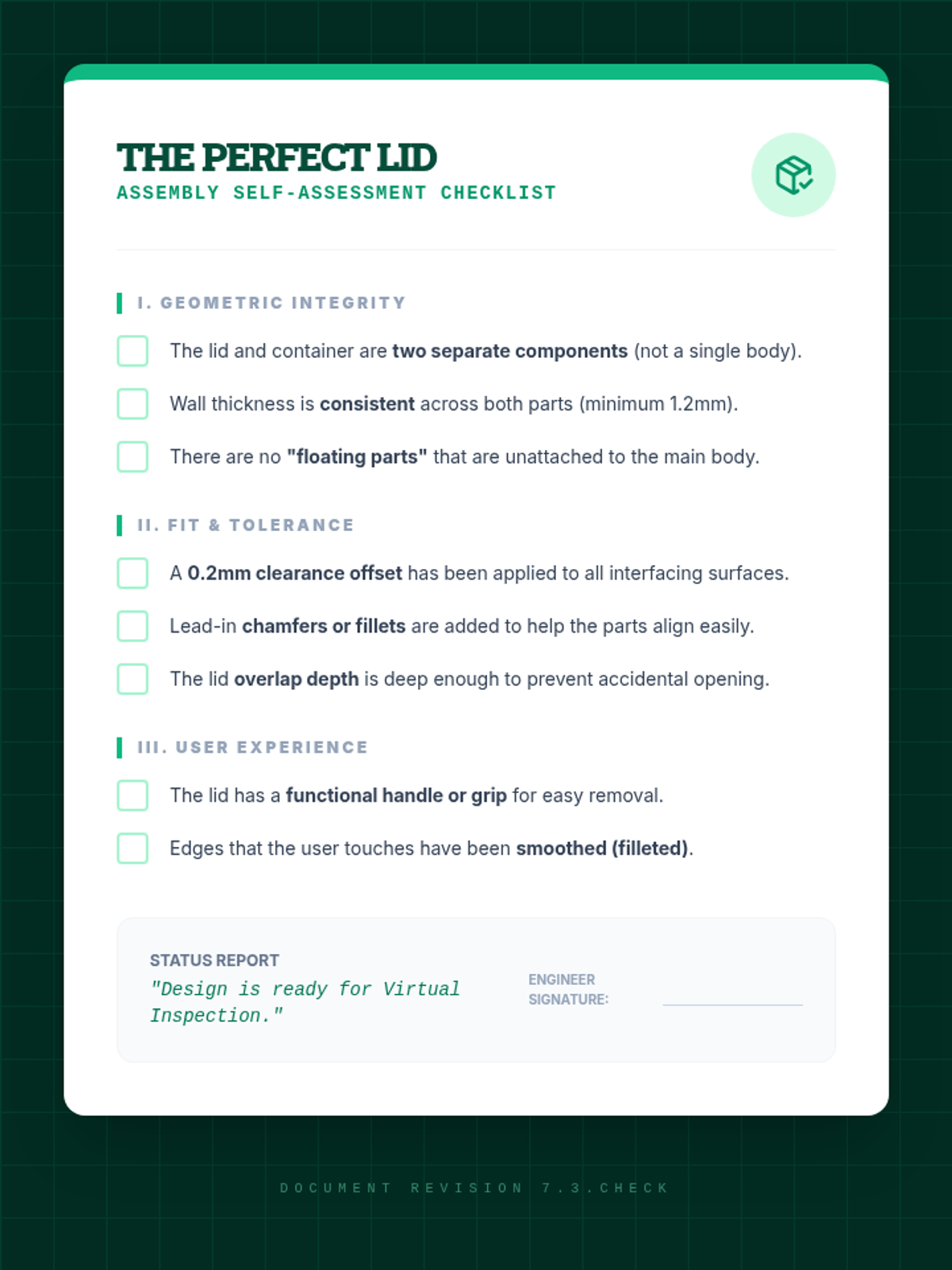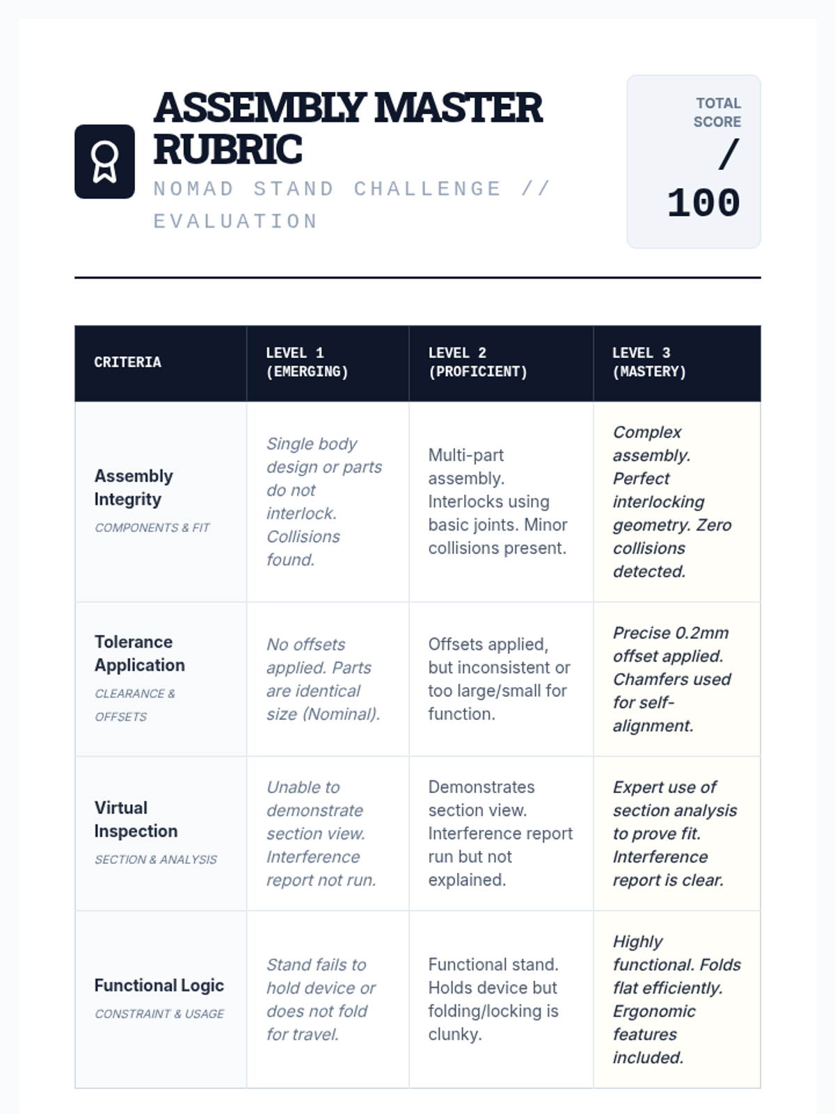 A comprehensive 7th-grade engineering sequence focused on CAD design, reverse engineering, and the physical constraints of manufacturing like tolerance and fit. Students move from analyzing existing objects to designing a functional, multi-part assembly.