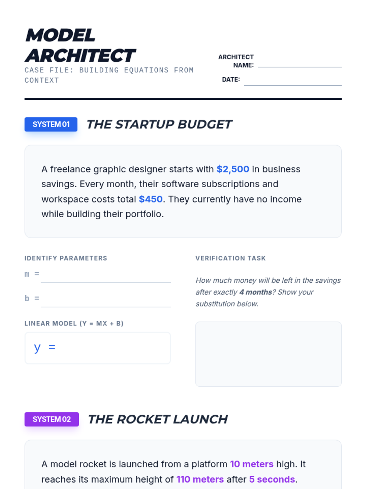 Students assume the role of data analysts to interpret complex real-world datasets related to economics, population dynamics, and environmental science. They identify function families, construct algebraic models using regression, evaluate 'goodness of fit' via residuals, and apply their models for predictions while critically analyzing domain limitations.