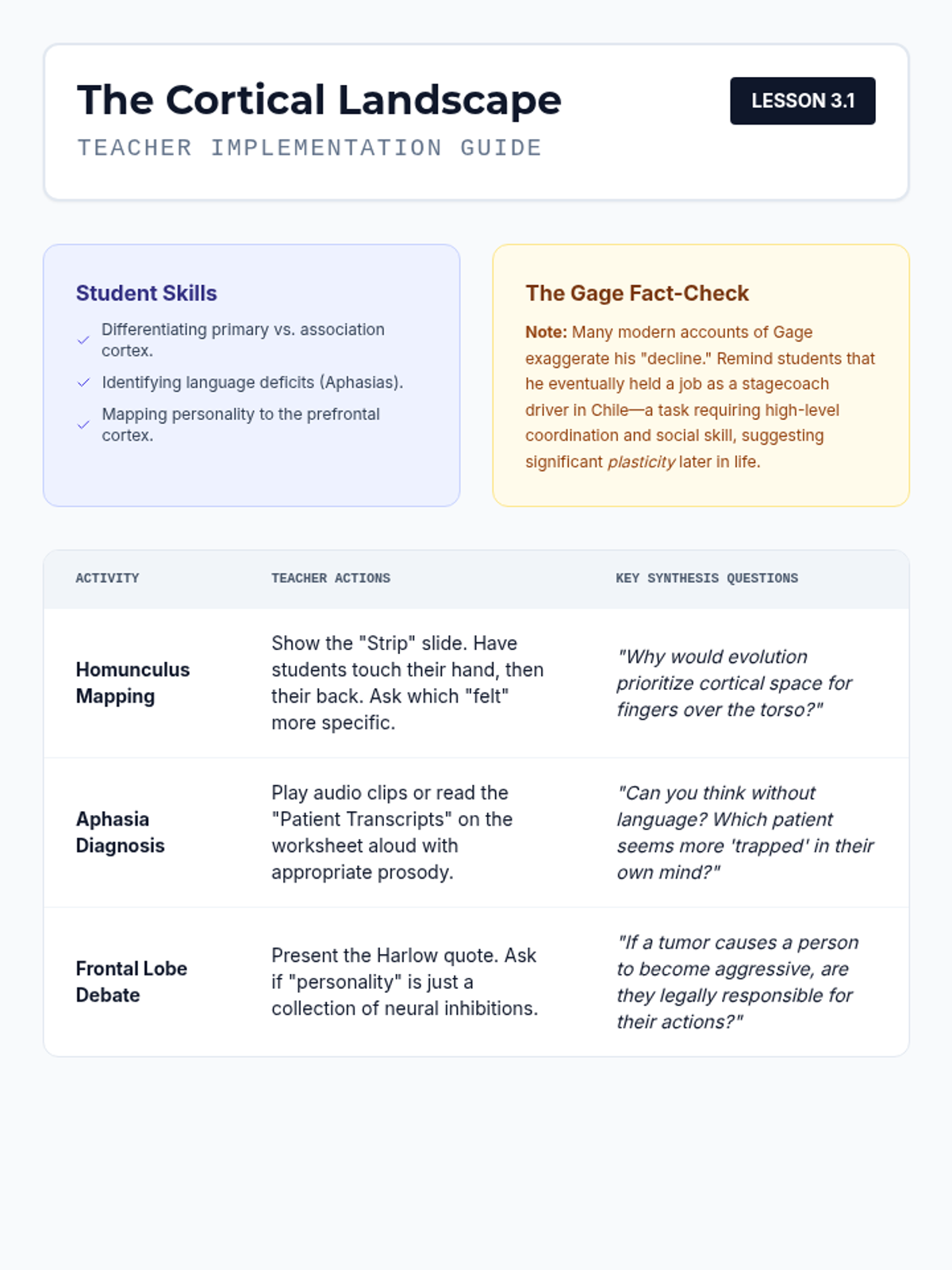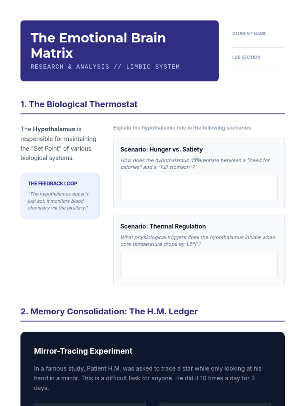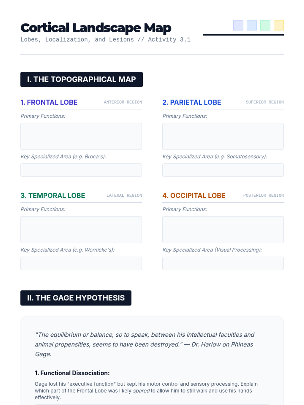 This undergraduate psychology sequence explores the structural organization of the human brain, mapping specific behaviors to distinct regions from the primitive hindbrain to the complex cerebral cortex. Students analyze clinical cases like Phineas Gage and H.M. to understand localization of function and neuroplasticity.
