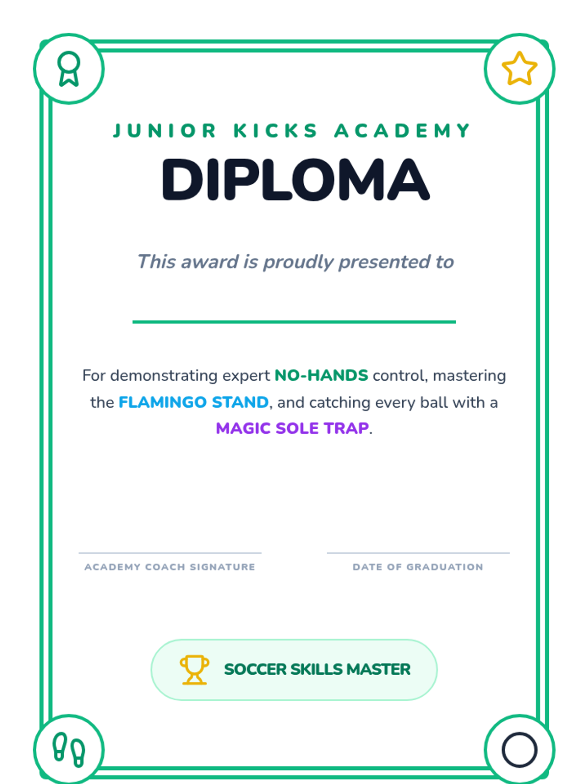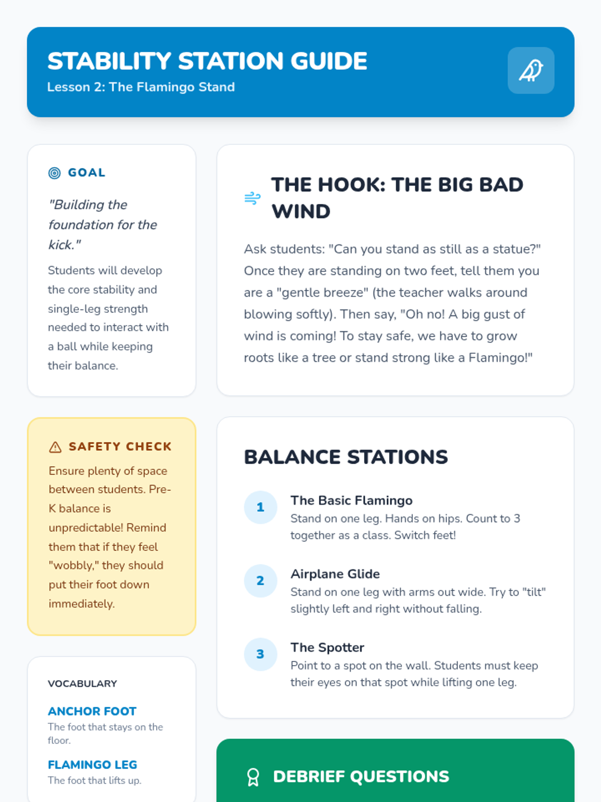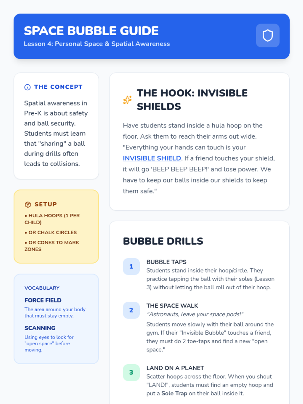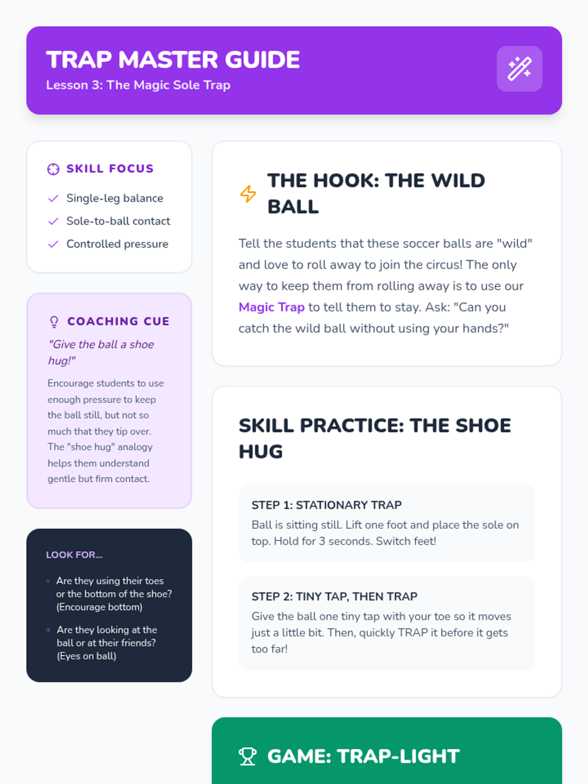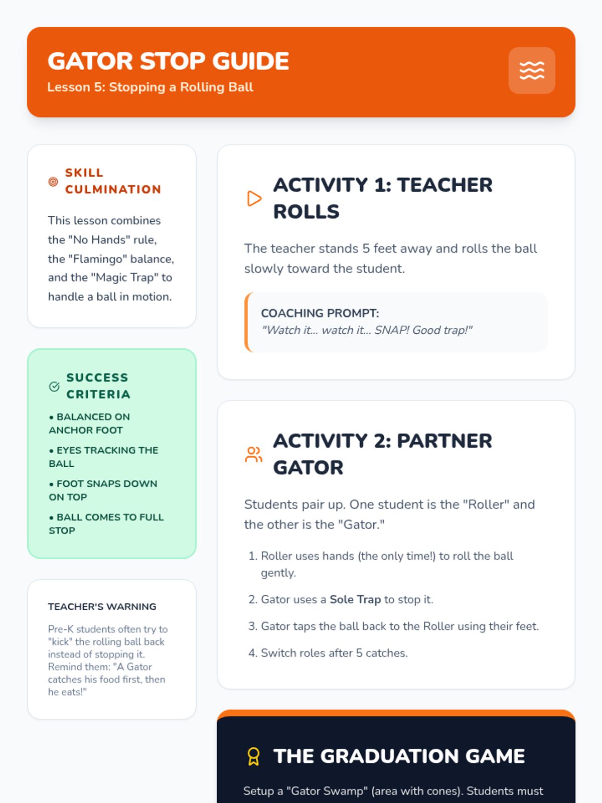 This introductory sequence focuses on the absolute basics of ball manipulation using feet only for Pre-K students. Children explore balance and coordination while learning the fundamental rule of soccer: no hands allowed, progressing from stationary control to stopping a moving ball.