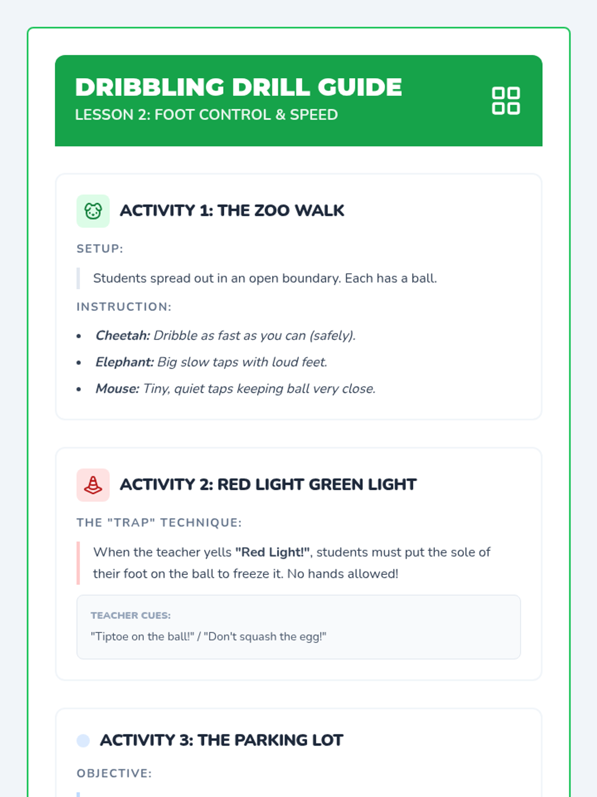 A comprehensive physical education sequence for Kindergarten students focusing on lower-body and implement manipulation. Students develop kicking, dribbling, and striking skills through play-based activities and structured skill-building drills.
