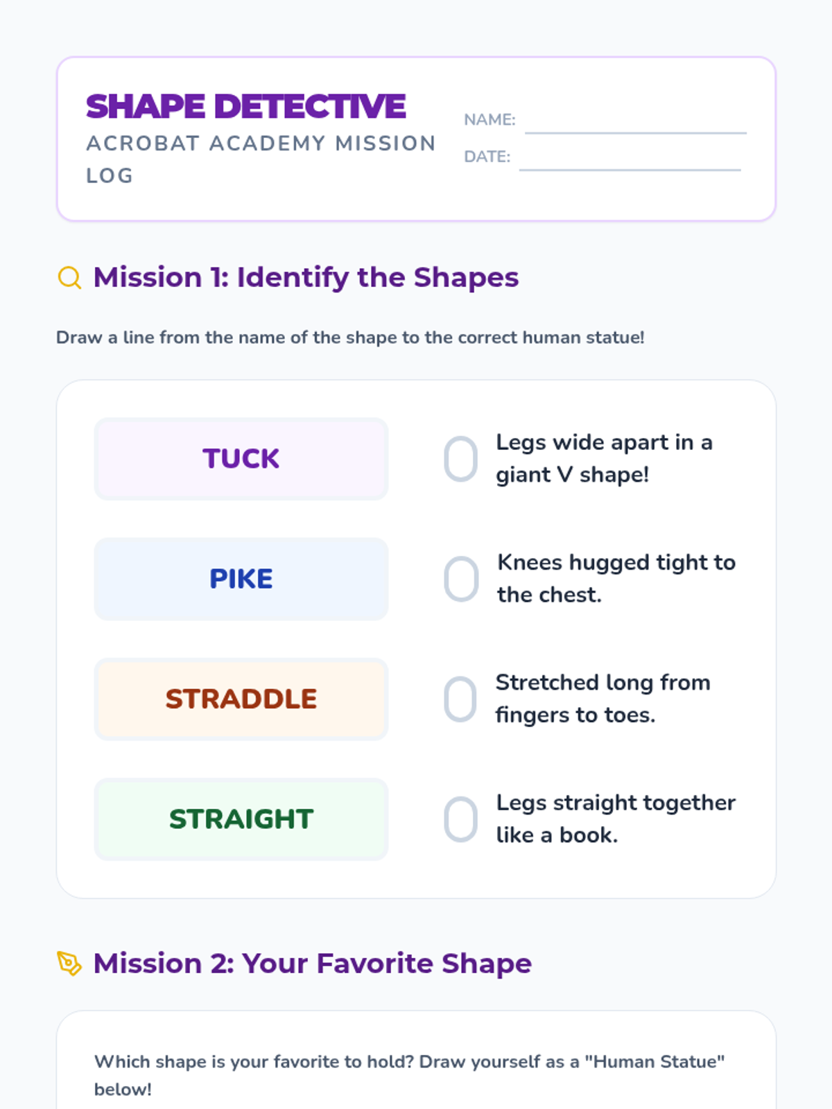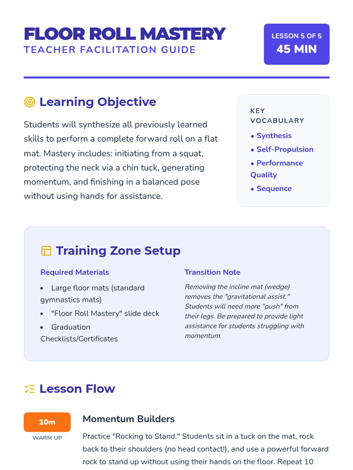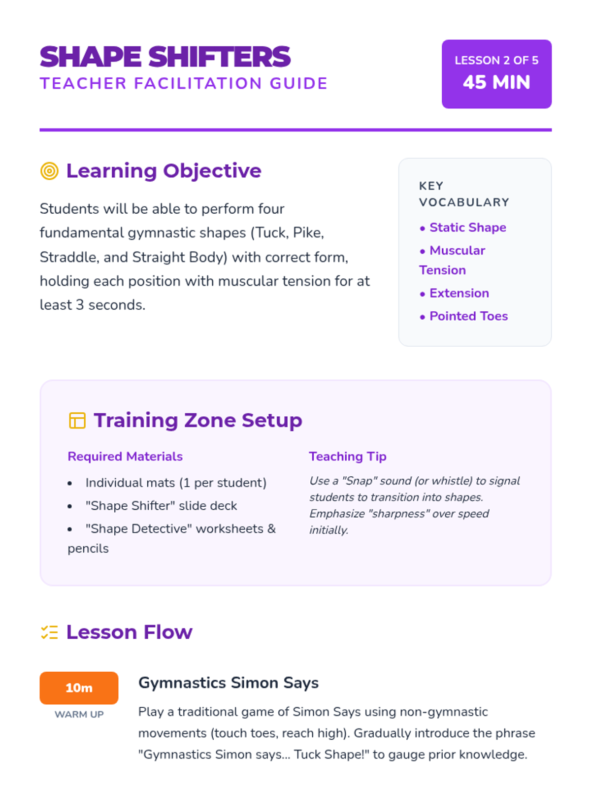 A foundational gymnastics sequence for 2nd graders focusing on safety protocols, body shapes, and progressive rolling techniques. Students learn the 'motorcycle landing' for impact absorption, master static shapes (tuck, pike, straddle), and develop safe forward rotation skills.