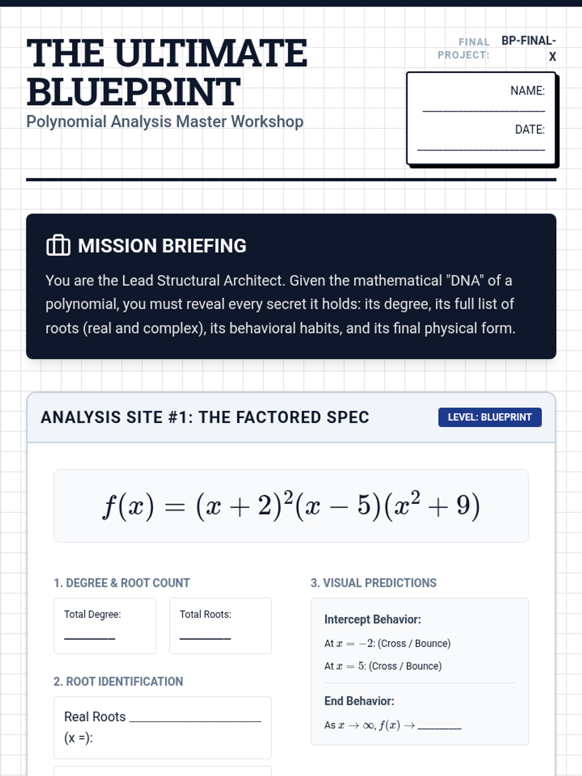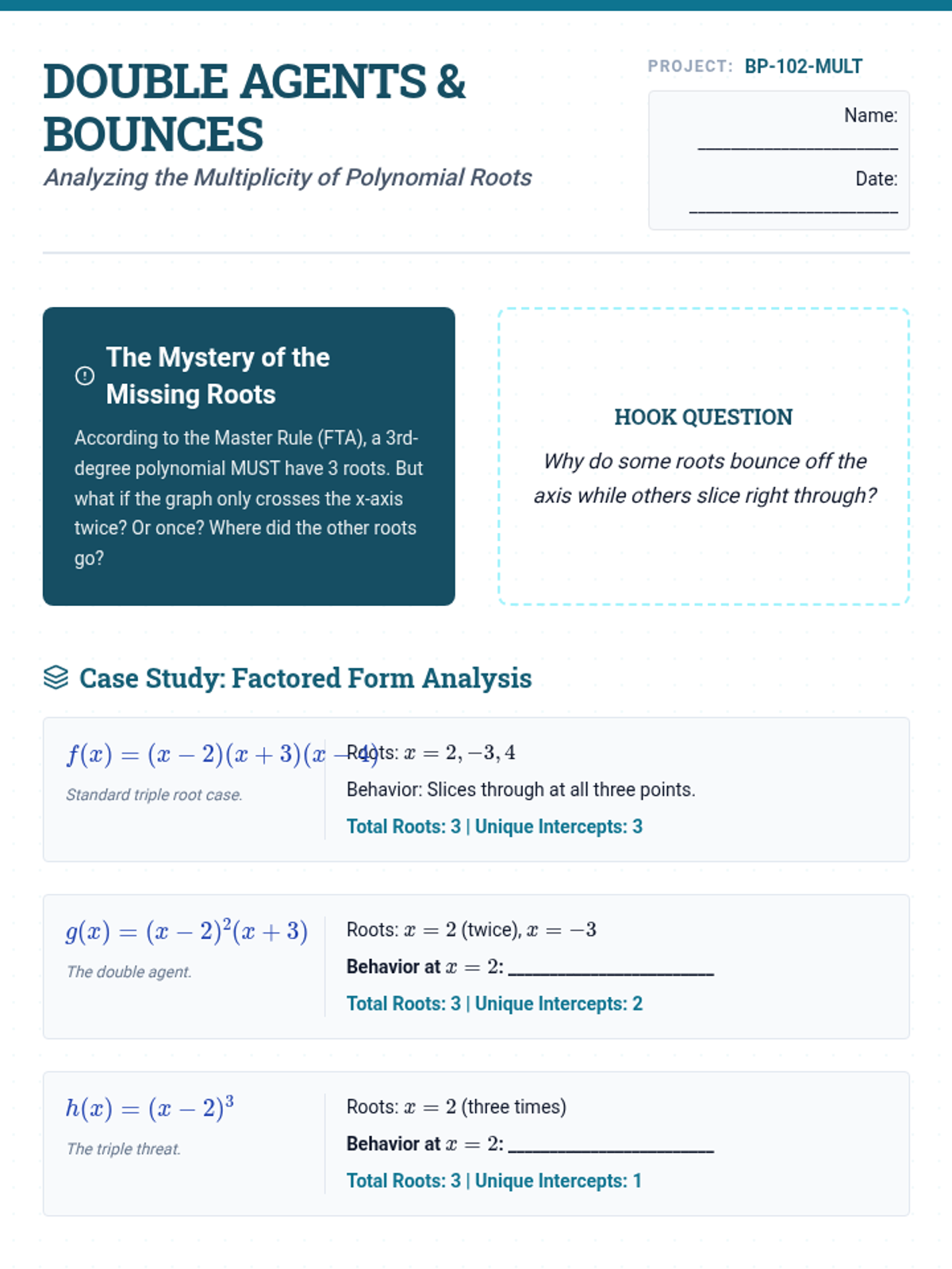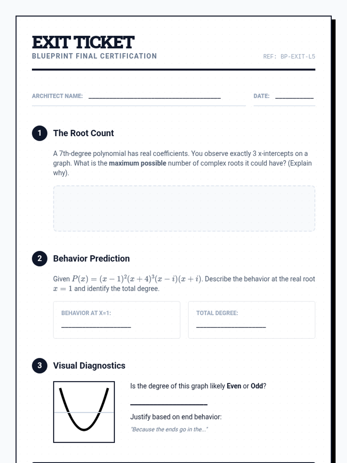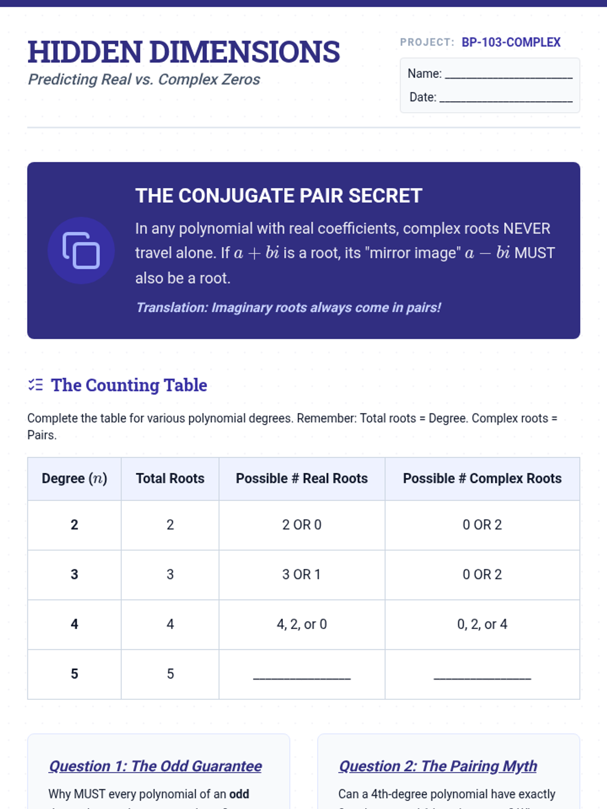 This sequence guides 11th-grade students through the Fundamental Theorem of Algebra, exploring the relationship between polynomial degree and the number/type of roots. Students investigate multiplicity, real versus complex zeros, and the visual representation of hidden roots through graphing and analysis.