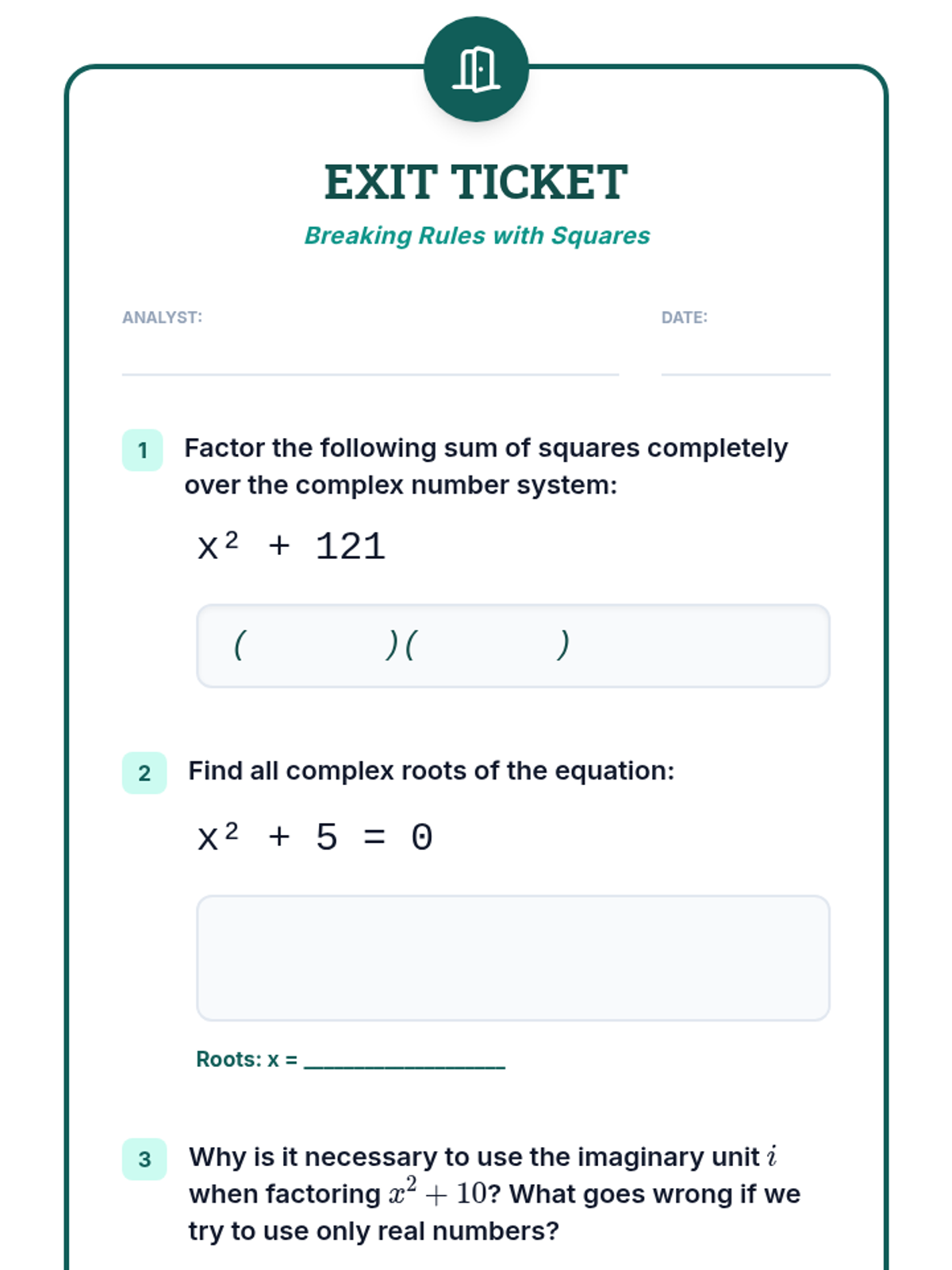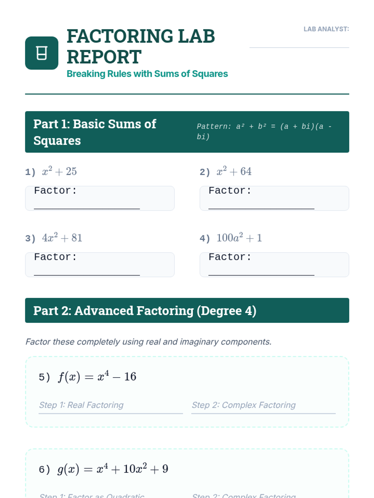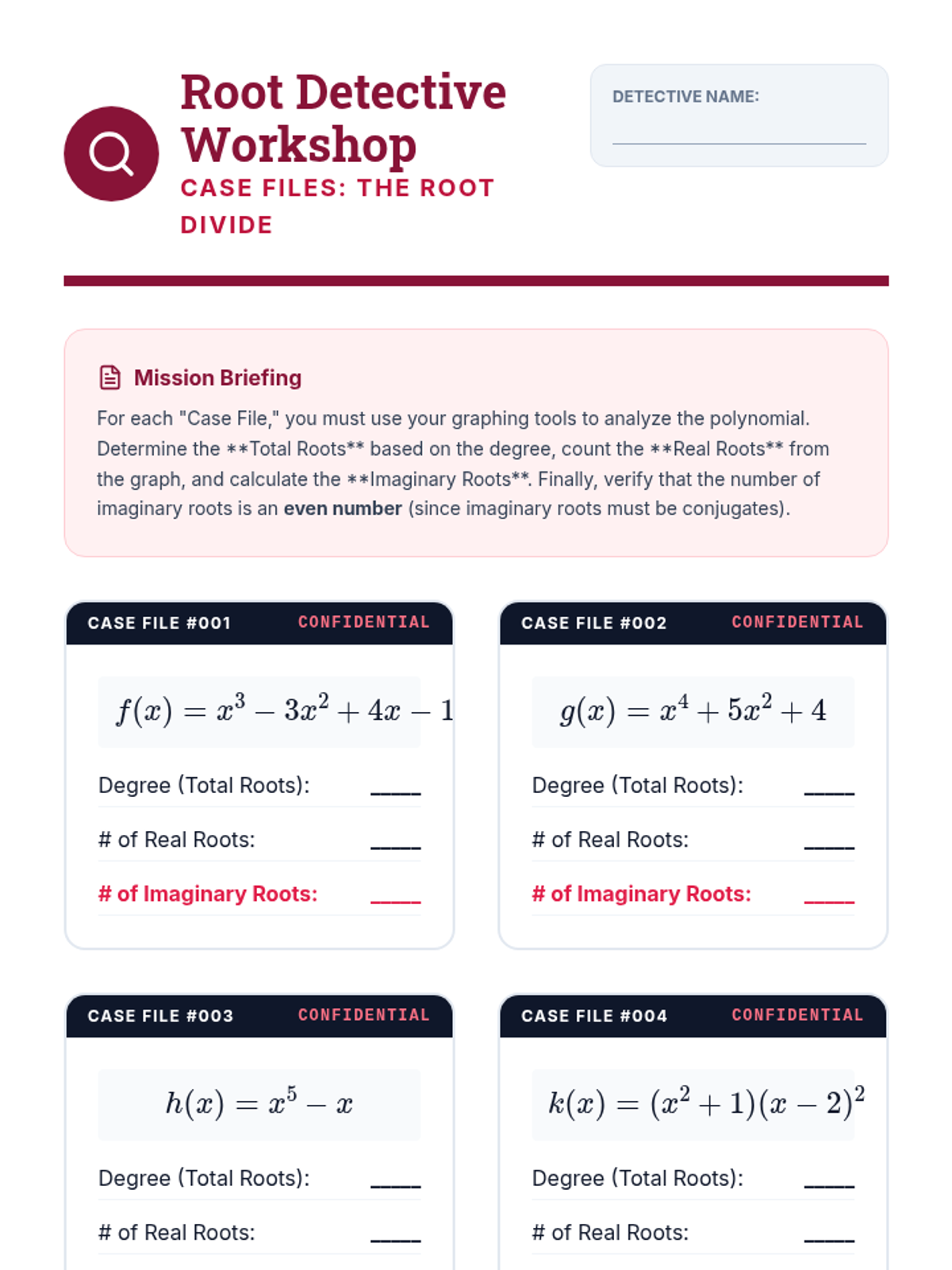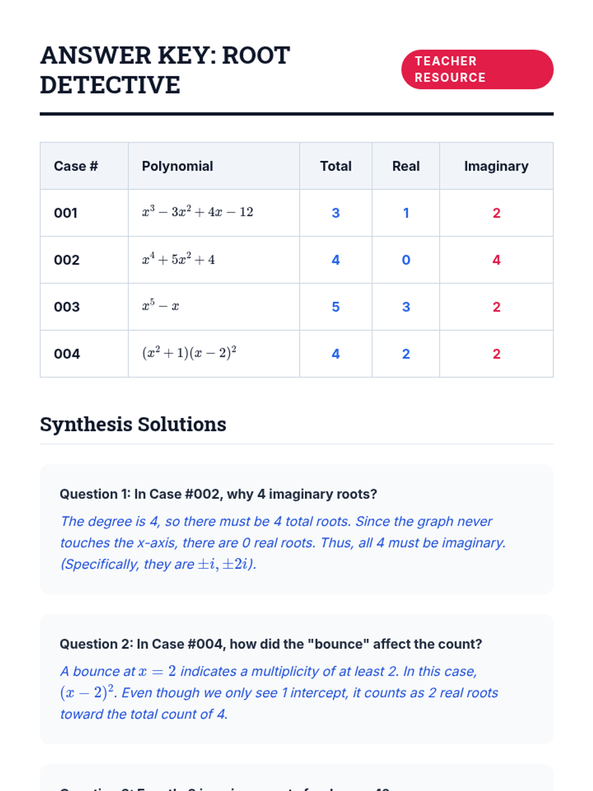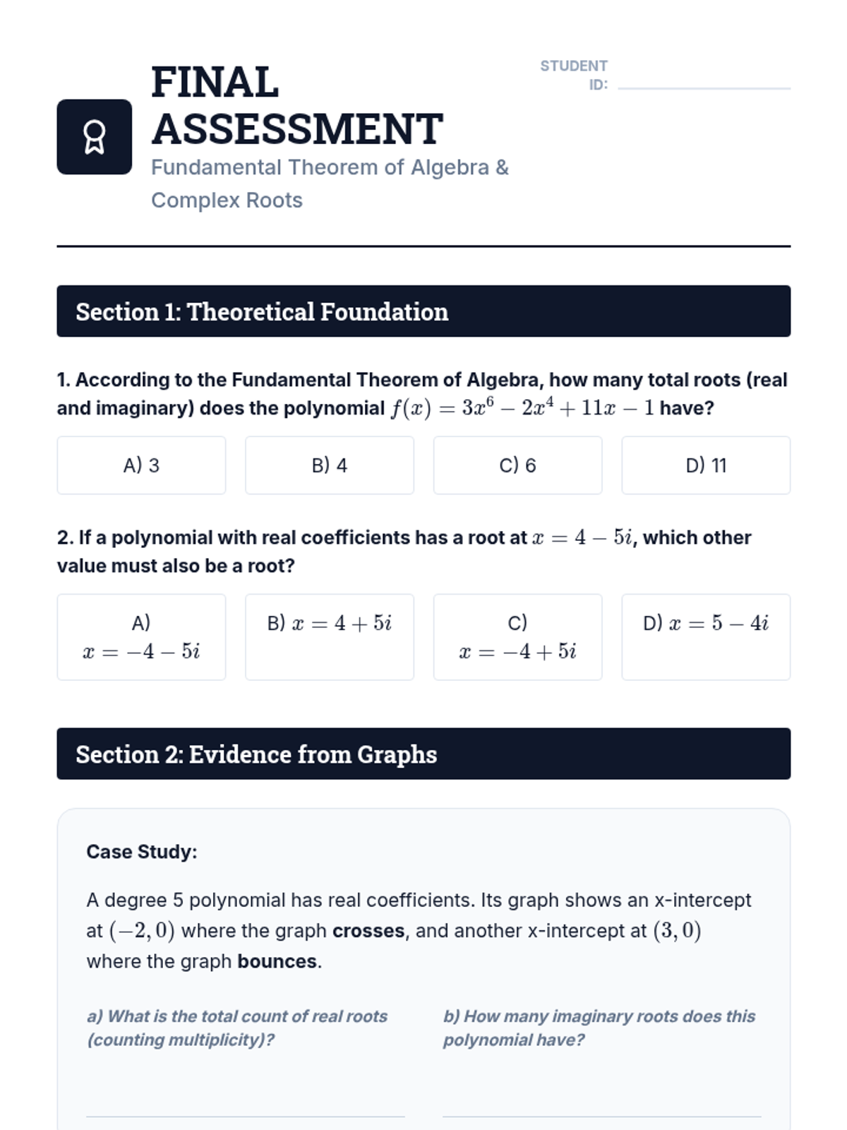 A high school math sequence exploring the Fundamental Theorem of Algebra through graphical analysis and algebraic proofs, helping students understand the connection between polynomial degree and complex roots.