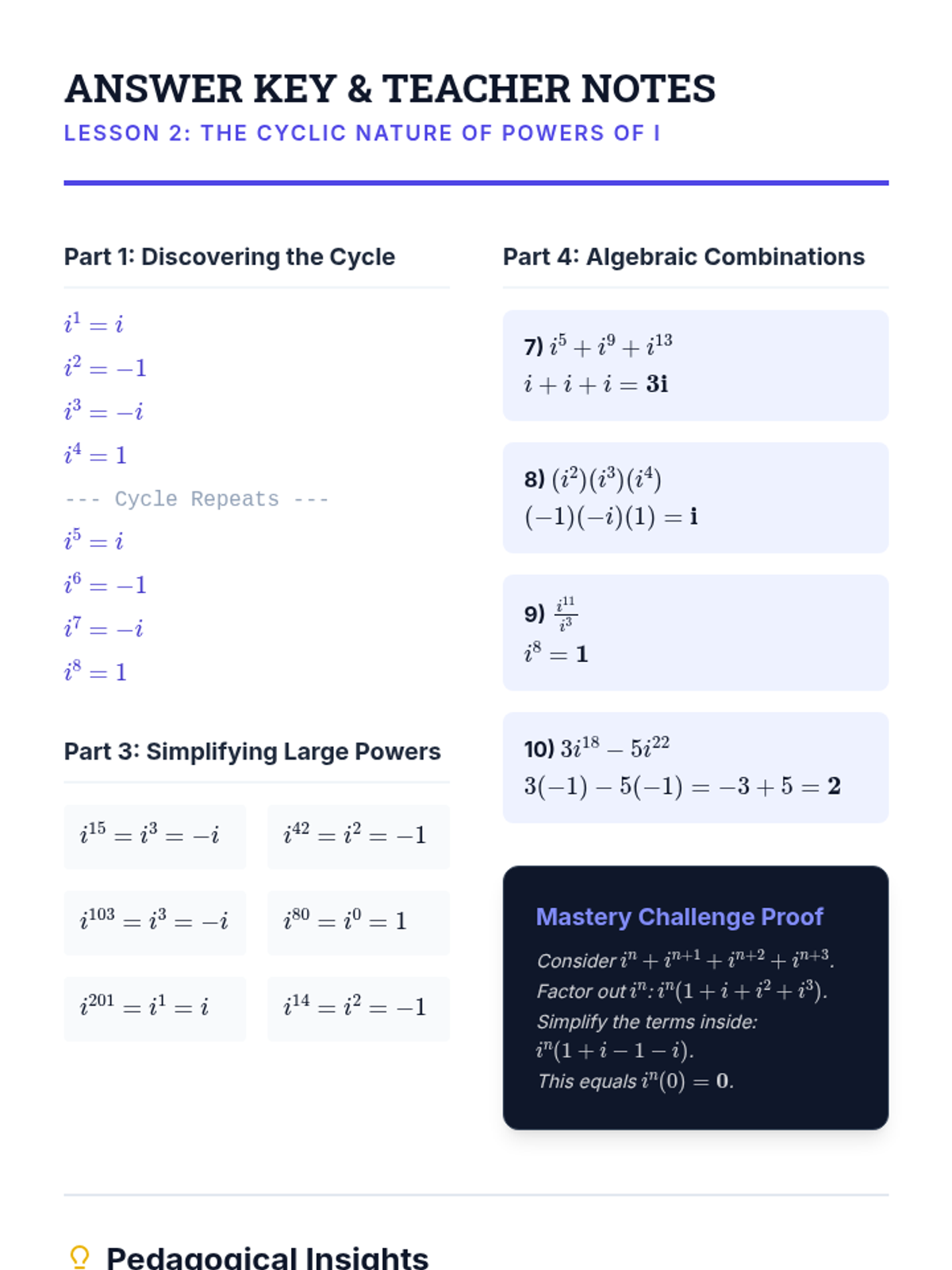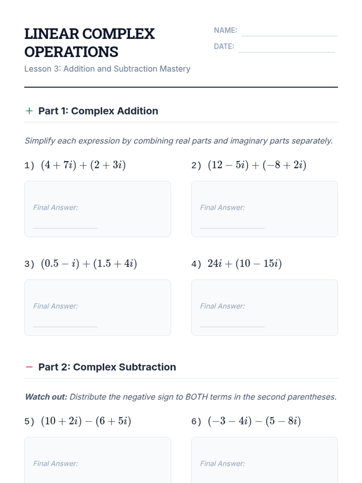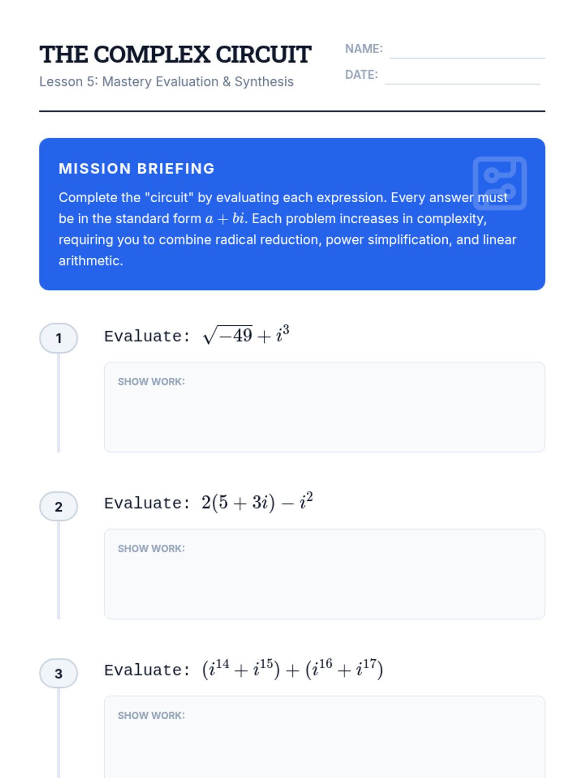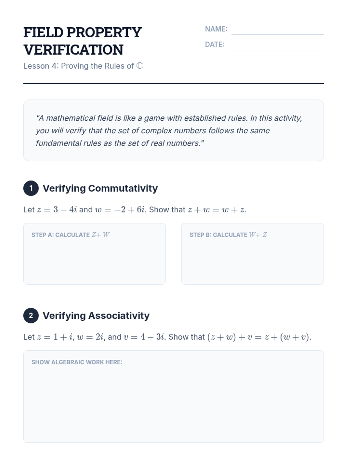 This sequence introduces undergraduate students to the set of complex numbers, covering the imaginary unit, powers of i, and linear arithmetic operations within the complex field. Students will explore the historical necessity of complex numbers and verify their properties as a mathematical field.