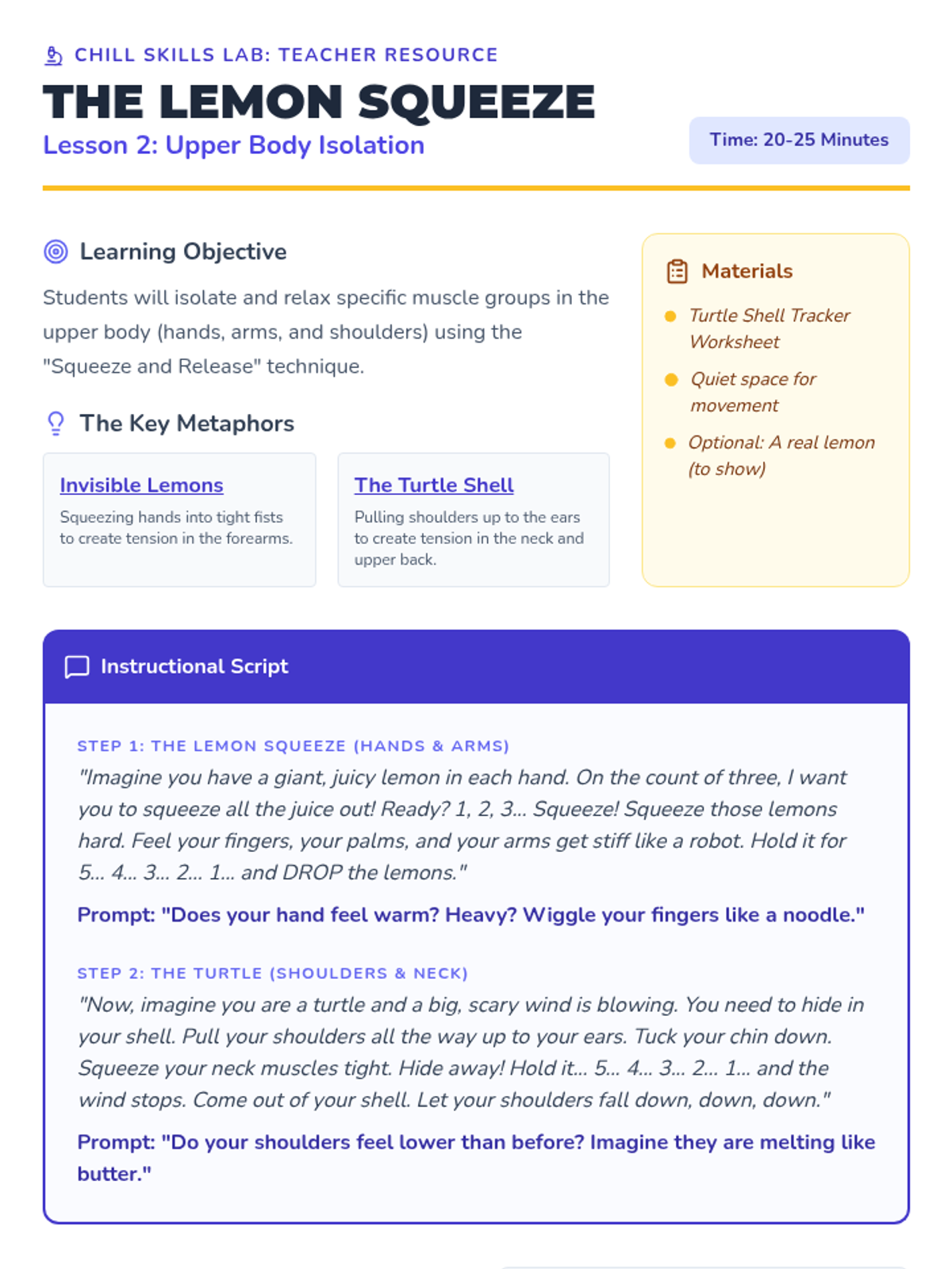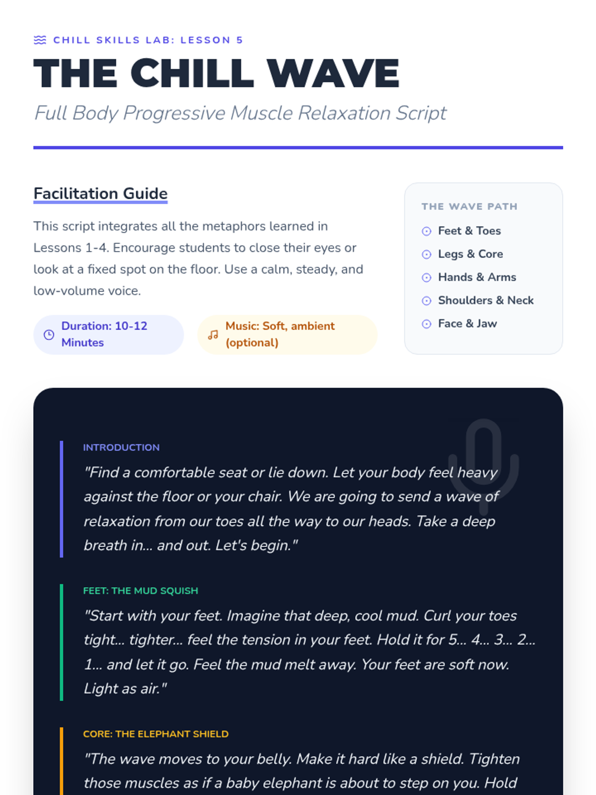 A 5-lesson sequence for 3rd graders to master Progressive Muscle Relaxation (PMR), moving from basic tension awareness to a full-body relaxation scan.
