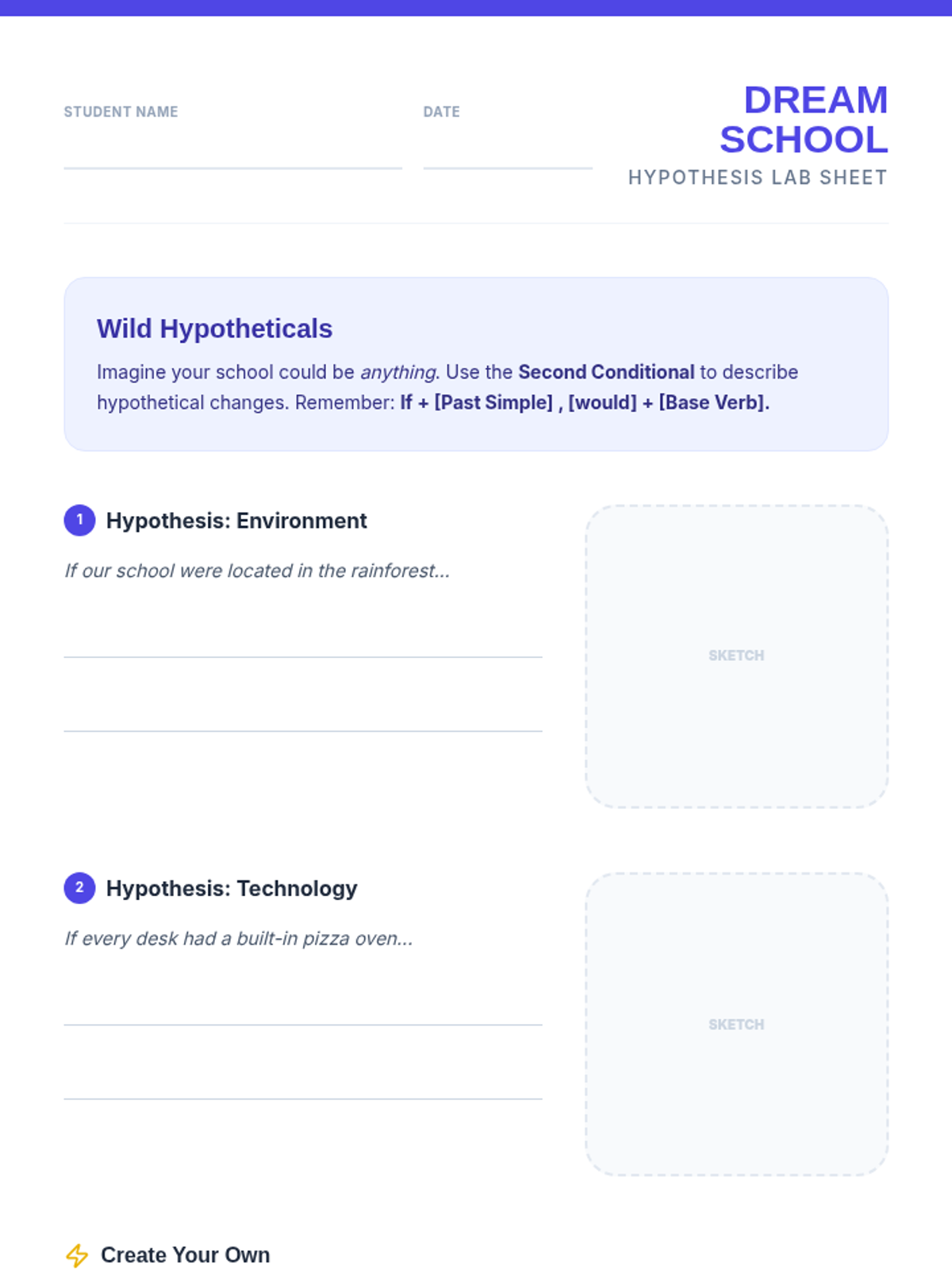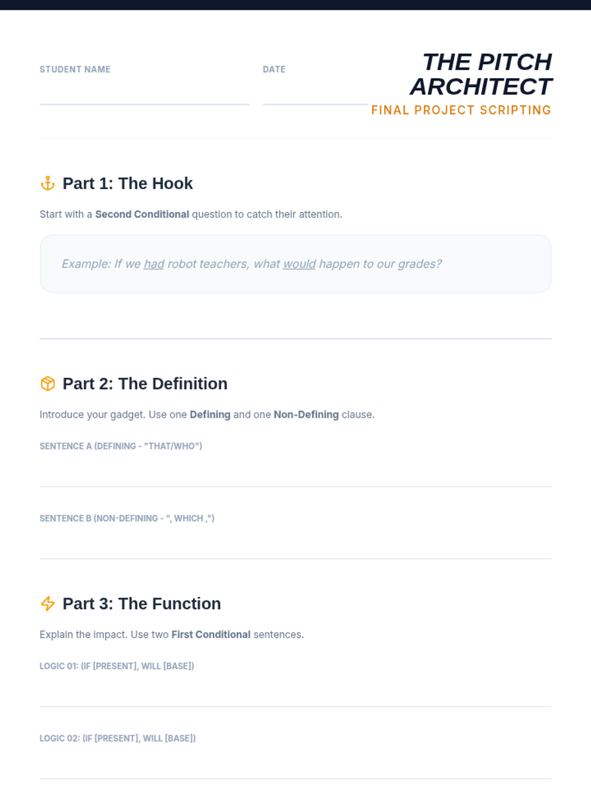 A grammar-focused ESL sequence where students use relative clauses and conditionals to design and pitch inventions for a 'School of the Future.' Students move from defining objects to predicting outcomes and hypothesizing wild improvements.