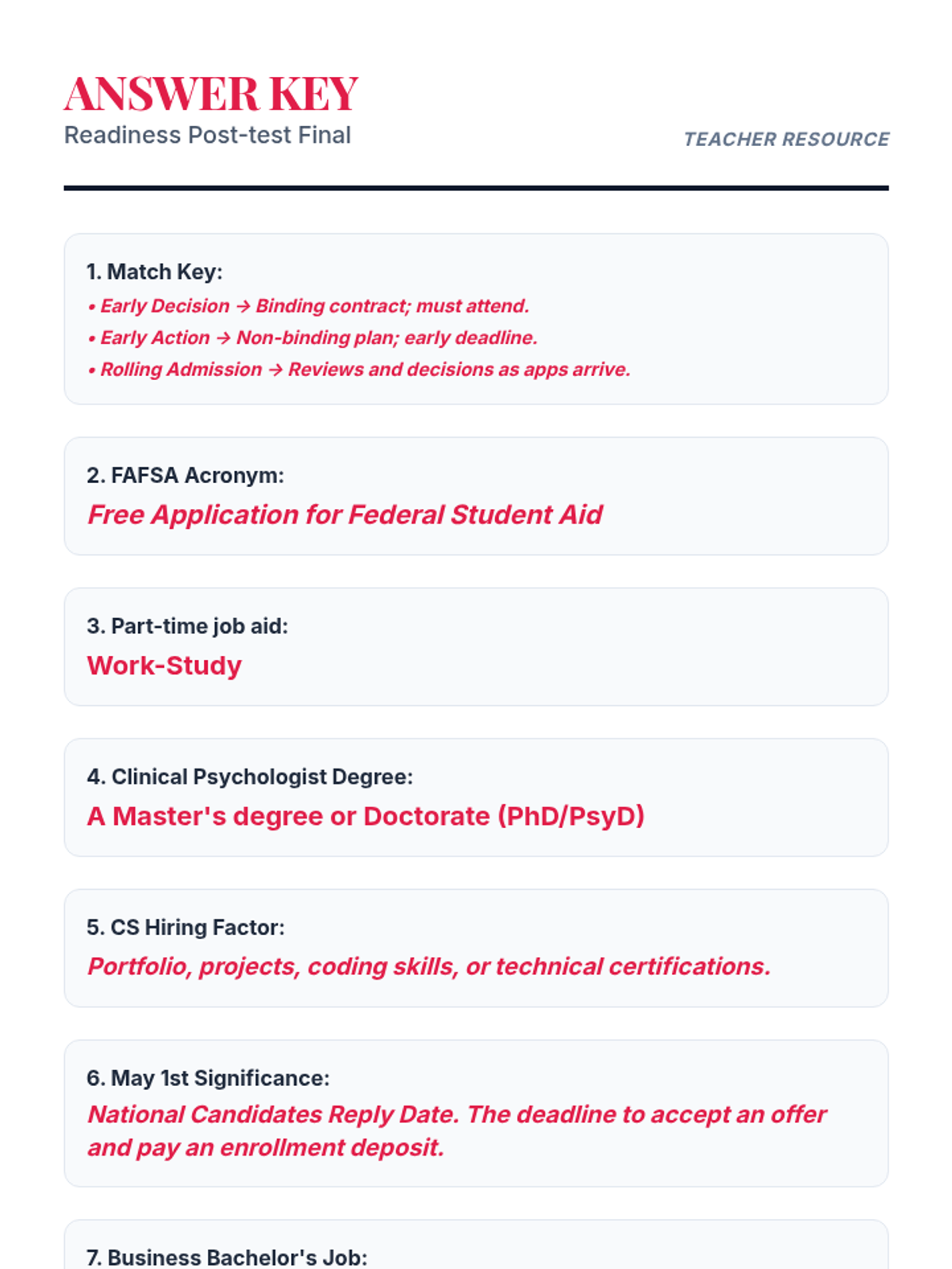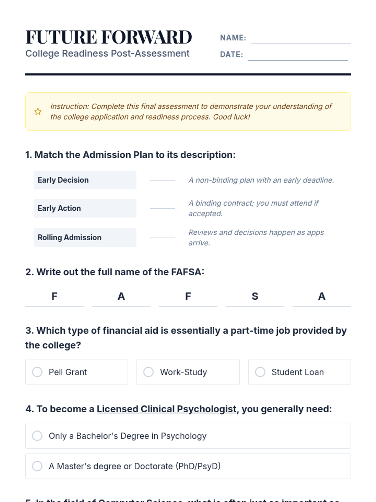 A comprehensive 7-week curriculum designed to prepare high school students for the college transition, covering admission strategies, financial aid, and major-to-career pathways.
