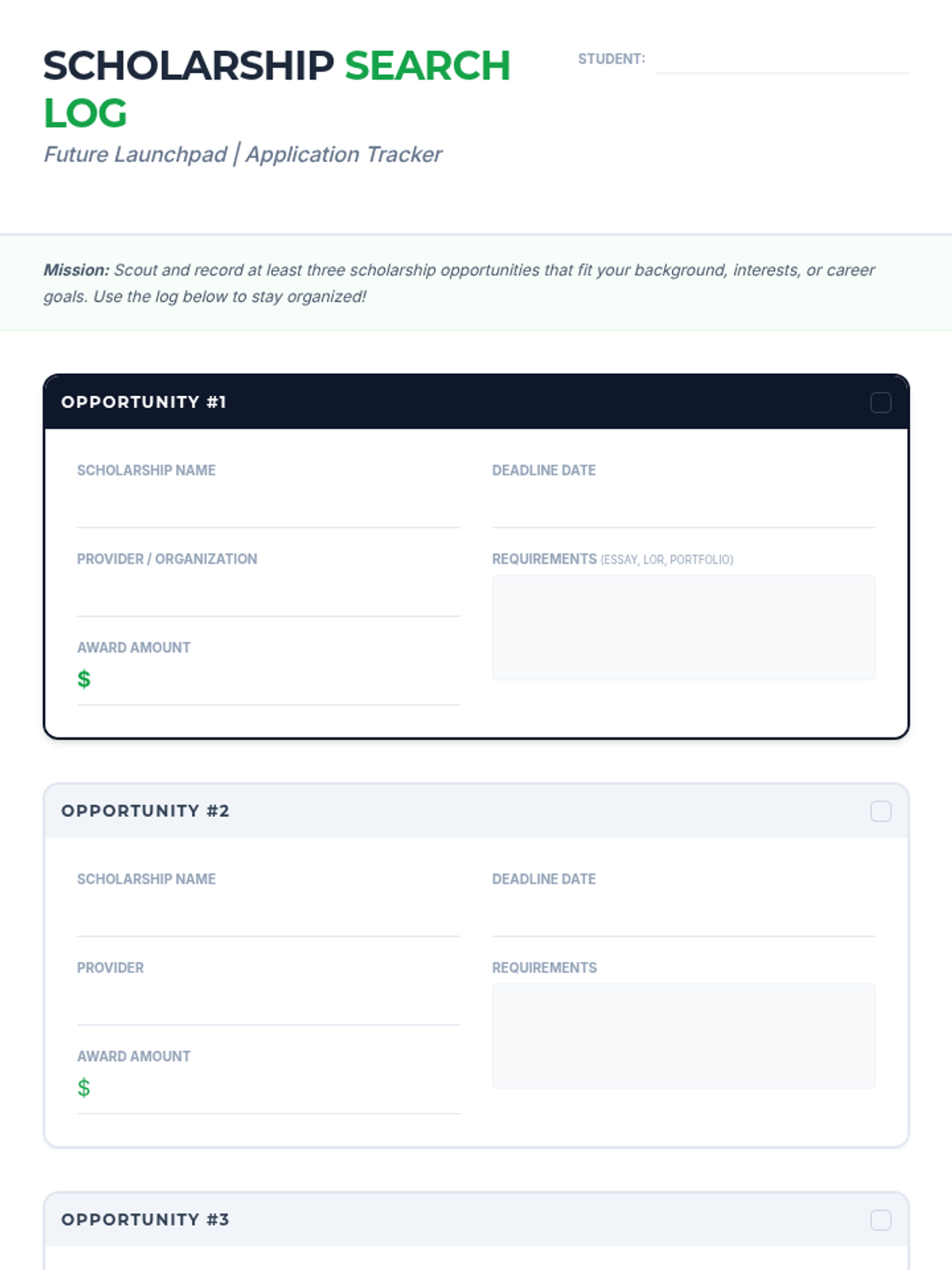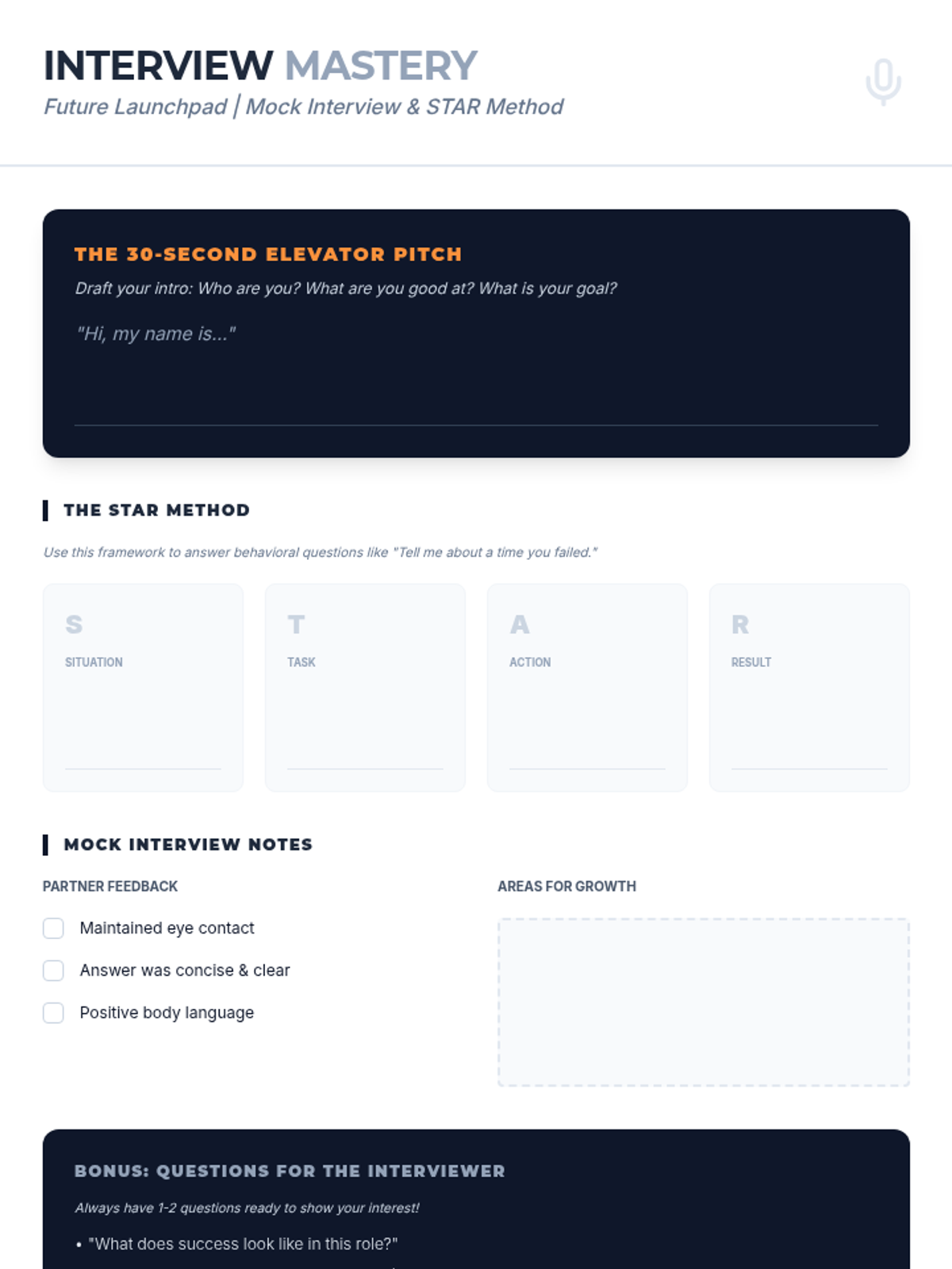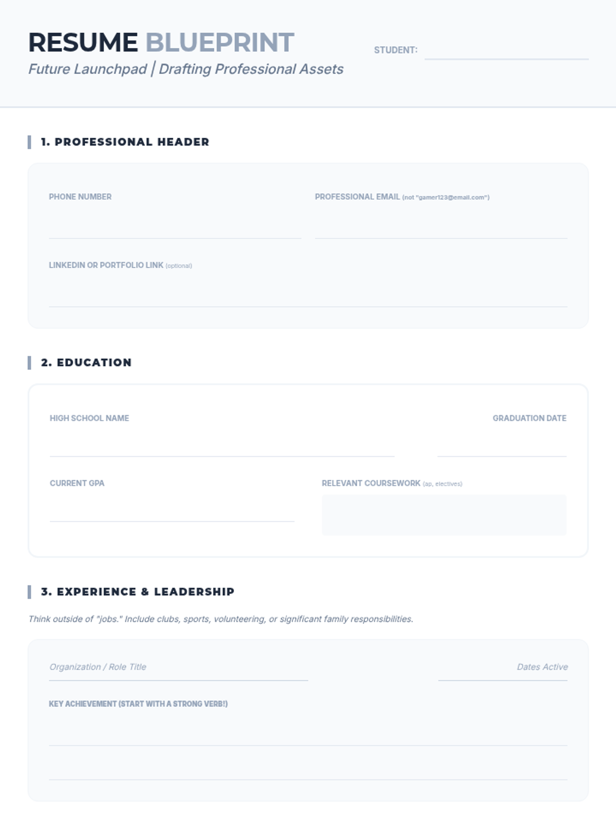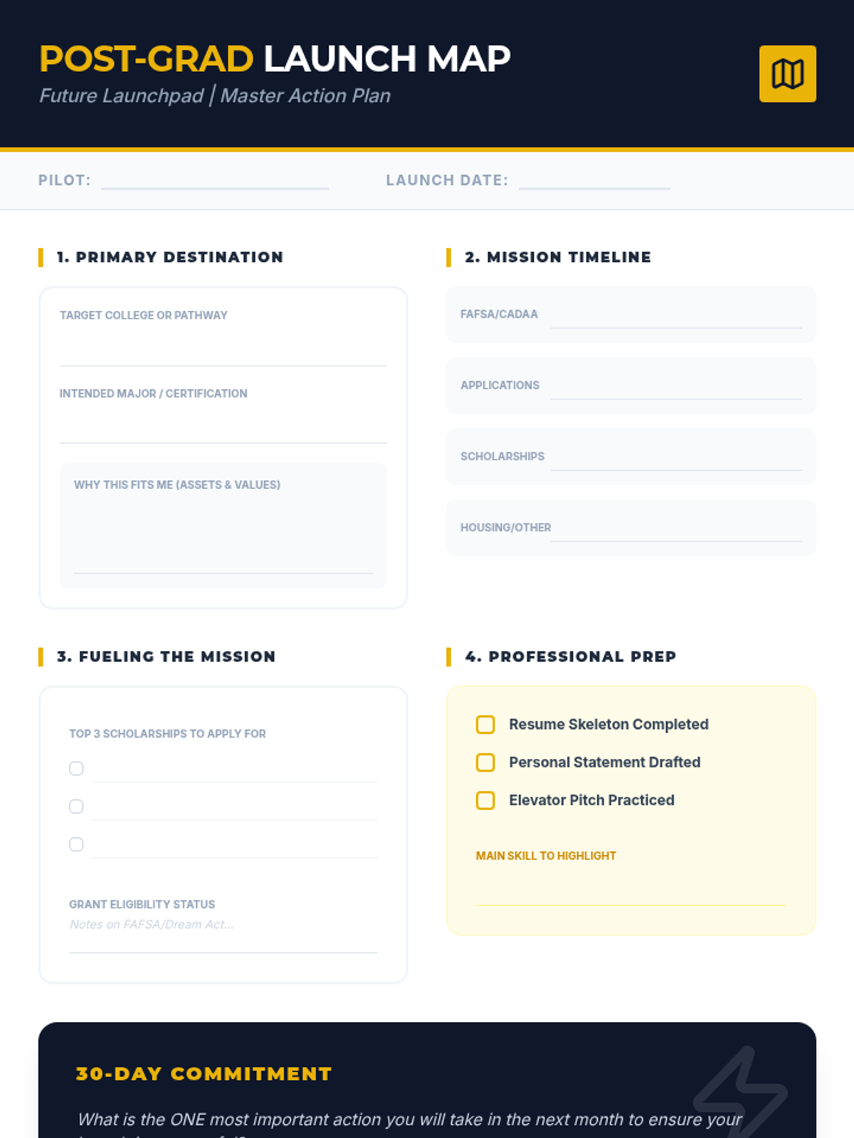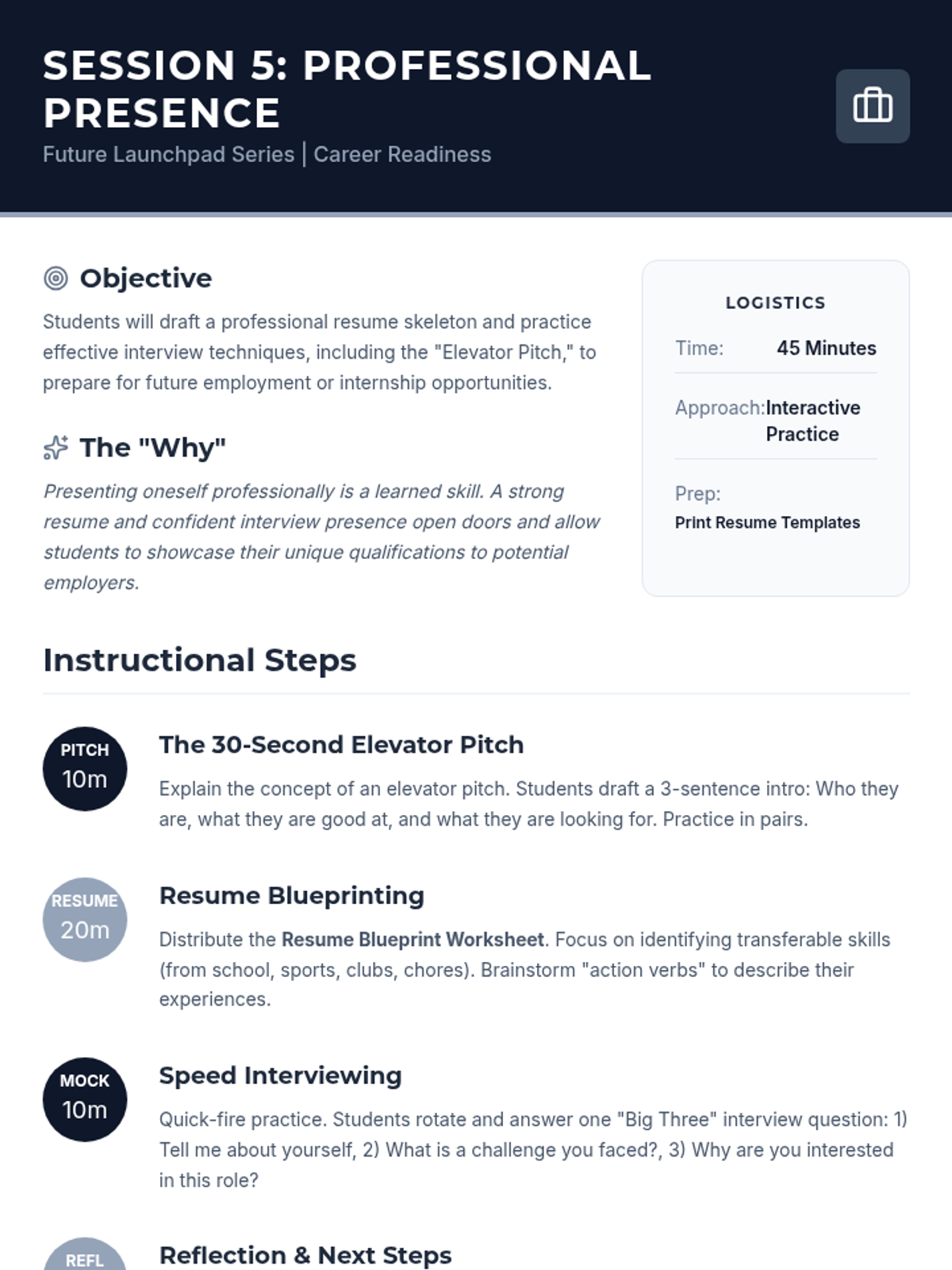 A career-readiness sequence designed for older students and undergraduates to identify their current skills, potential growth areas, and personality types using the Ikigai and Quadrant of Success models. Students move from auditing their time to creating a strategic roadmap for professional development.