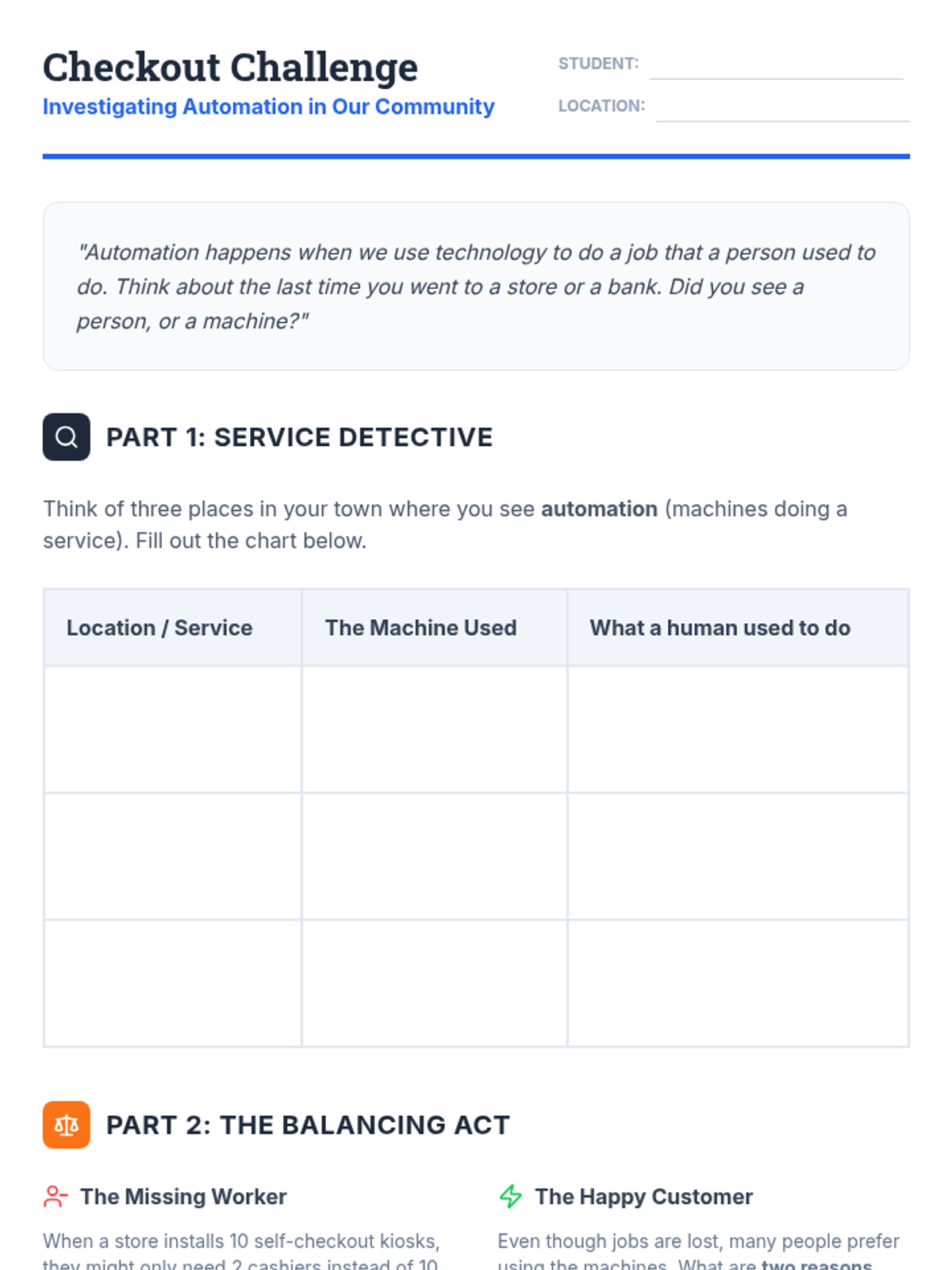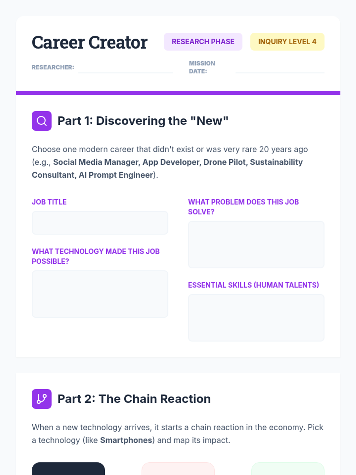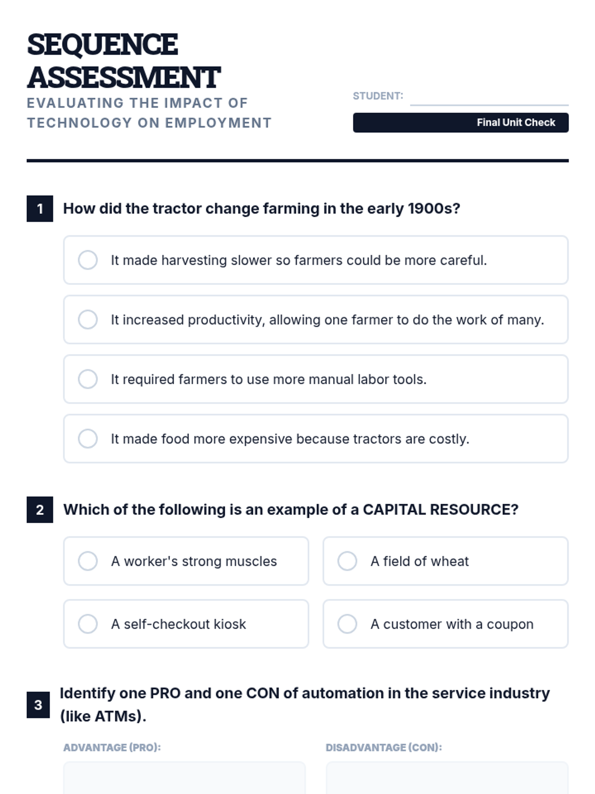 This sequence explores how technology has historically and currently transformed the workplace, focusing on the shift from manual labor to automation and digital environments. Students evaluate the economic impacts of these changes and predict future career trends.