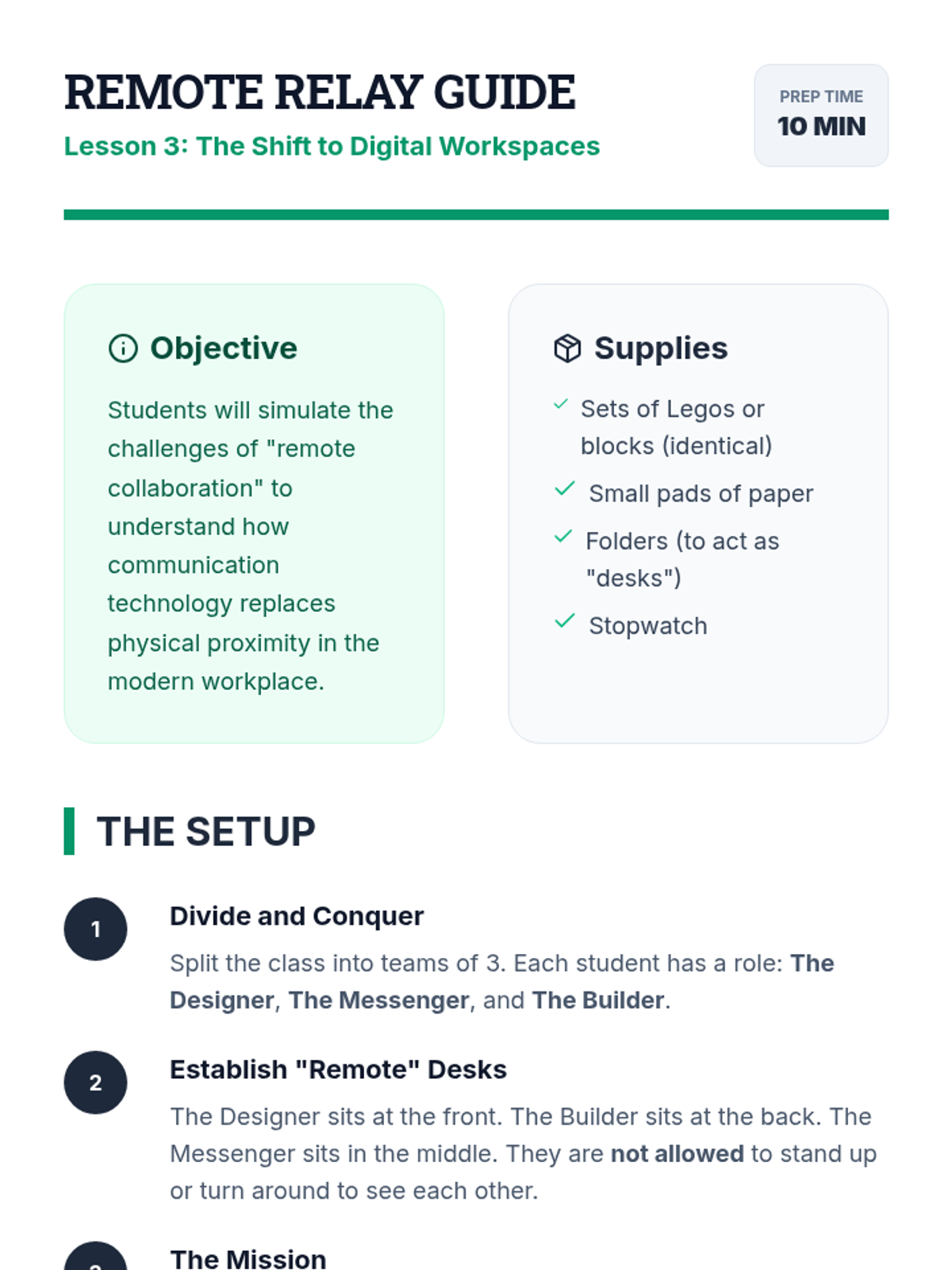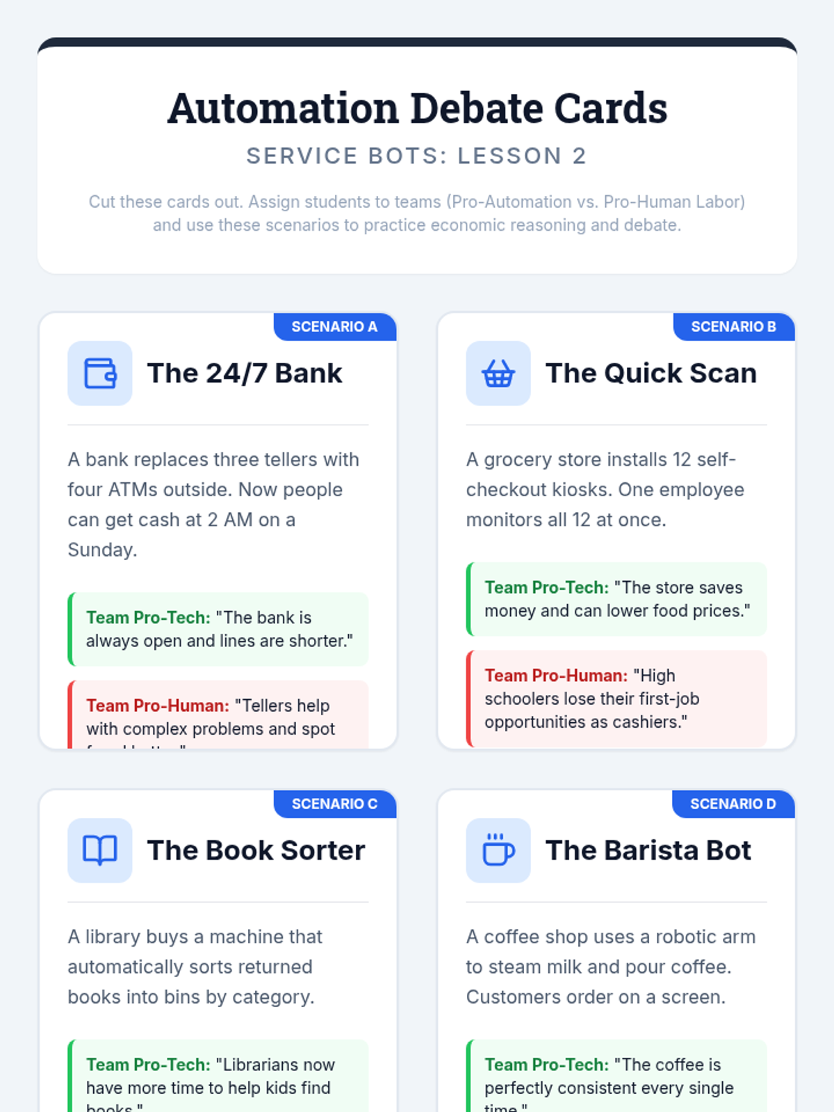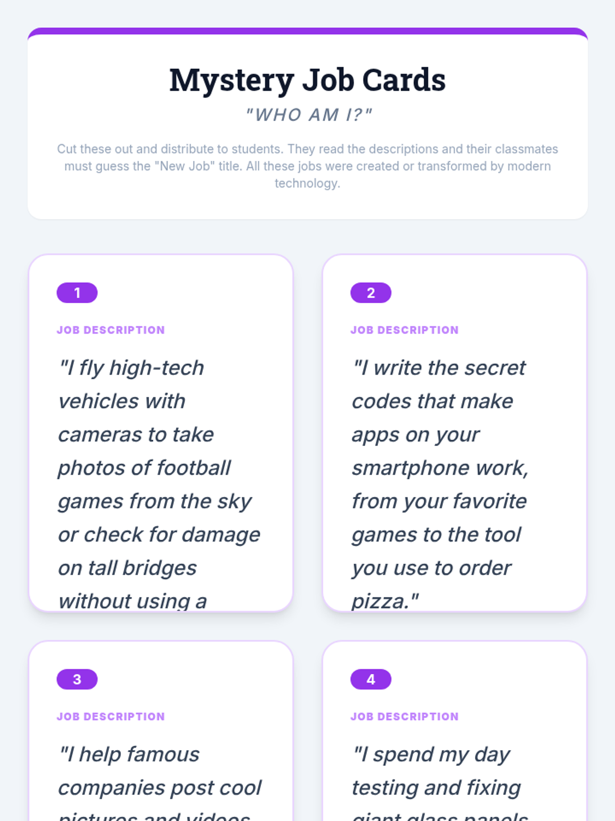 This sequence explores how technology has historically and currently transformed the workplace, focusing on the shift from manual labor to automation and digital environments. Students evaluate the economic impacts of these changes and predict future career trends.